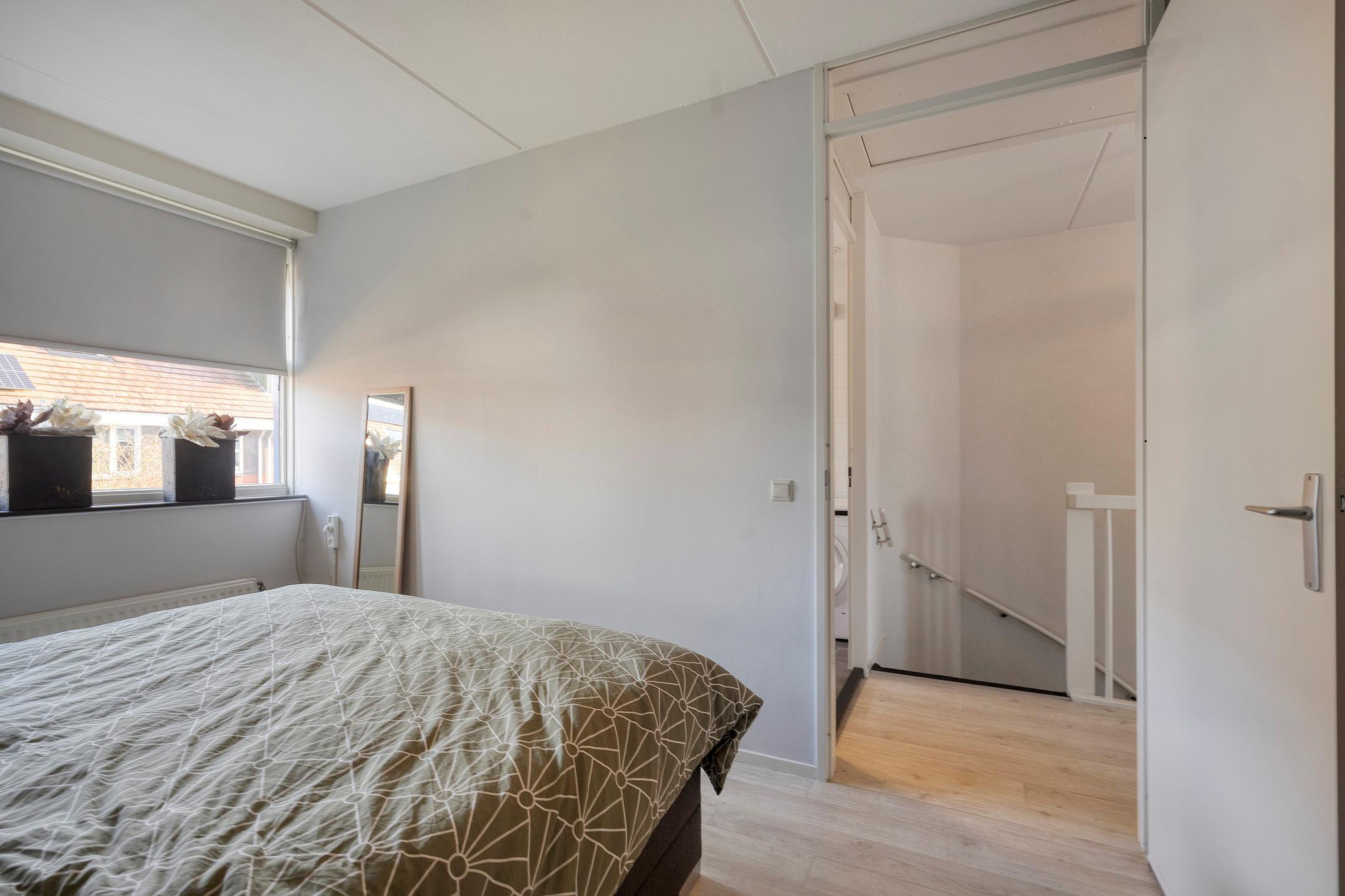 Aan de voorkant van het huis is de tweede slaapkamer, voorzien van een dakkapel die zorgt voor extra ruimte en licht. Ook hier zijn rolluiken aanwezig.