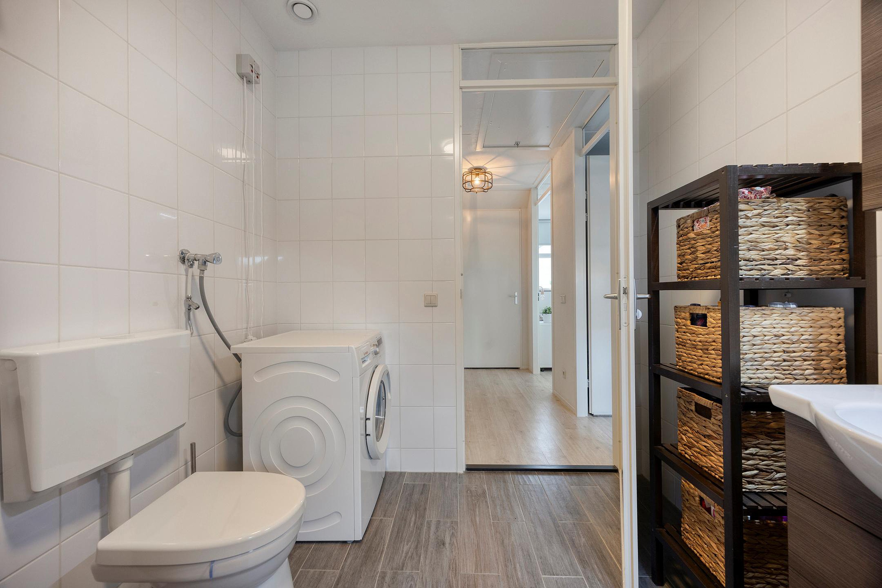 De badkamer is volledig betegeld en praktisch ingericht met een staand toilet, wastafelmeubel en een aansluiting voor de wasmachine. Alles wat je nodig hebt, compact en functioneel.