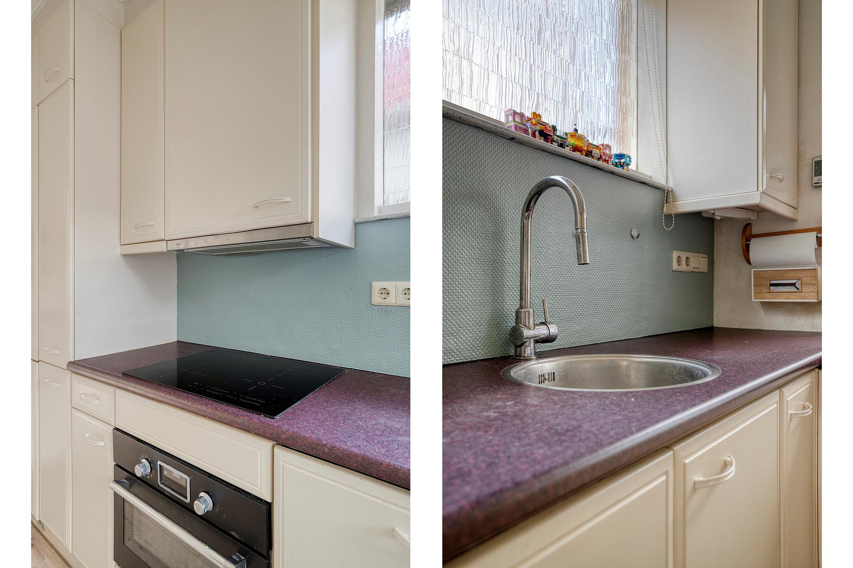 De keuken is geplaatst in een hoekopstelling en ingericht met boven- en onderkastjes, inductiekookplaat, oven, afzuigkap, koelkast en vriezer.