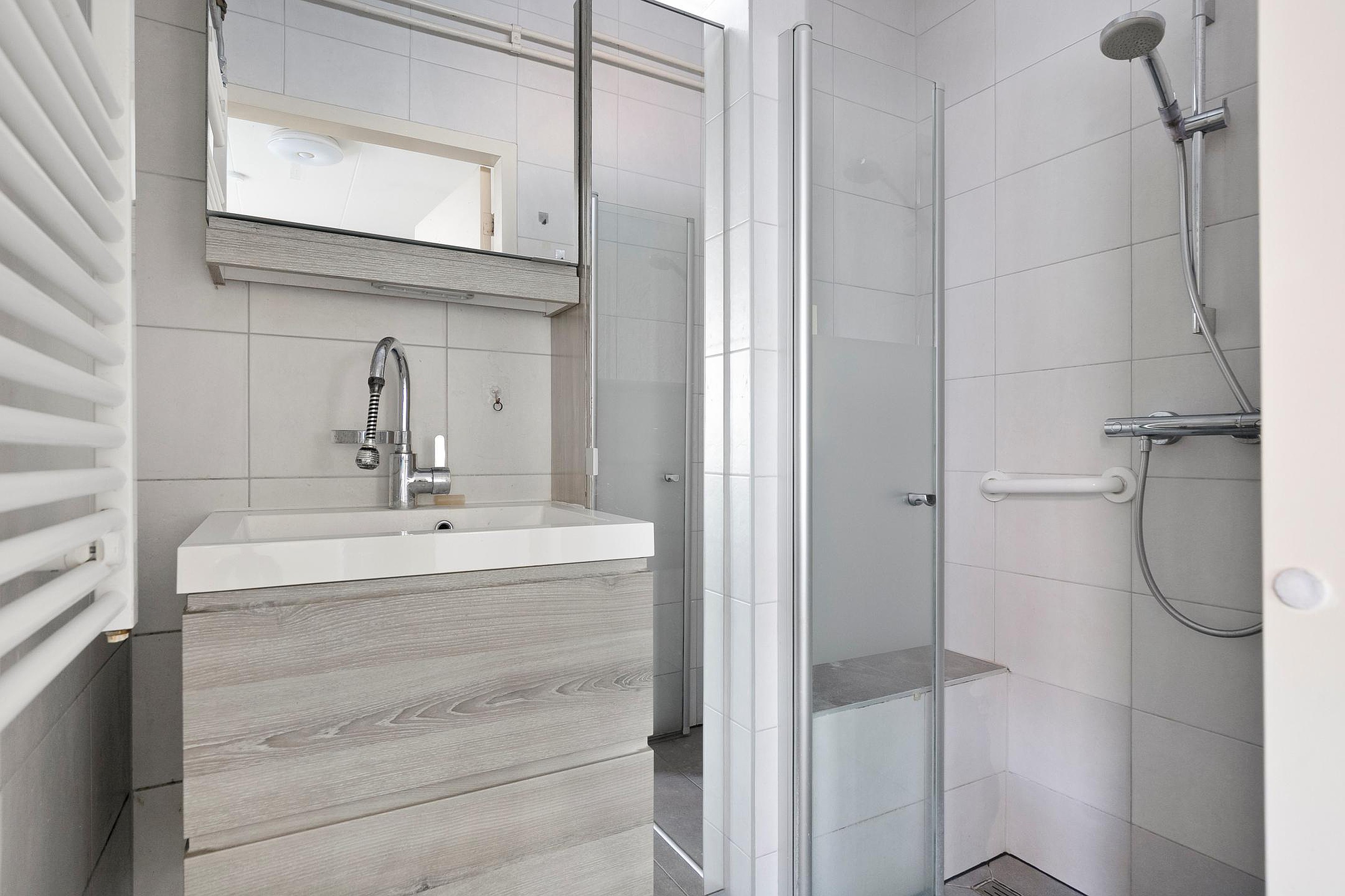 Aan de achterzijde van het huis is de bijkeuken welke toegang geeft tot het toilet en tot de badkamer. De toiletruimte is ingericht met een staand toilet en een fonteintje. De badkamer is ingericht met een douche en een wastafelmeubel.