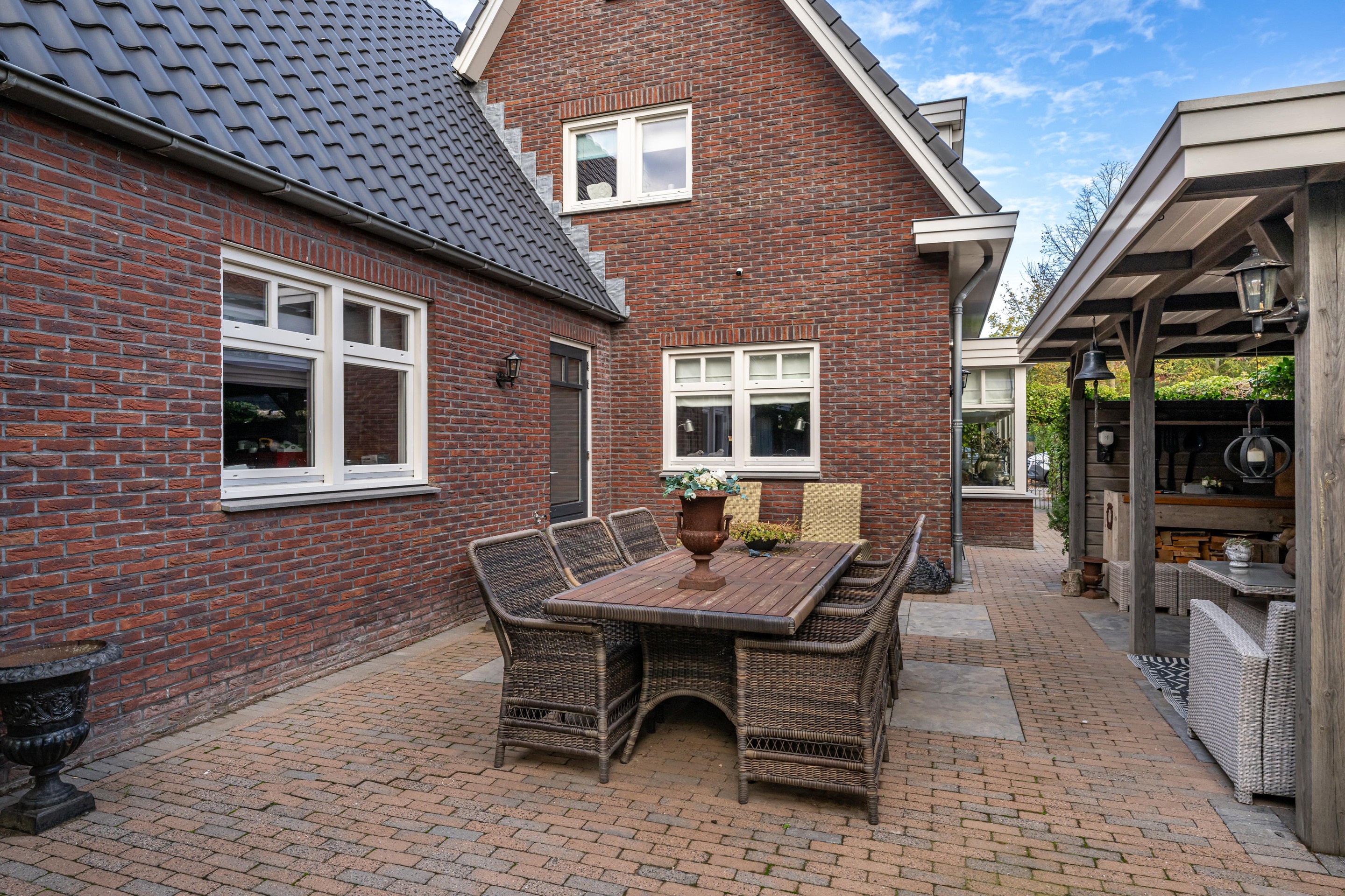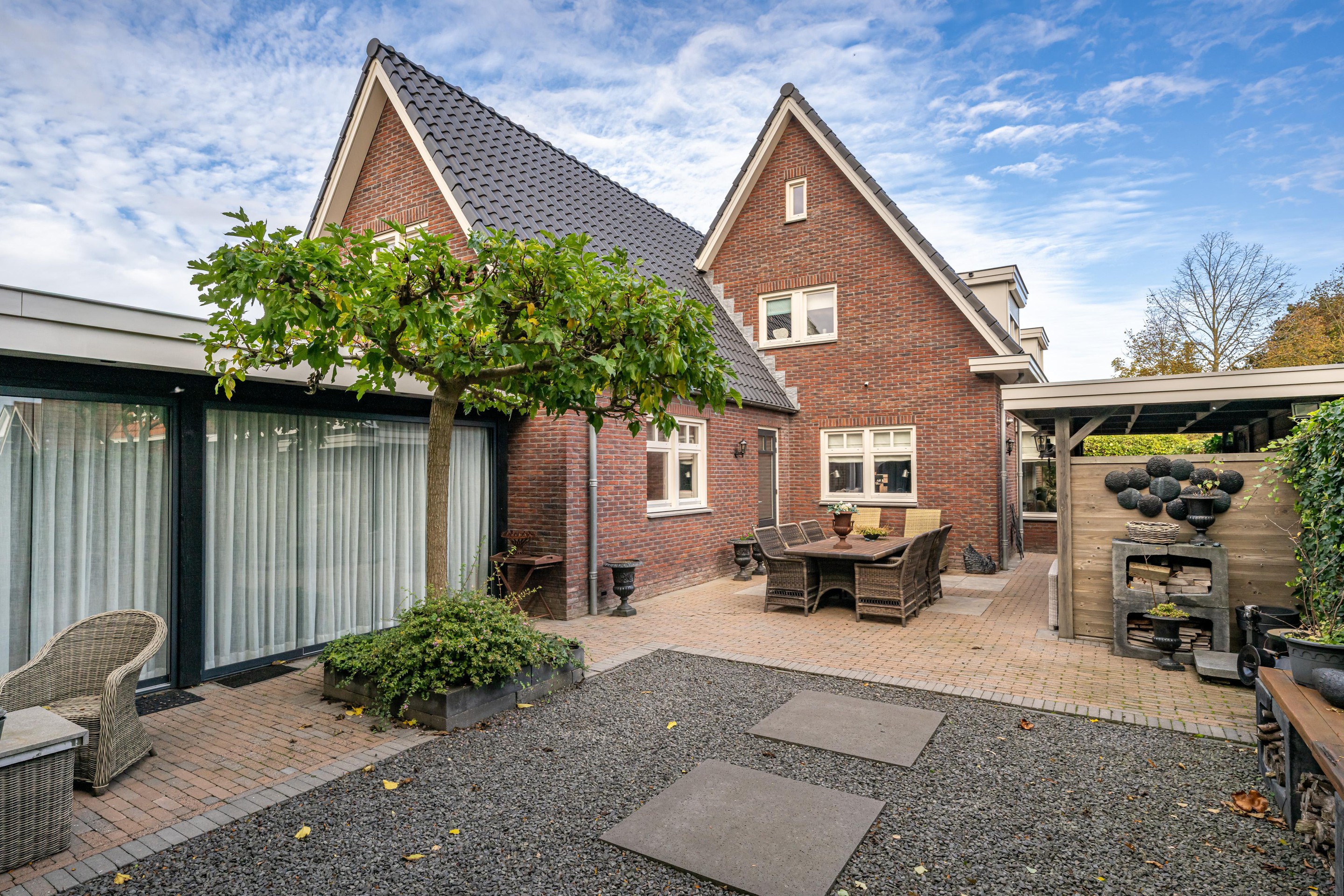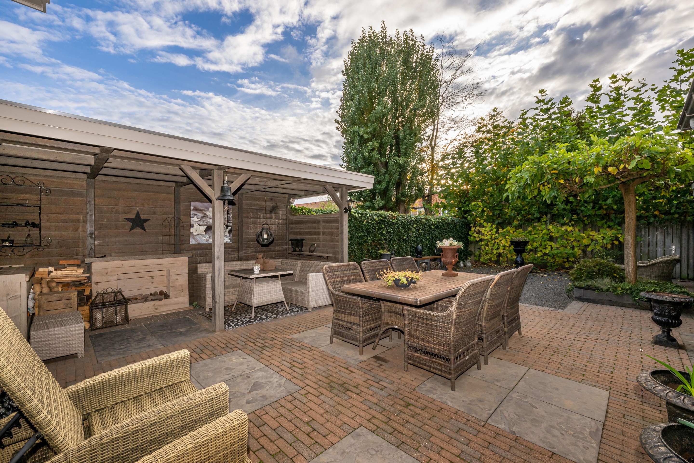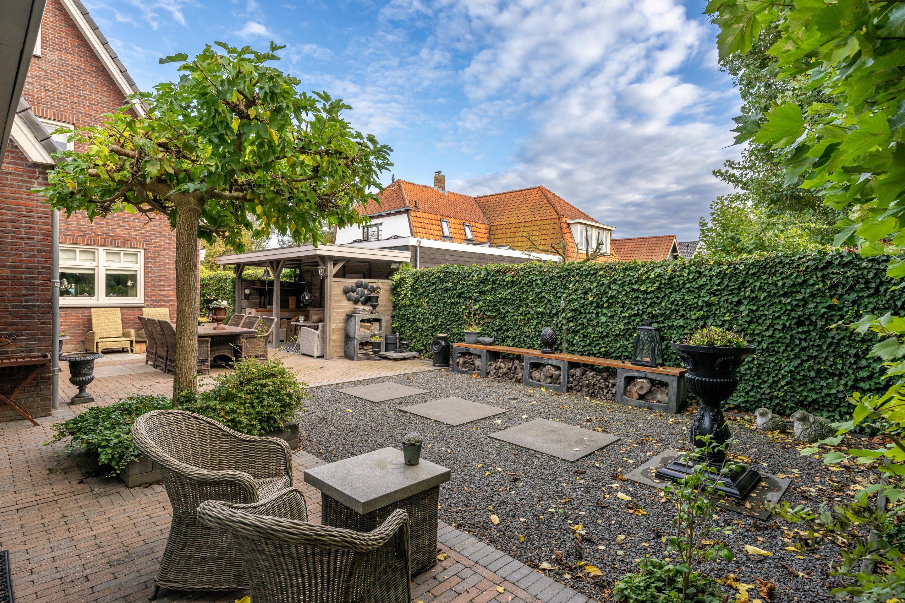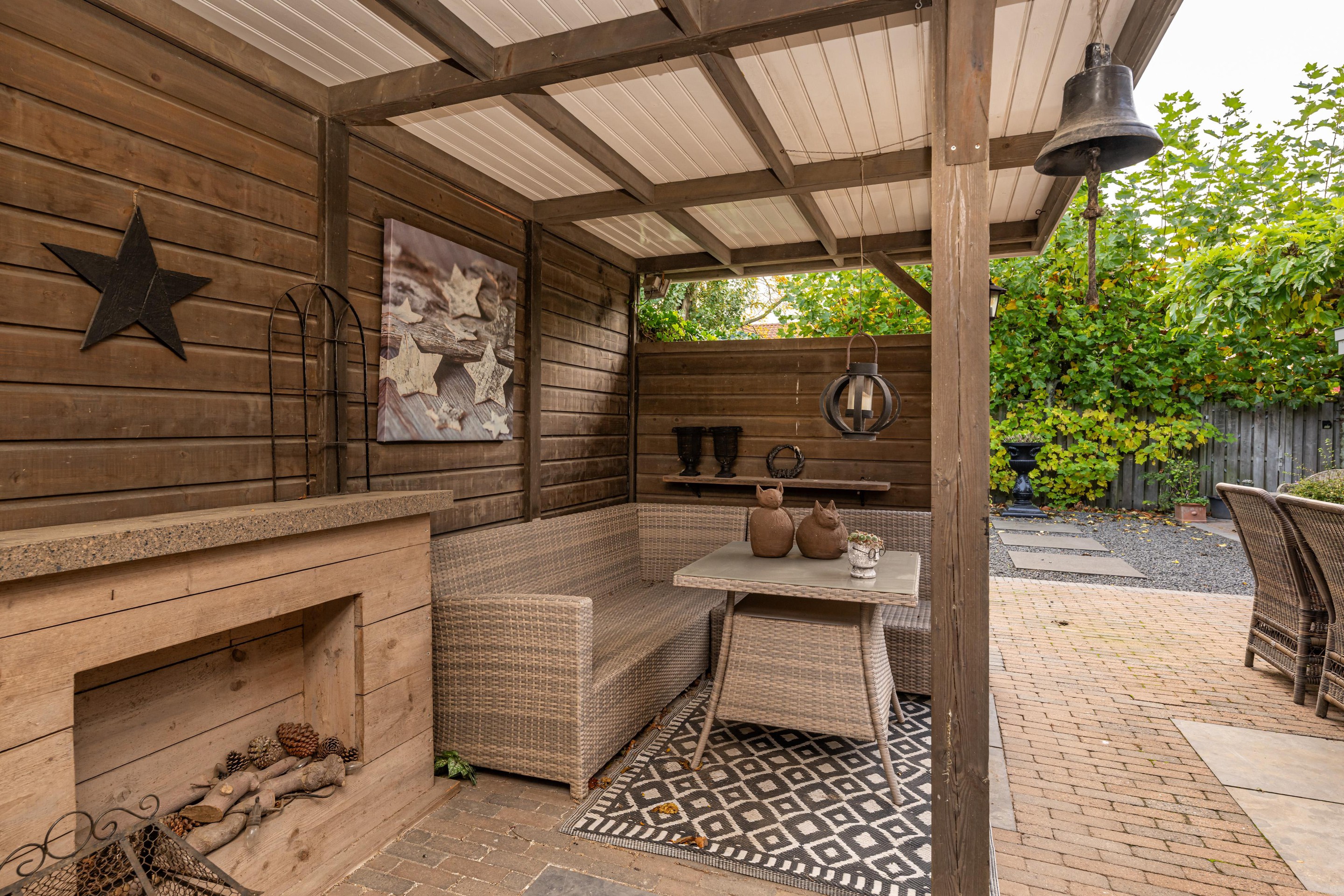 In de fraai aangelegde tuin bevindt zich een sfeervolle overkapping, waar u heerlijk beschut kunt ontspannen en genieten van het buitenleven, ongeacht het seizoen. Aansluitend treft u de luxe tuinkamer van circa 35 m2 – een echte blikvanger. Deze prachtige ruimte is uitgerust met een gezellige houtkachel, een keukenblok met koud water en openslaande deuren naar de tuin. Hier komen comfort en sfeer samen, waardoor het de perfecte plek is voor lange avonden met familie en vrienden, het hele jaar door.