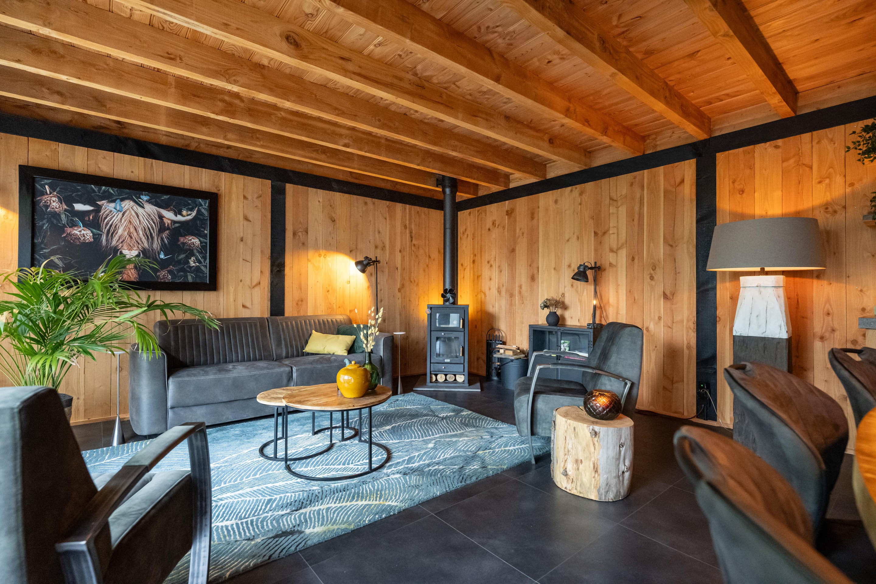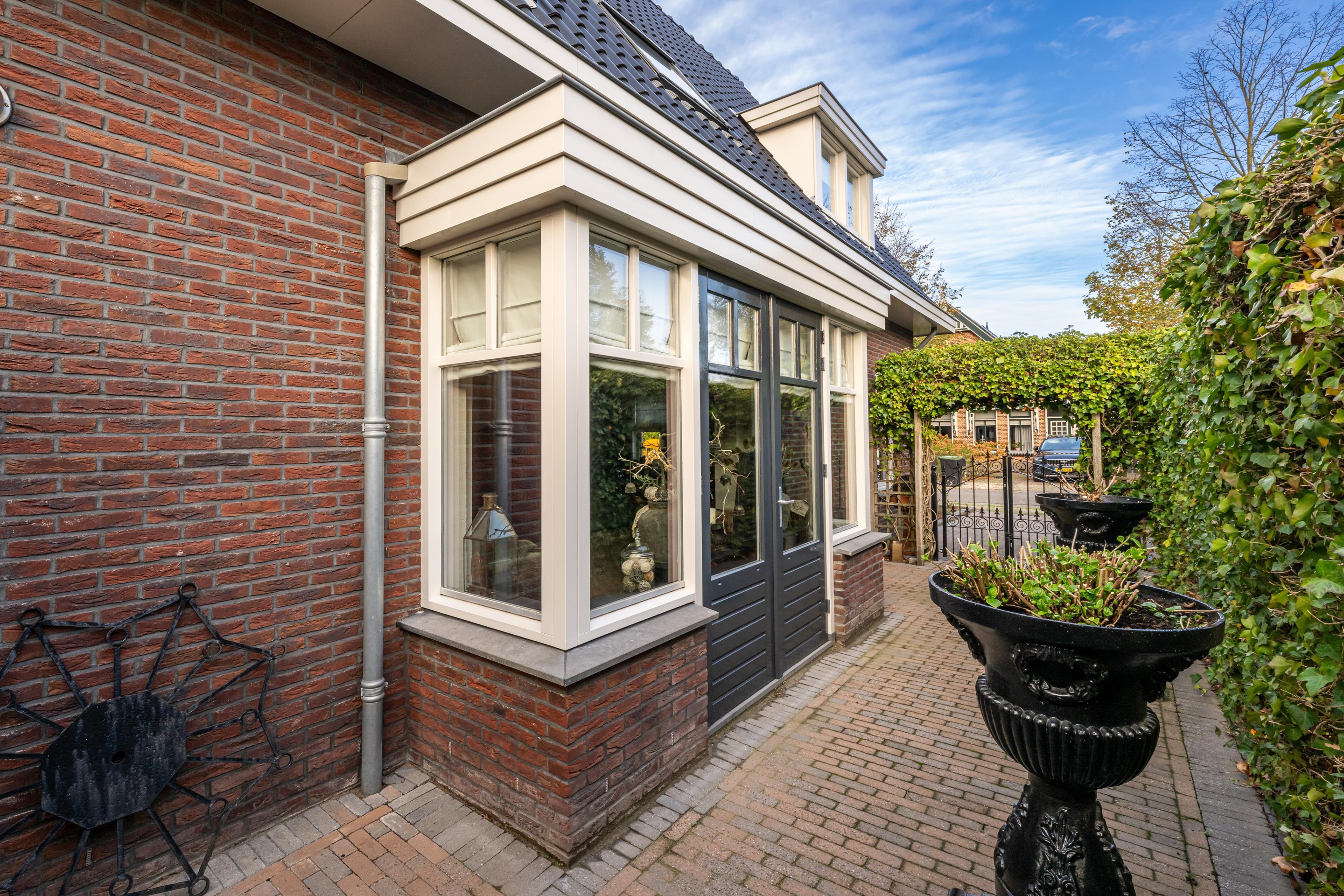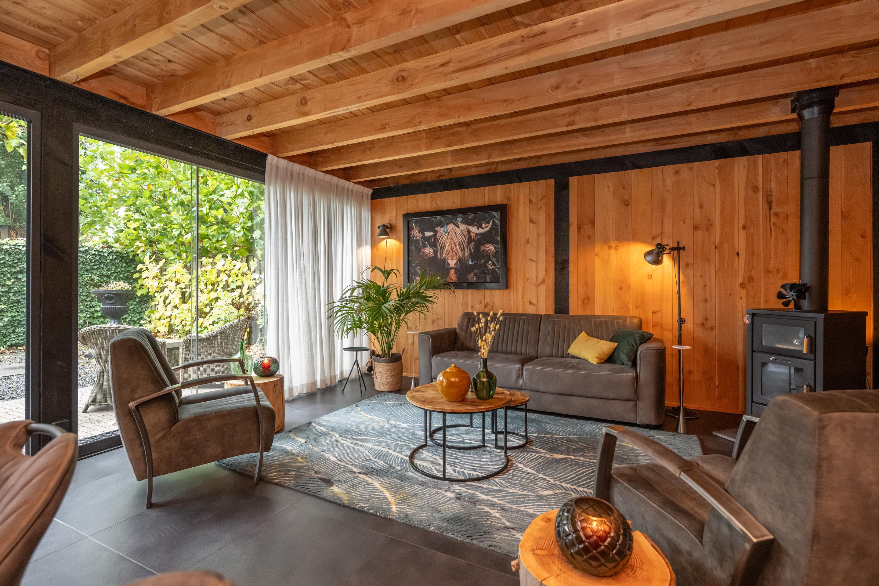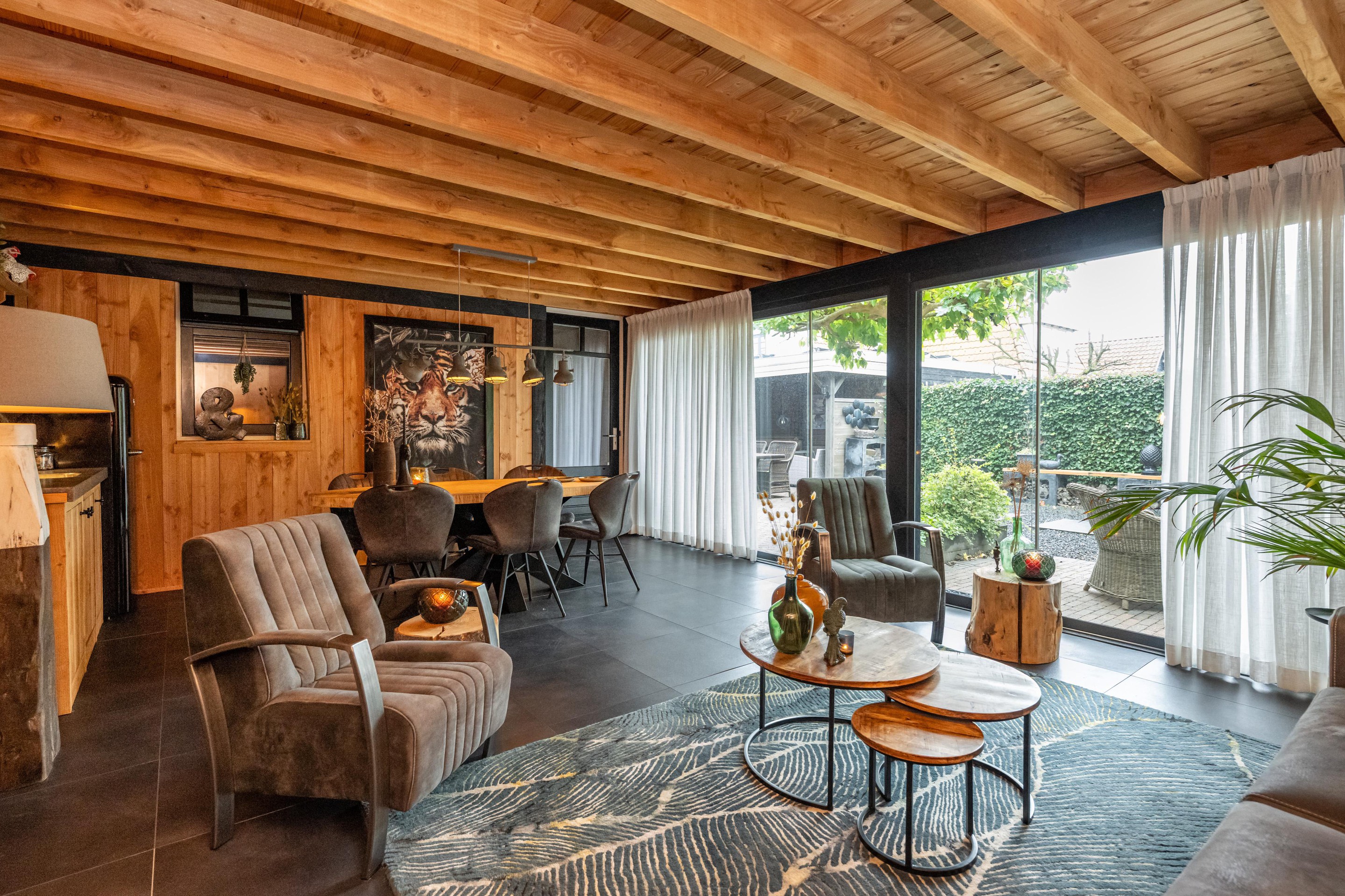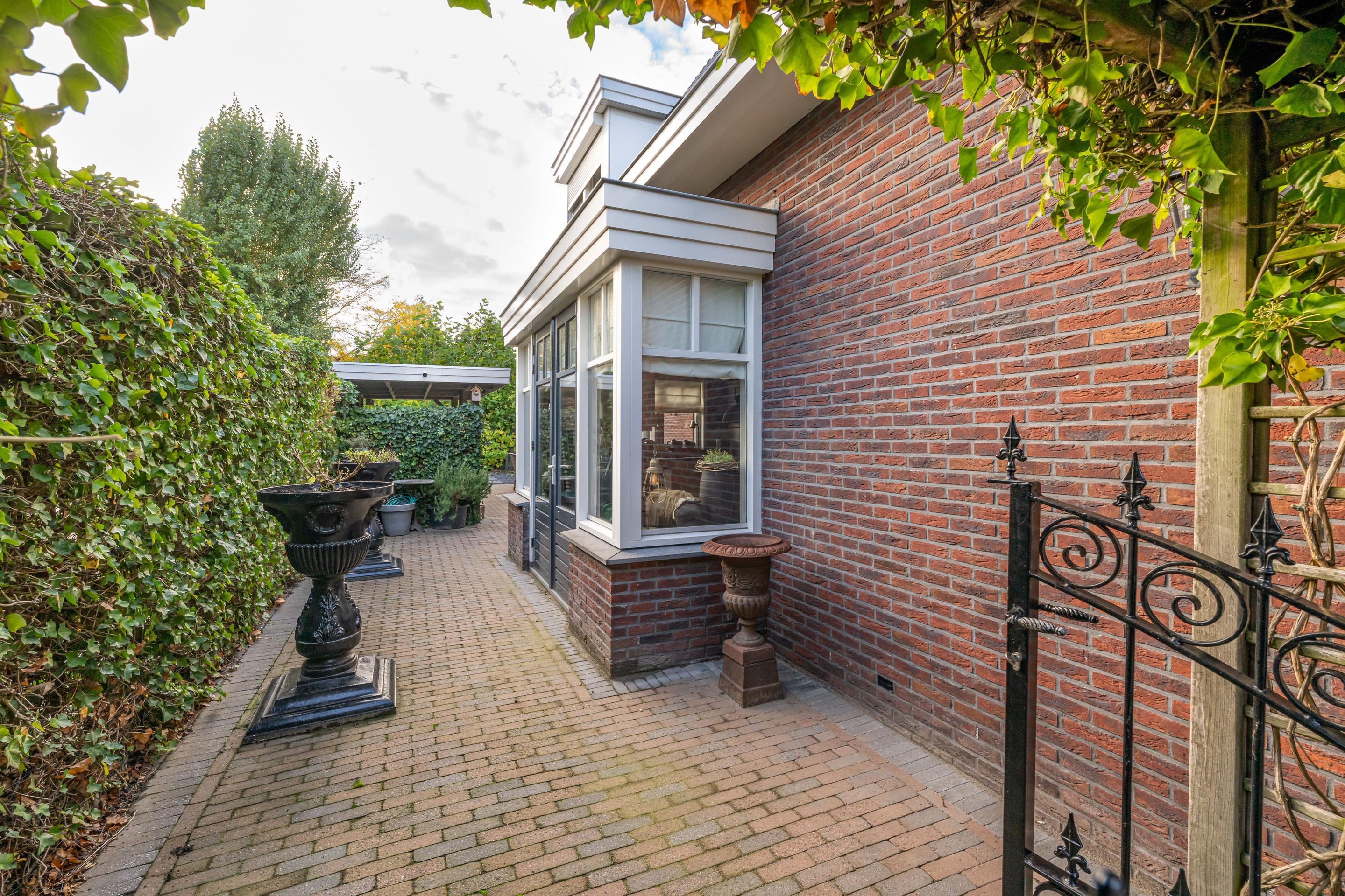 In de fraai aangelegde tuin bevindt zich een sfeervolle overkapping, waar u heerlijk beschut kunt ontspannen en genieten van het buitenleven, ongeacht het seizoen. Aansluitend treft u de luxe tuinkamer van circa 35 m2 – een echte blikvanger. Deze prachtige ruimte is uitgerust met een gezellige houtkachel, een keukenblok met koud water en openslaande deuren naar de tuin. Hier komen comfort en sfeer samen, waardoor het de perfecte plek is voor lange avonden met familie en vrienden, het hele jaar door.