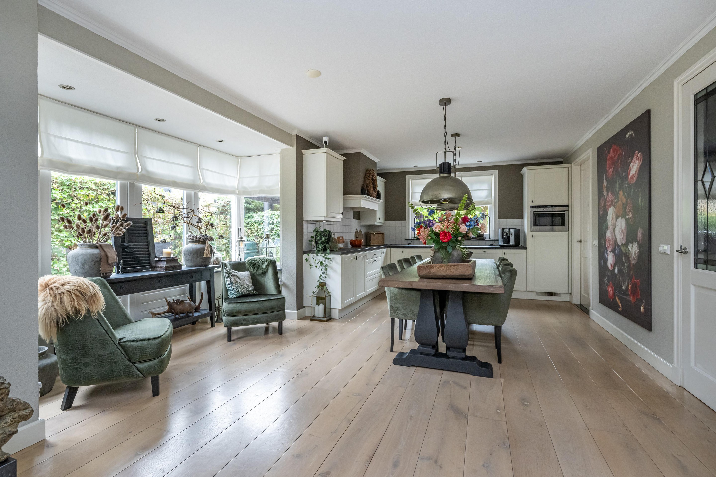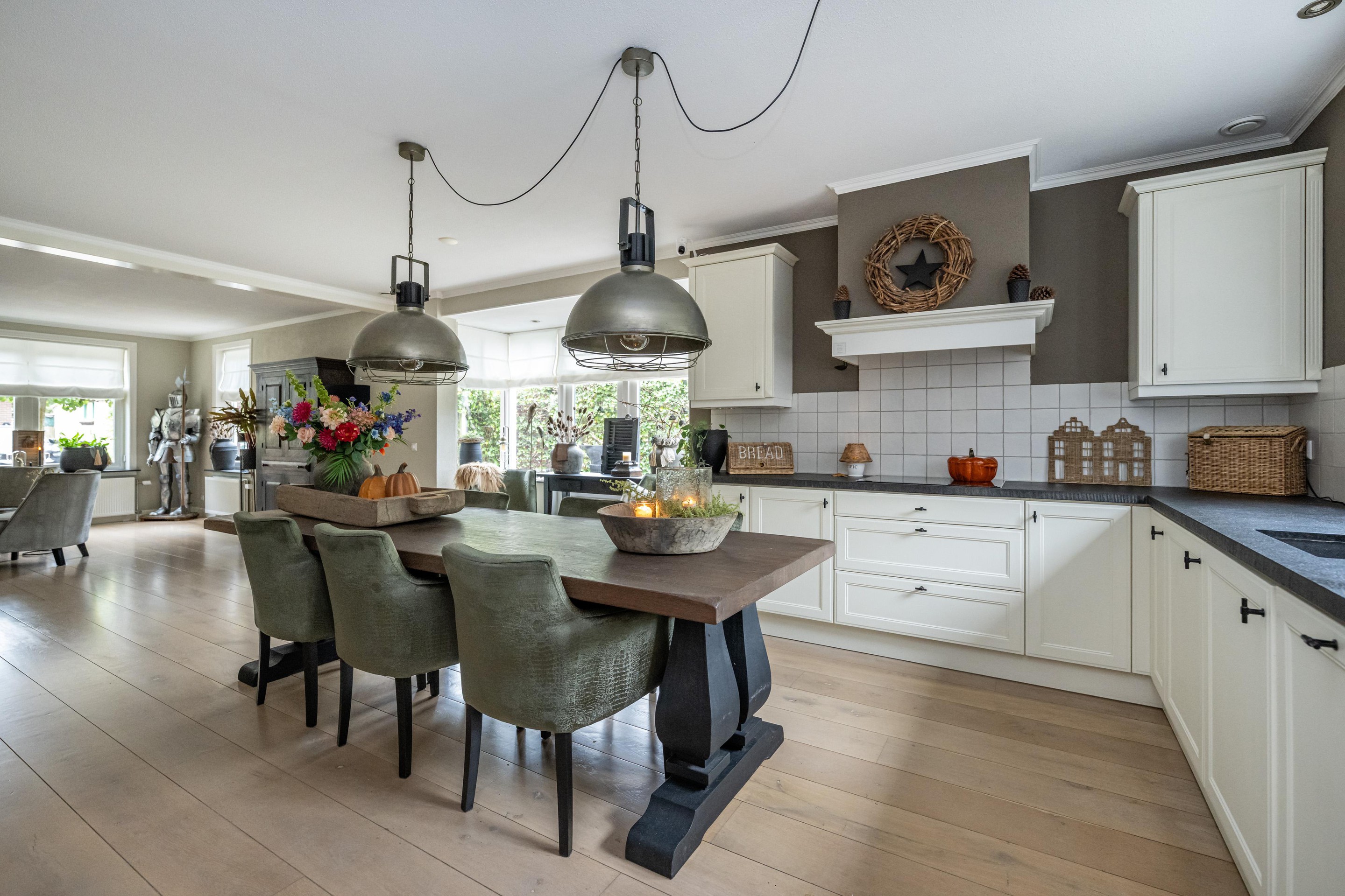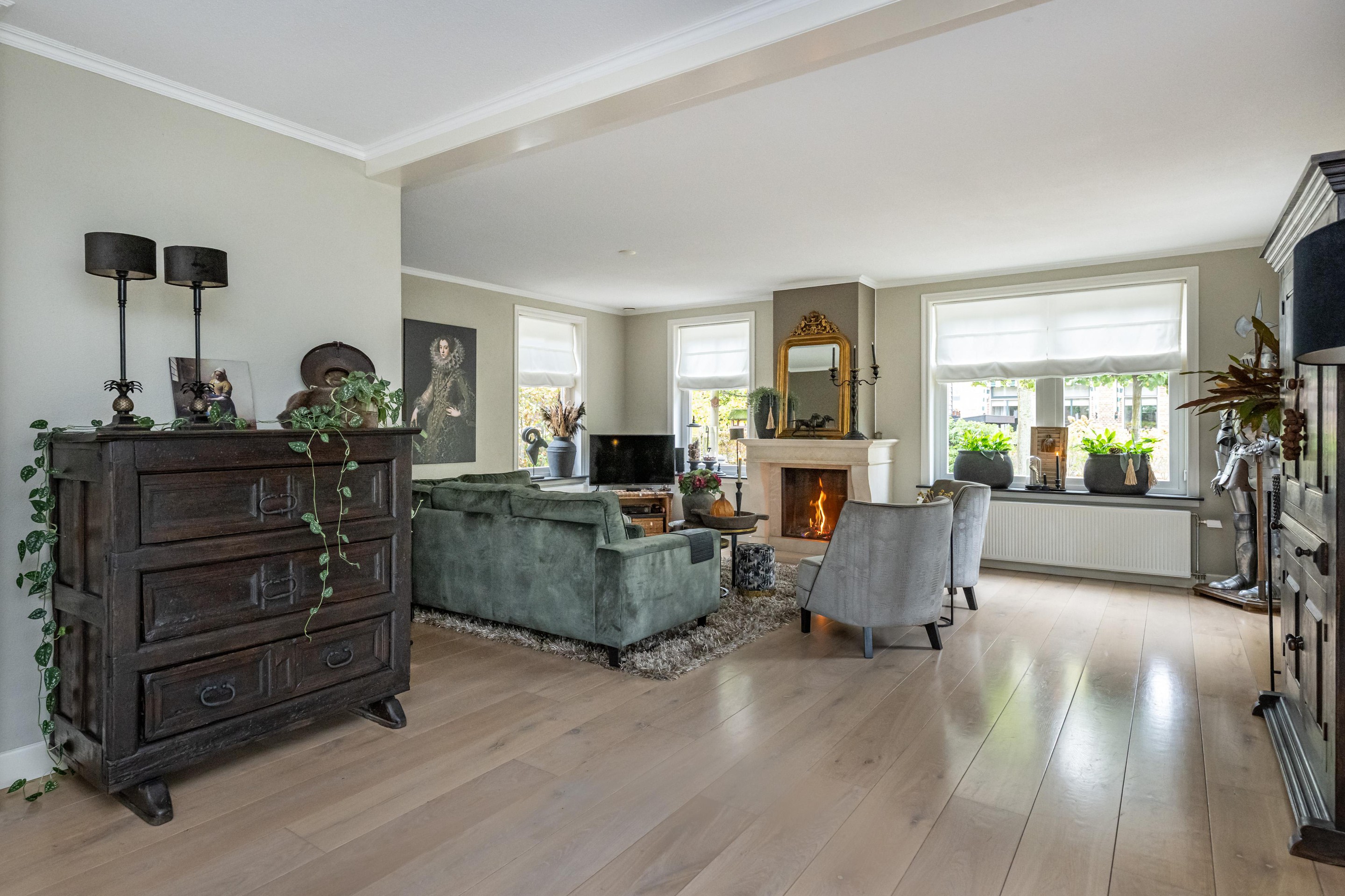 Eikenhouten vloerdelen, radiatoren met slimme thermostaatregeling, schouw met sfeervolle gashaard, mechanische ventilatie, erker met dubbel openslaande deuren.