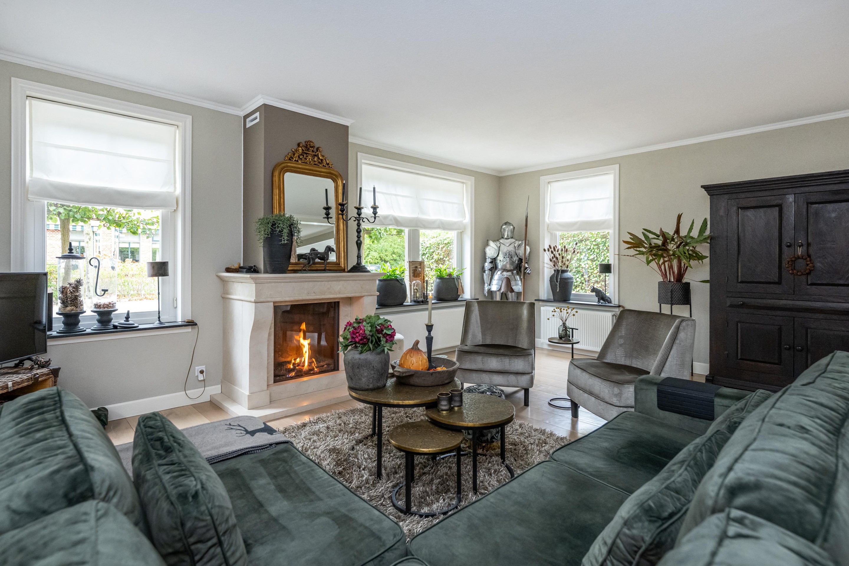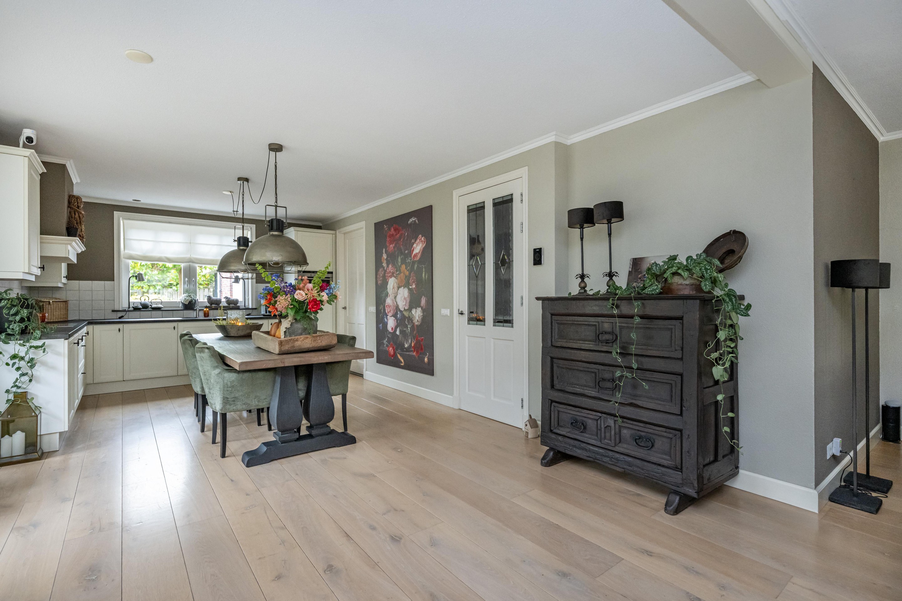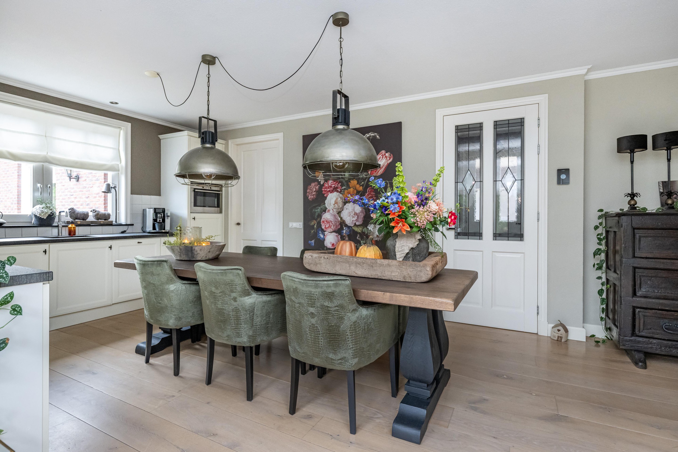 Eikenhouten vloerdelen, radiatoren met slimme thermostaatregeling, schouw met sfeervolle gashaard, mechanische ventilatie, erker met dubbel openslaande deuren.