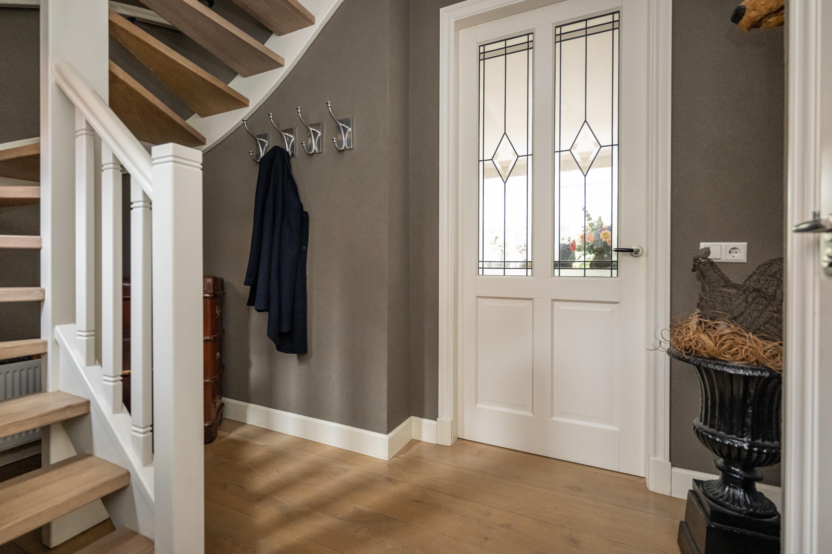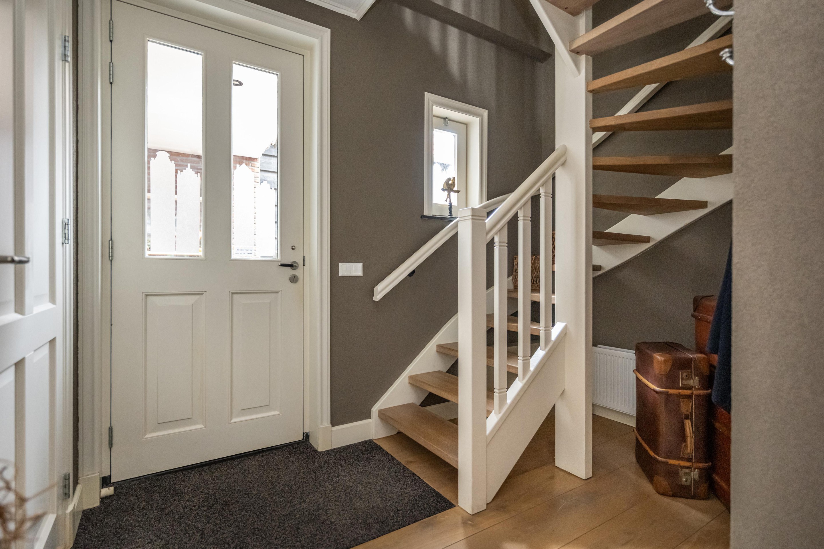 Eikenhouten vloerdelen, meterkast, radiator met slimme thermostaatregeling en trapopgang.