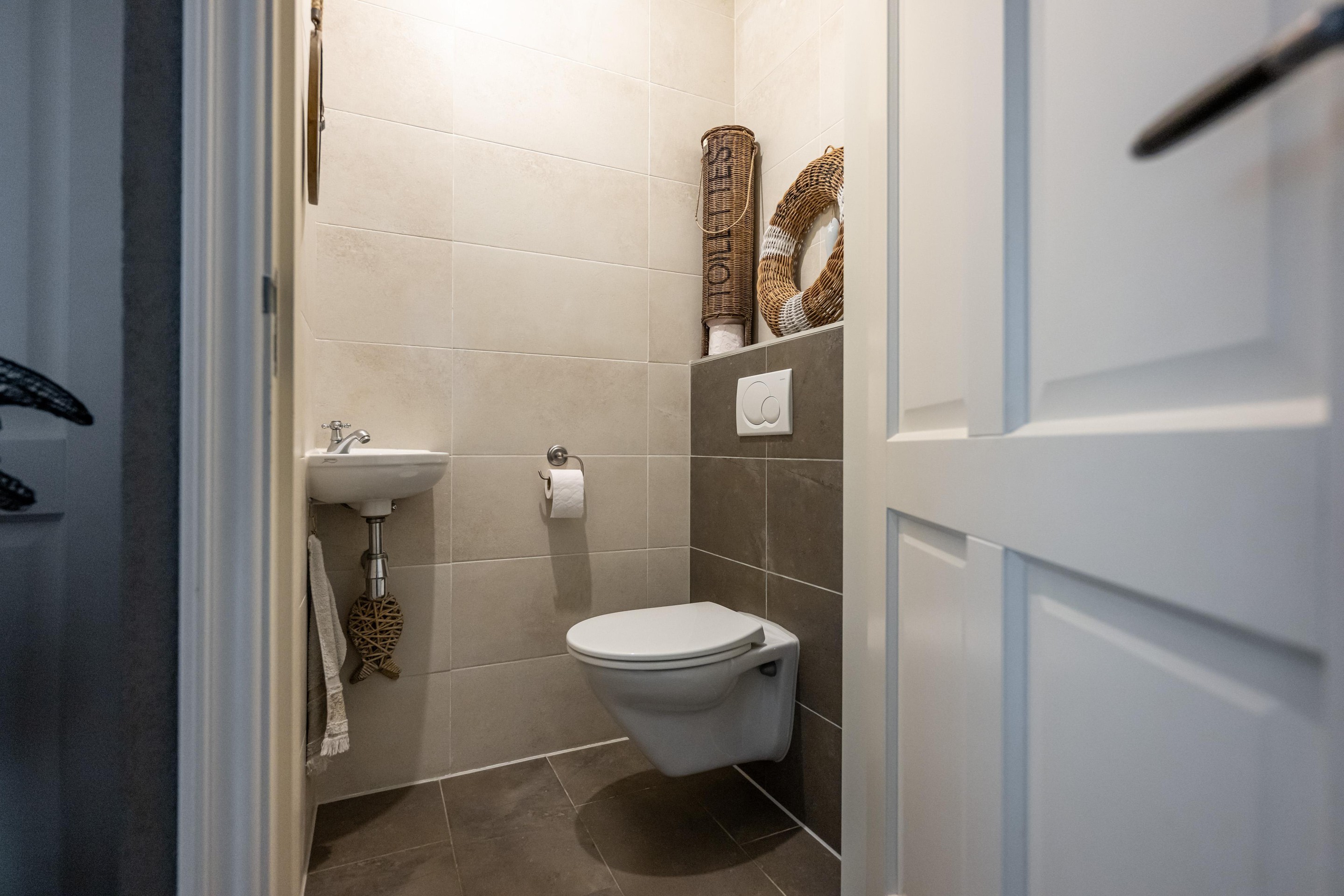 Plavuizenvloer, zwevend, toiletfontein, mechanische ventilatie en geheel betegeld.