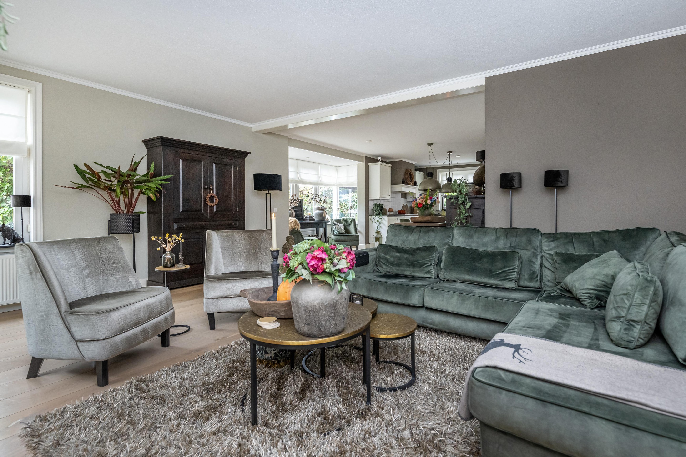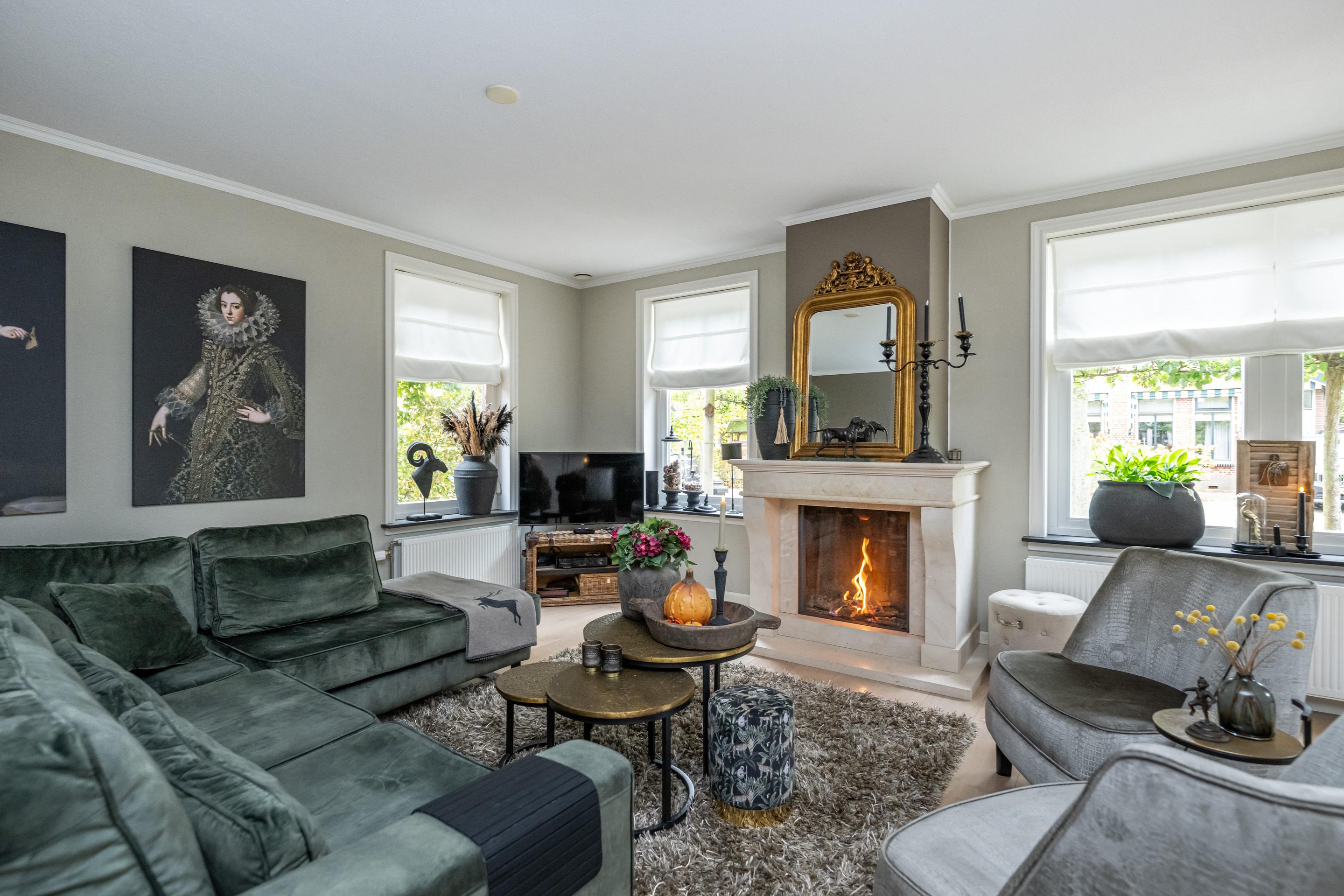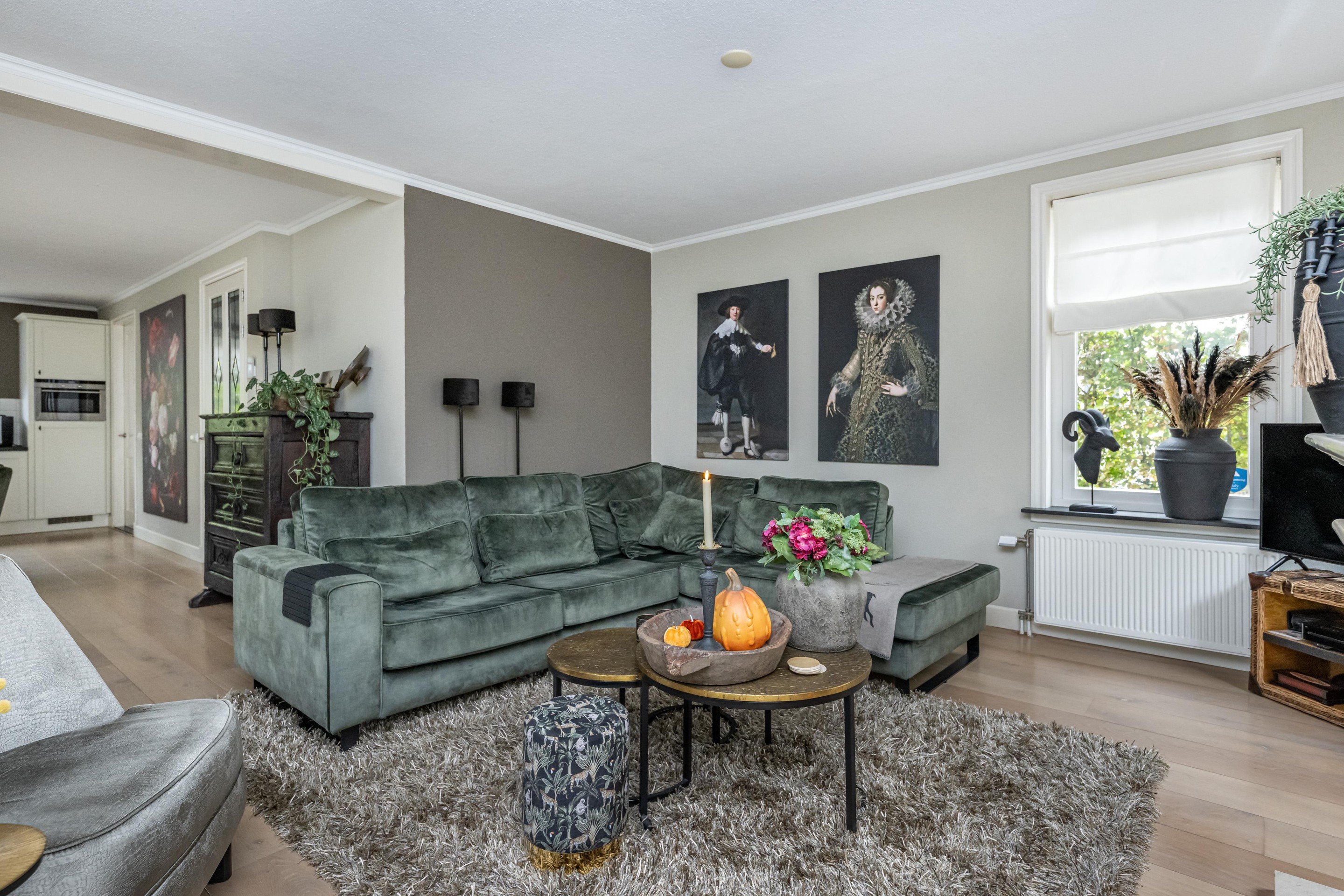 Bij binnenkomst ervaart u de lichte, open sfeer van de woning. De woonkamer is royaal opgezet, met een sfeervolle gashaard als middelpunt. De karakteristieke erker zorgt voor extra lichtinval en biedt een charmant uitzicht. Via de openslaande deuren bereikt u de tuin, waar binnen en buiten naadloos in elkaar overgaan.