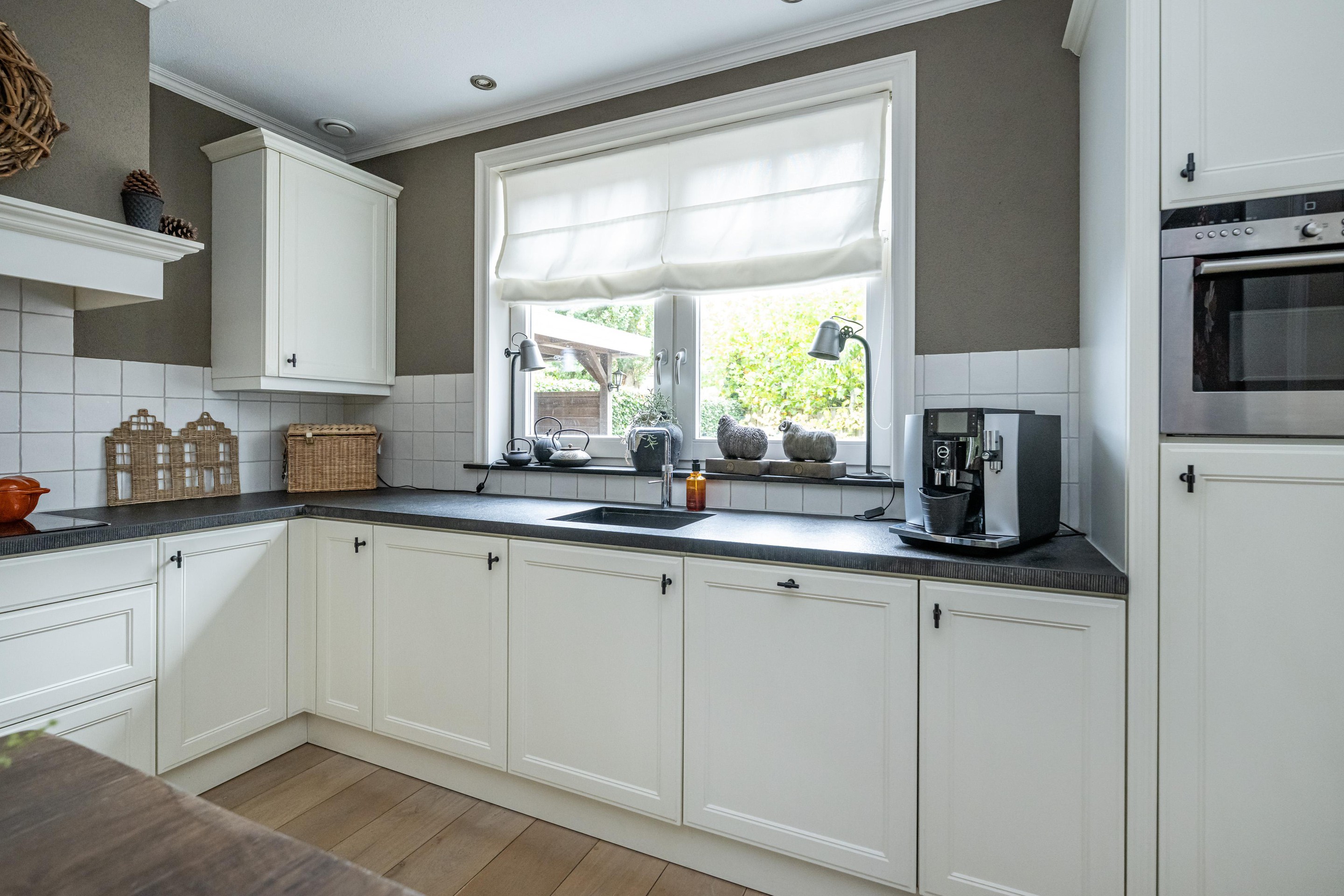 Eikenhouten vloerdelen, graniet aanrechtblad, enkele spoelbak, Quooker, 4-pits keramische kookplaat, afzuigkap, vaatwasser, koelkast, combi-oven en spots in plafond.