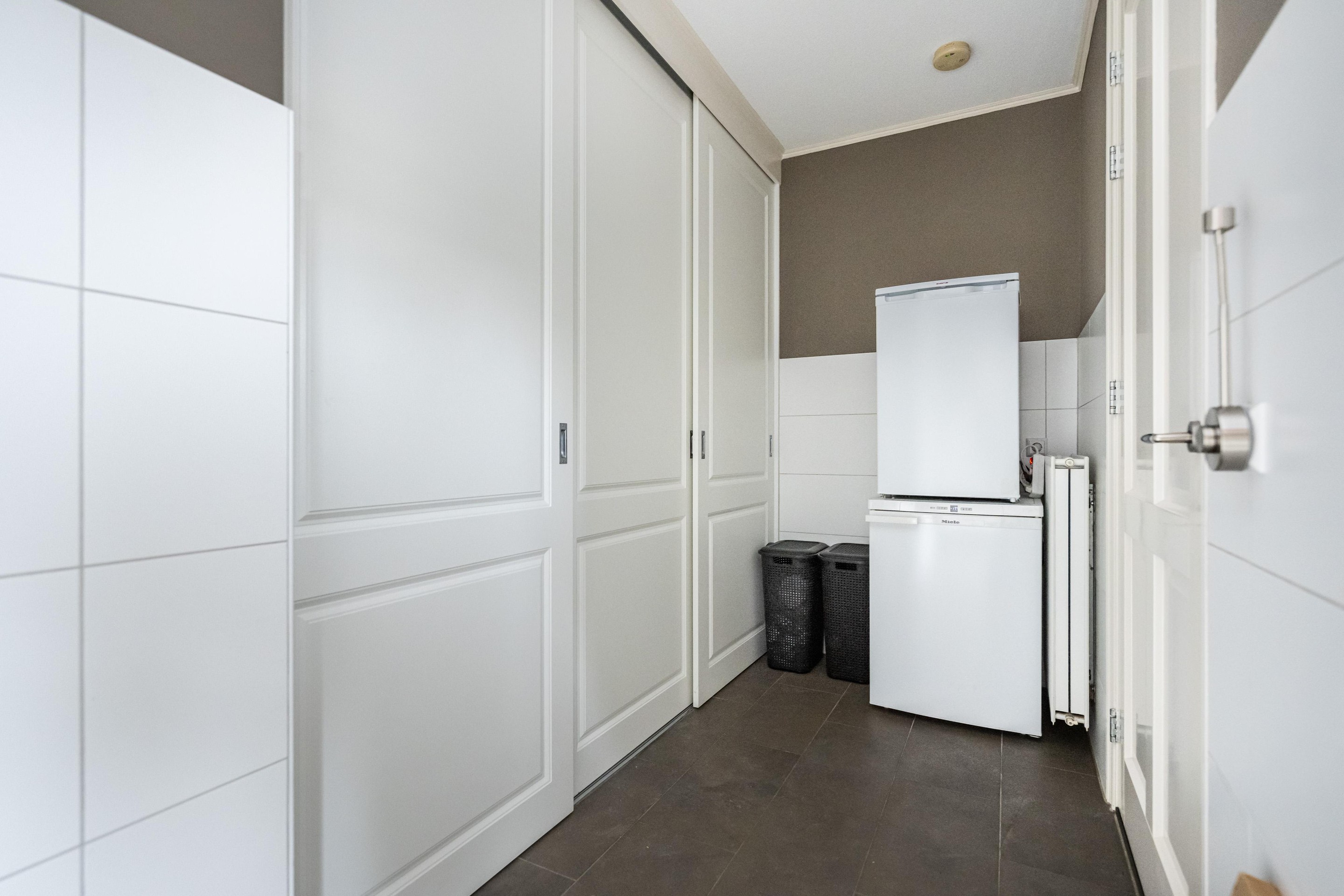 Plavuizenvloer, schuifkast met witgoedaansluitingen, radiator, toegang tot inpandige garage en tuinkamer en achterdeur naar tuin.