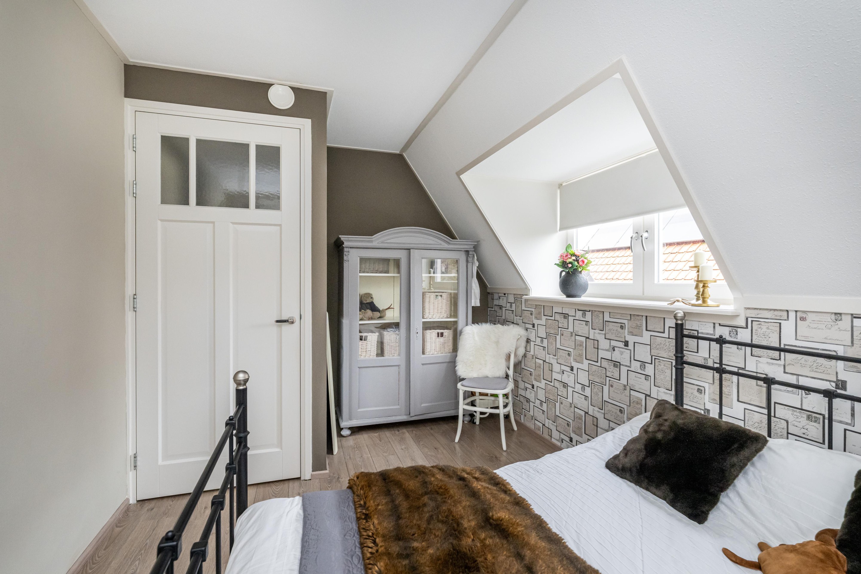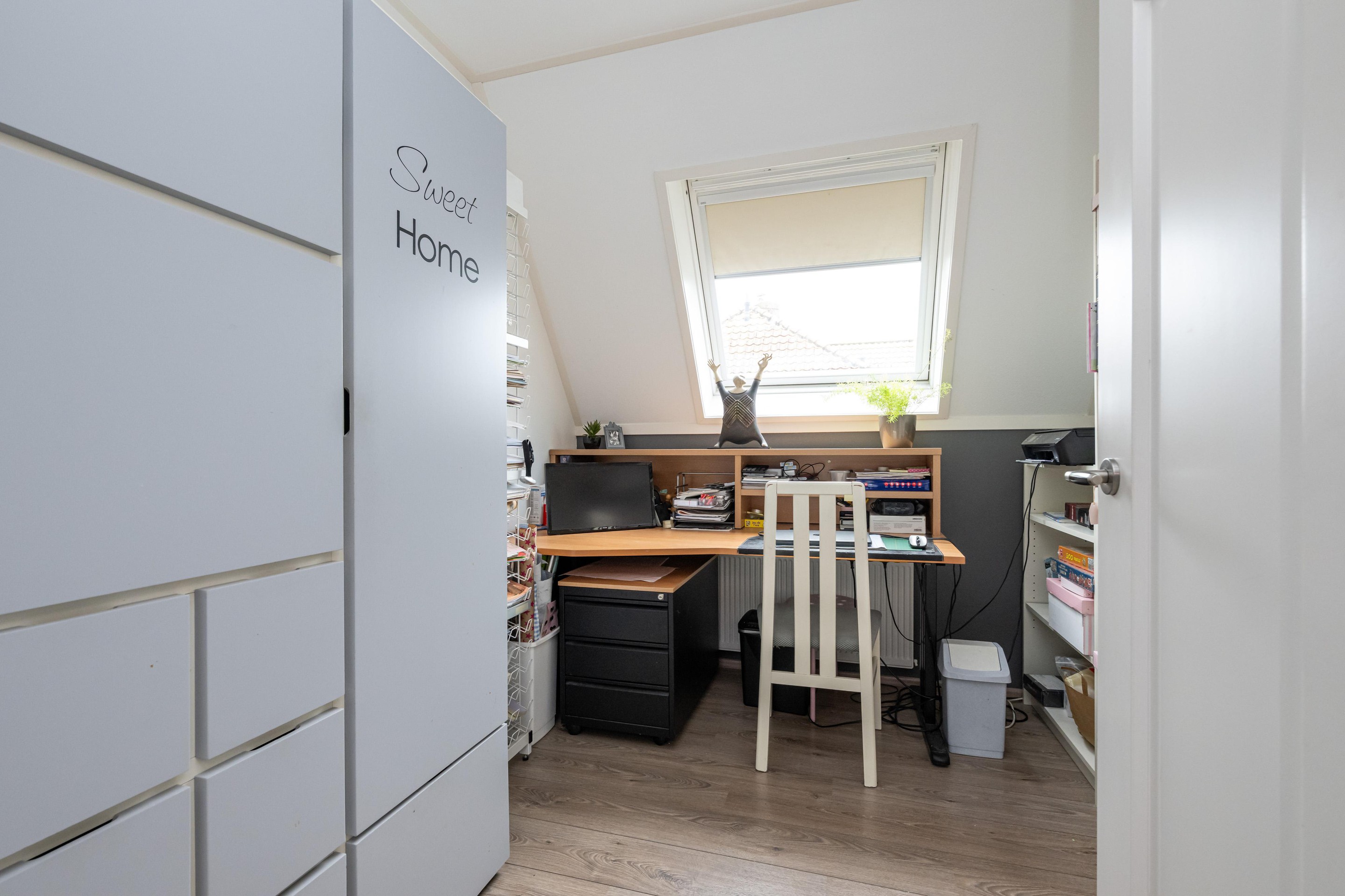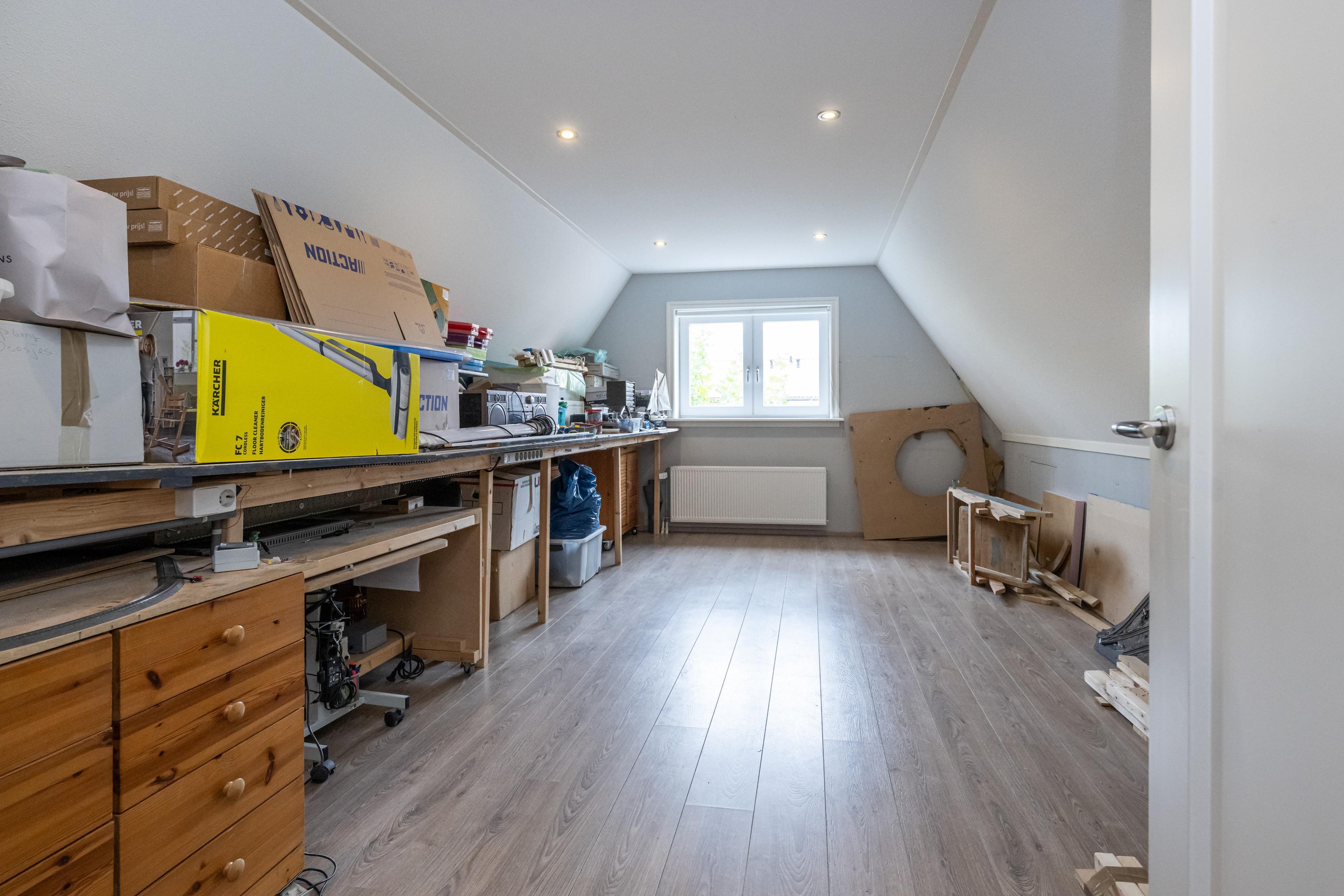 Laminaatvloer, radiator, Velux dakraam met verduistering en screen en mechanische ventilatie.
