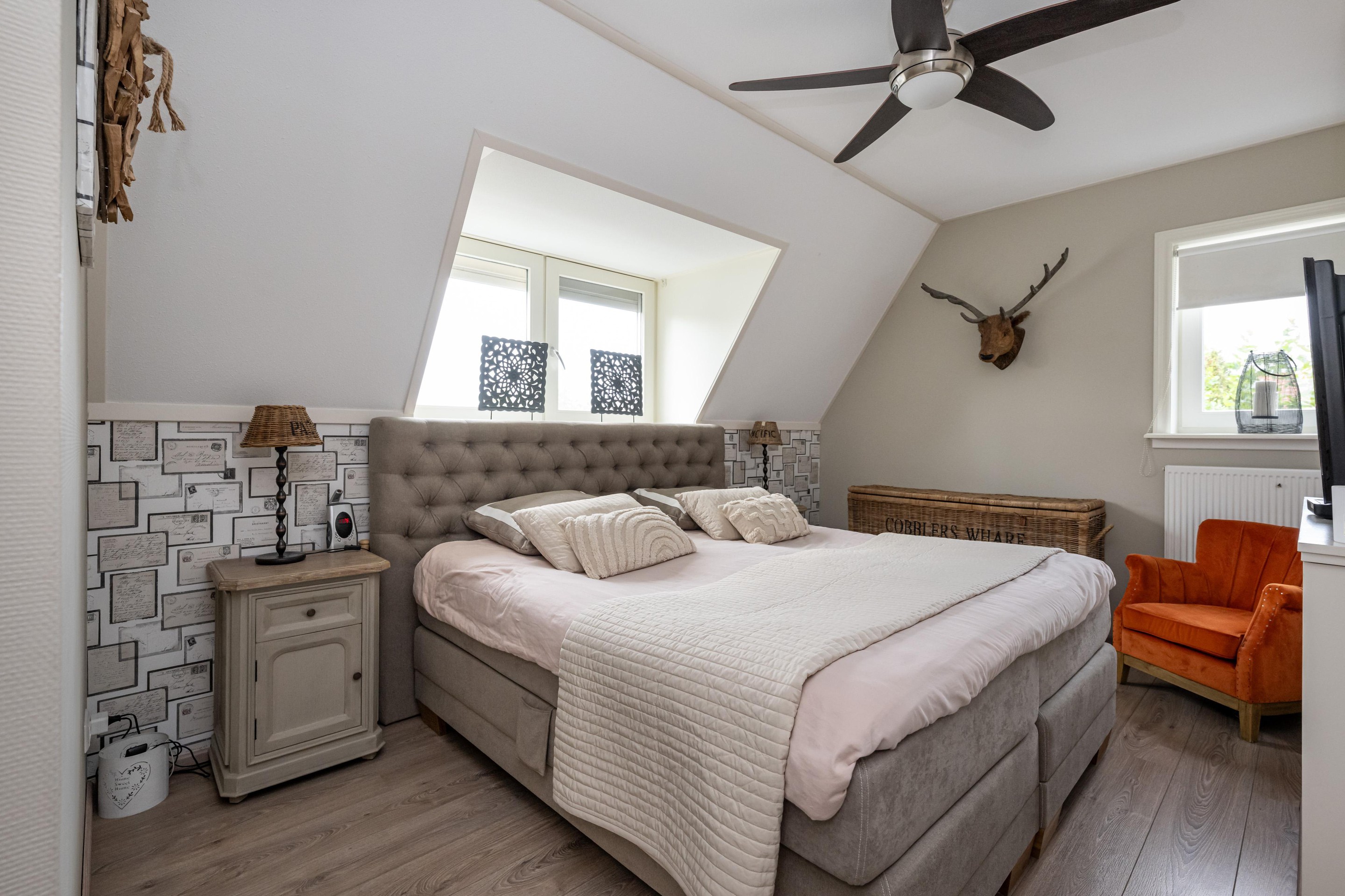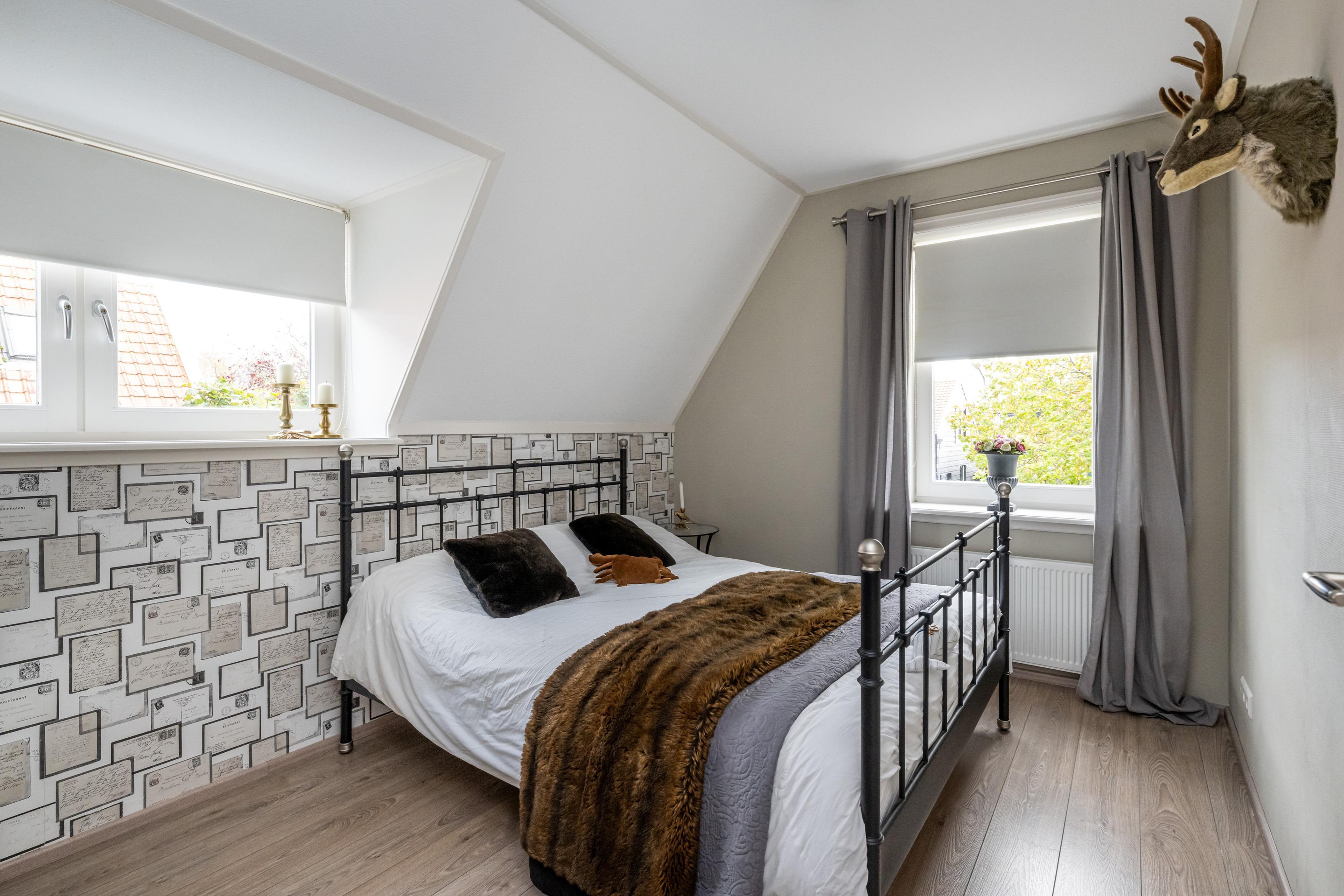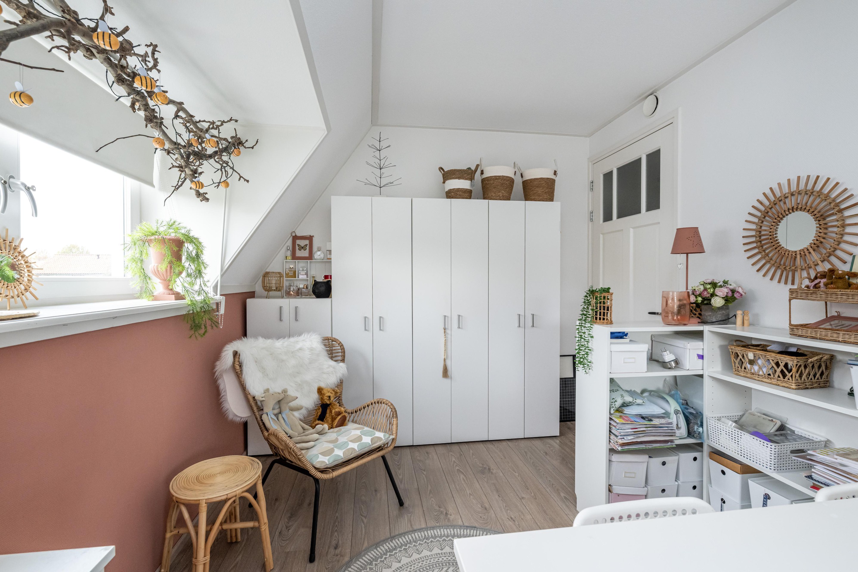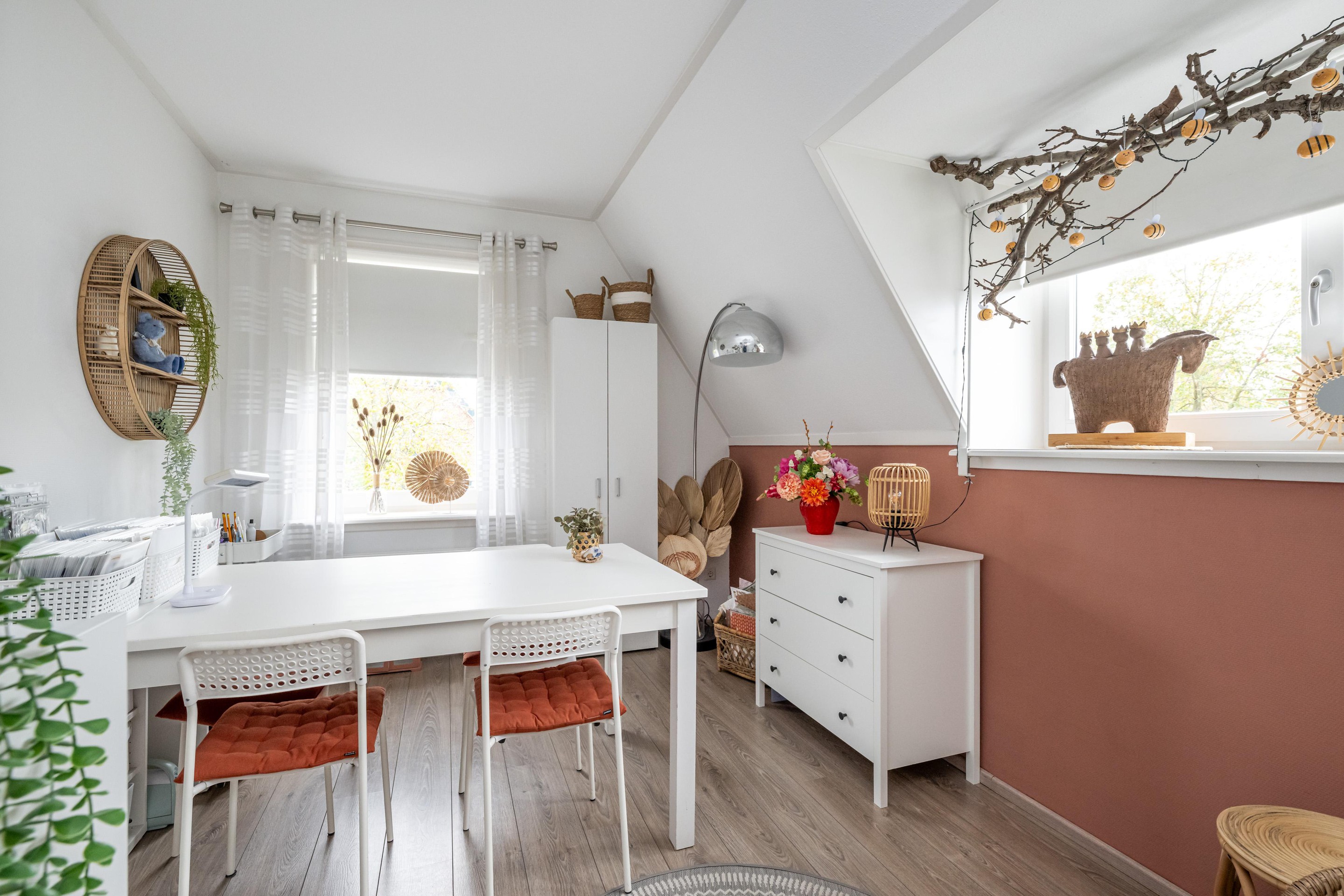 Laminaatvloer, radiator, Velux dakraam met verduistering en screen en mechanische ventilatie.