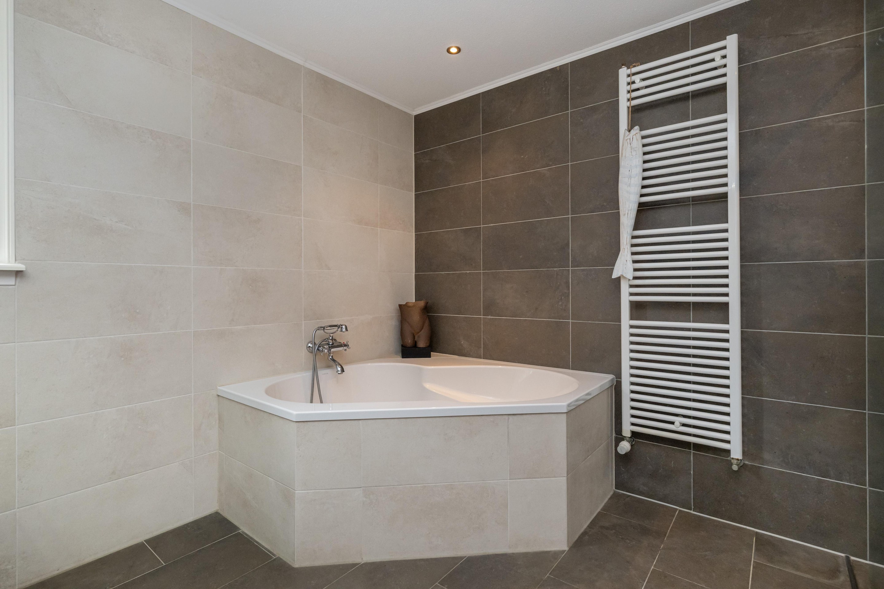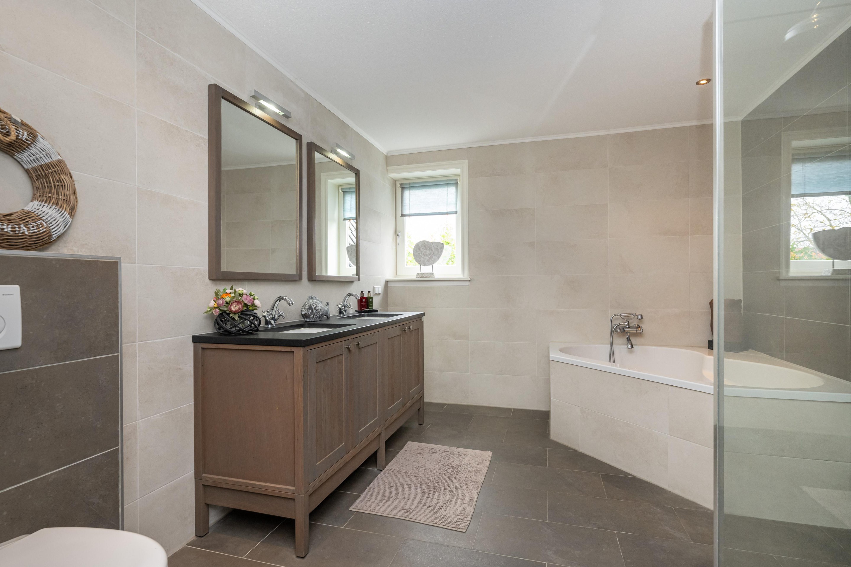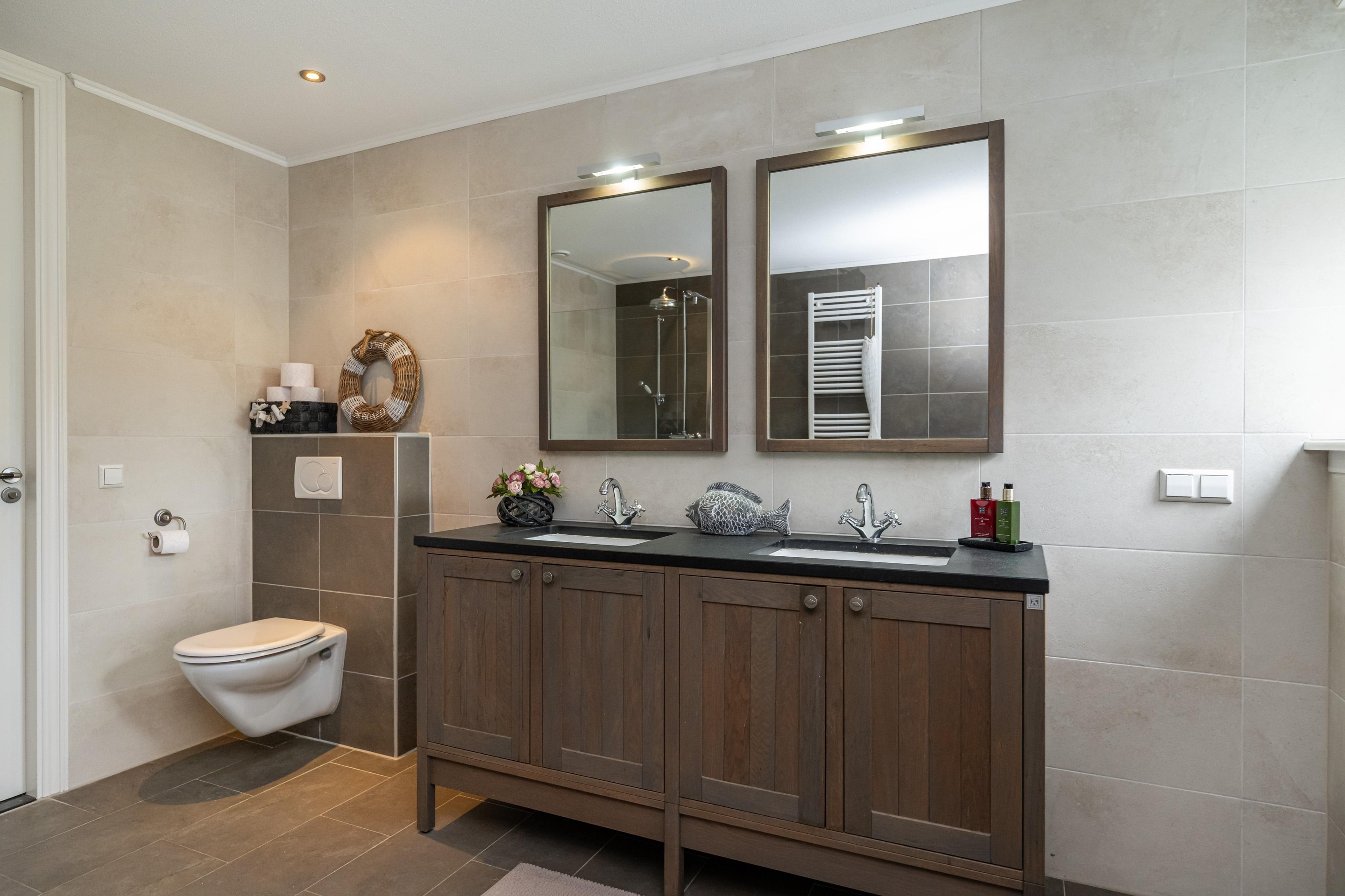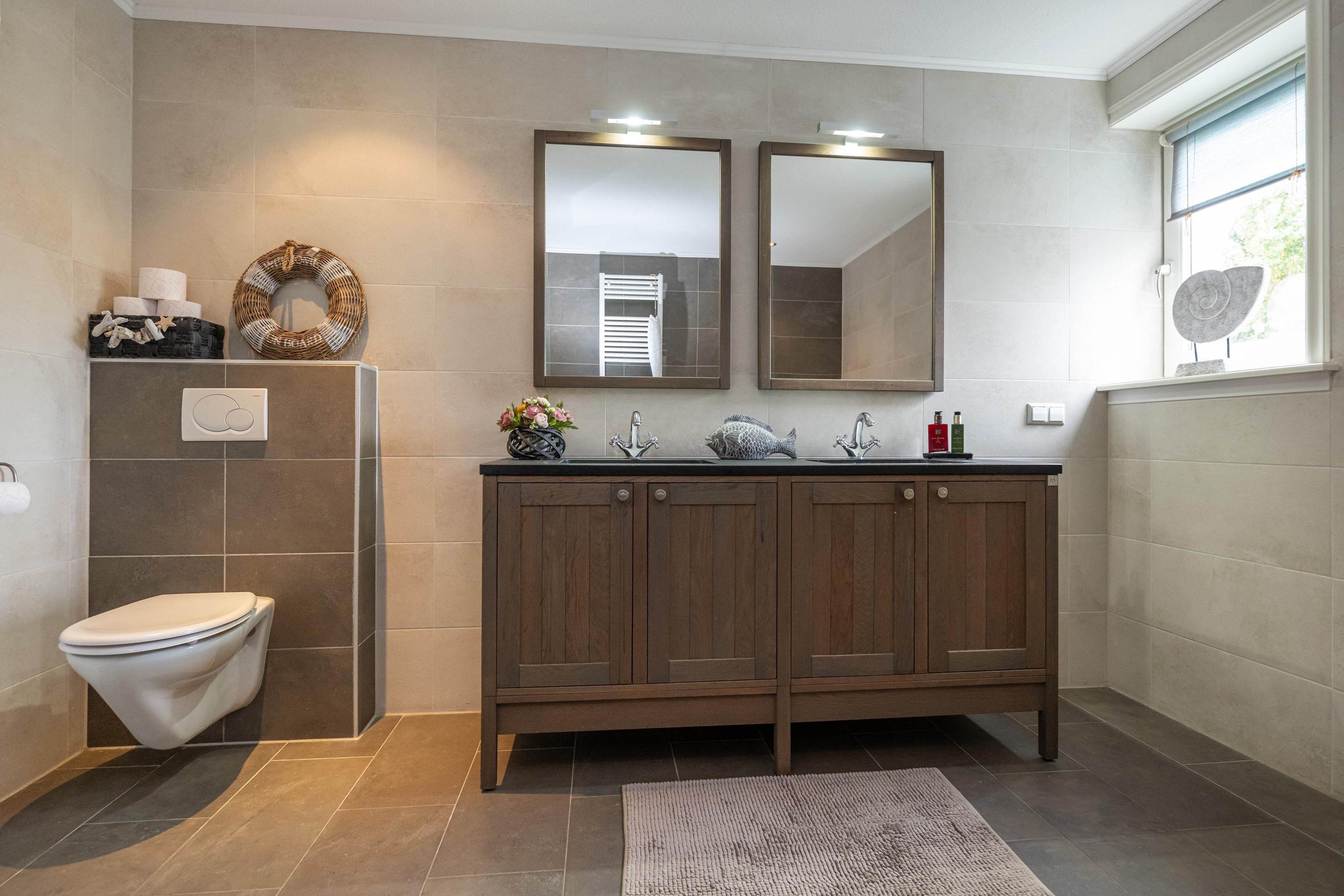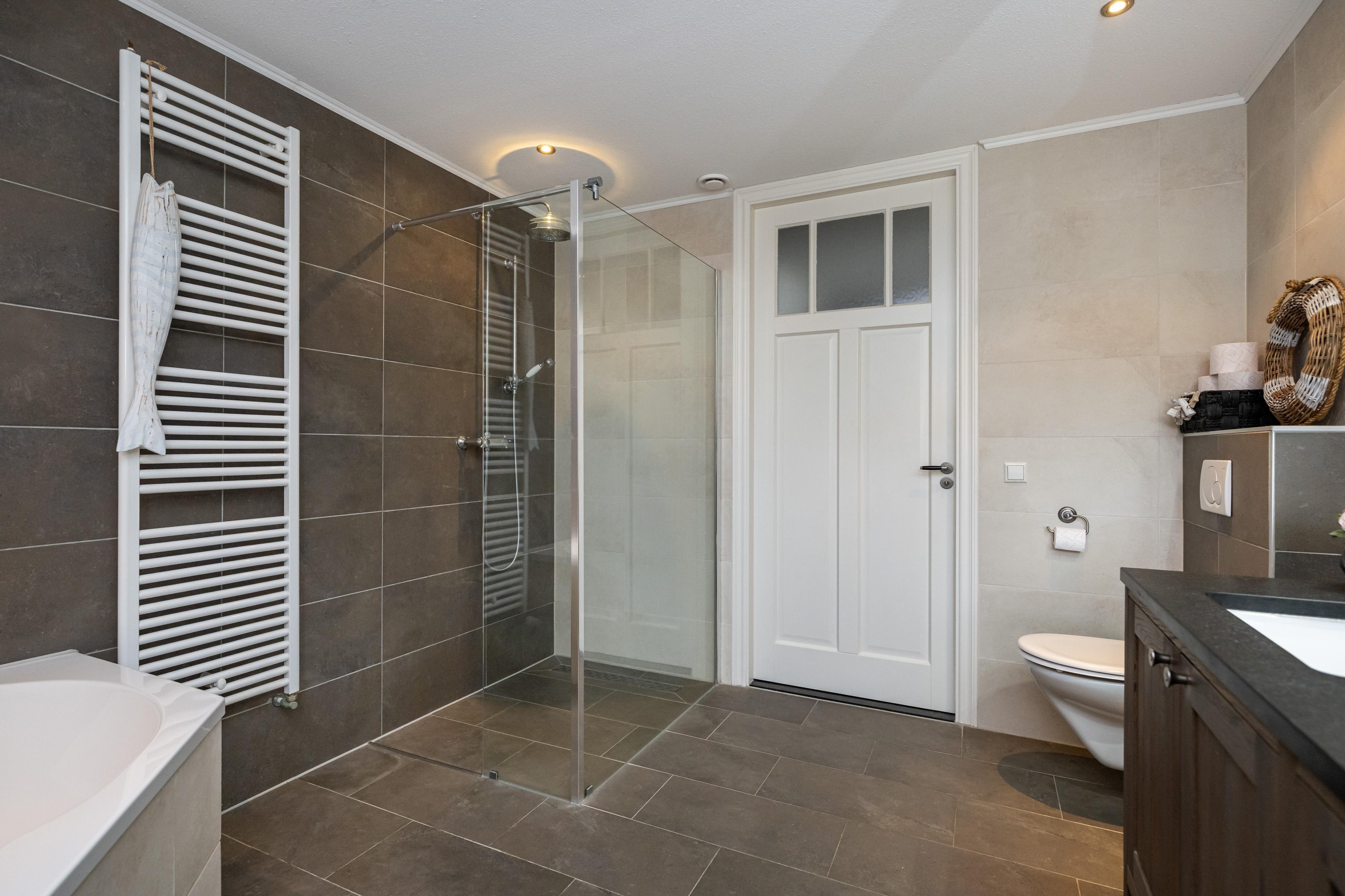 Plavuizenvloer, inloopdouche, dubbele wastafel met meubel, spiegel met verlichting, zwevend toilet, ligbad, handdoeken radiator, geheel betegeld, spots in plafond, draai/kiep raam en mechanische ventilatie.