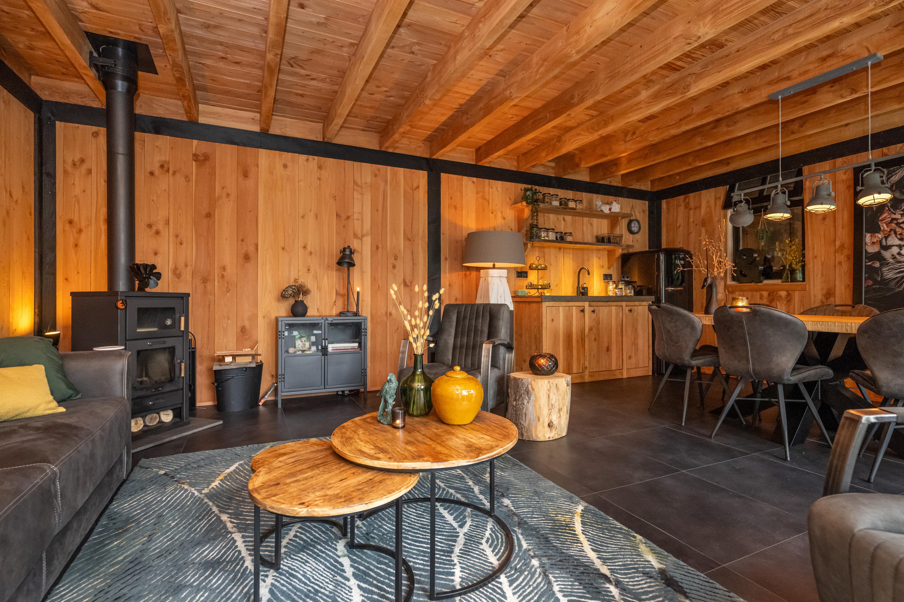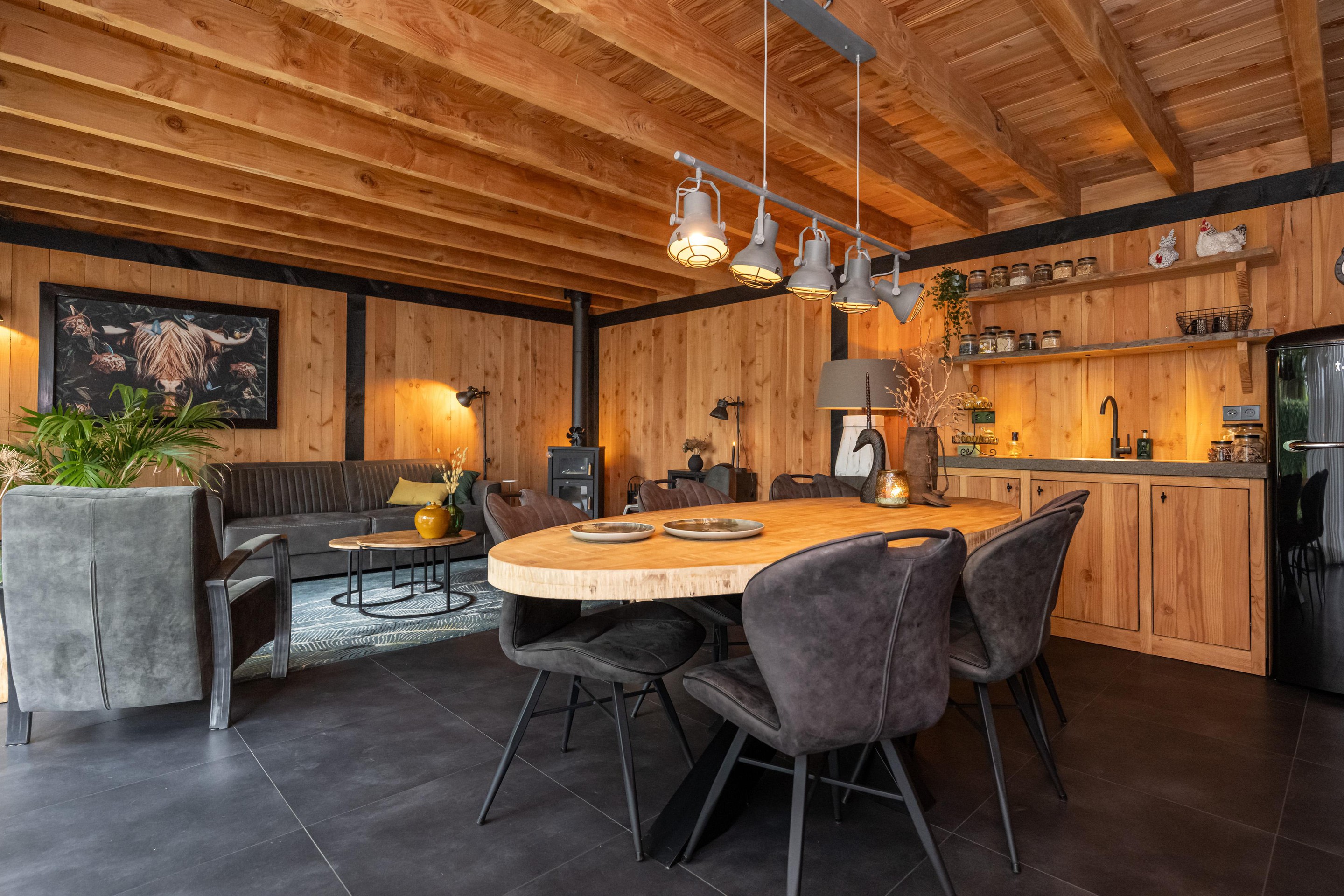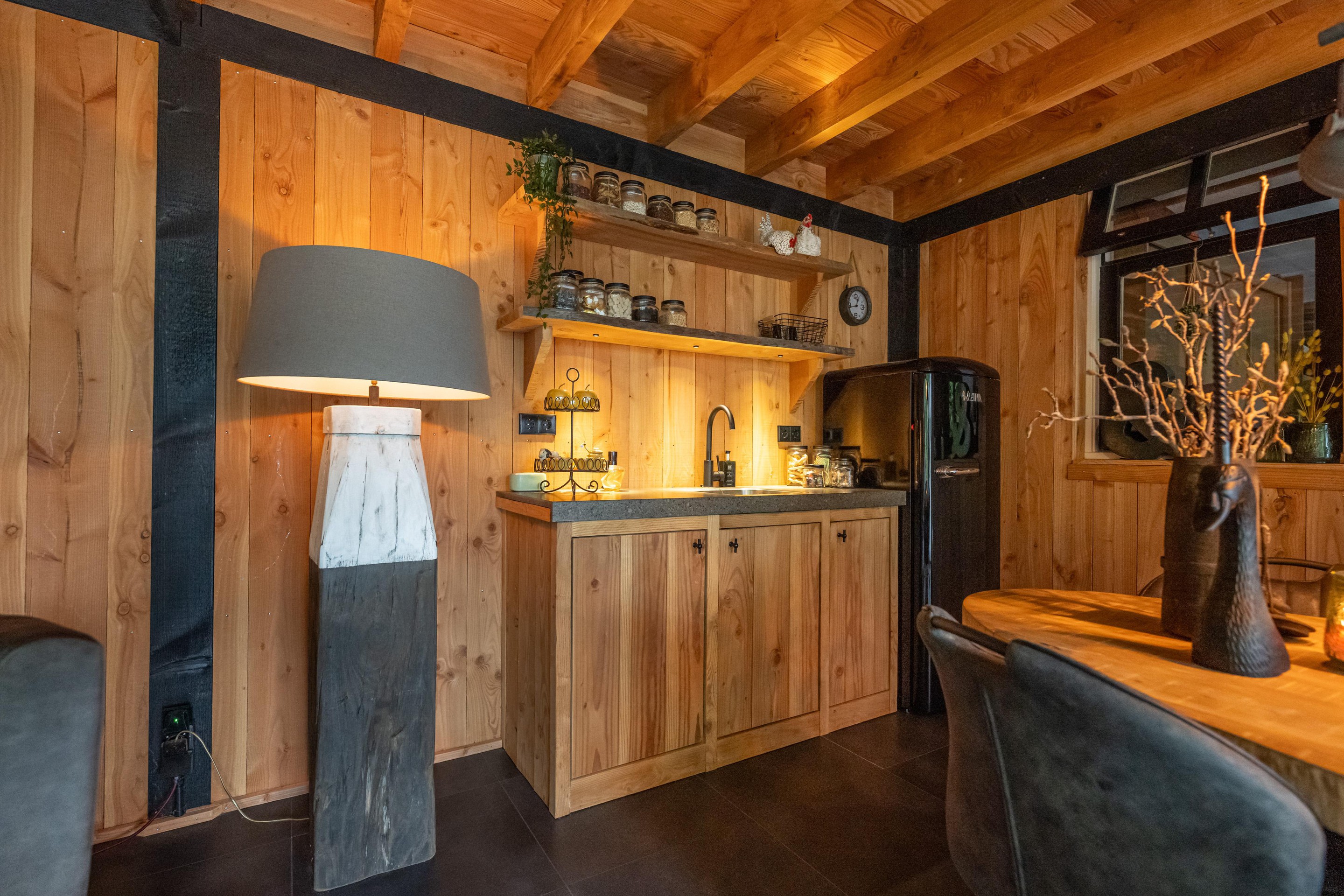 PVC vloer, geïsoleerd, keukenblok, spoelbak met koud water, elektra, verlichting, houtkachel met ovenfunctie, kastenwand met schuifdeuren en spots in luifel.