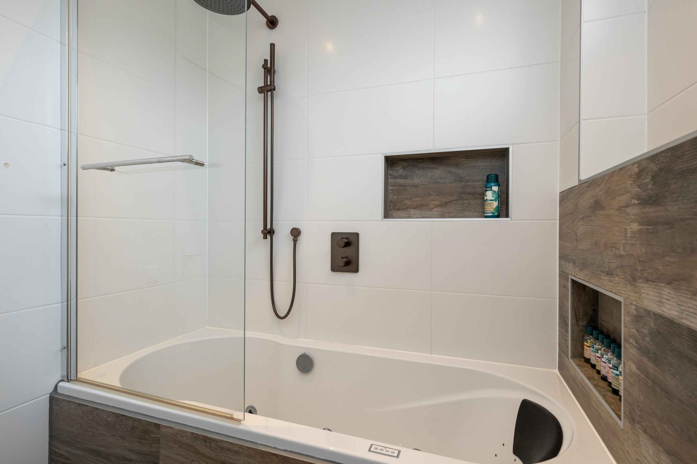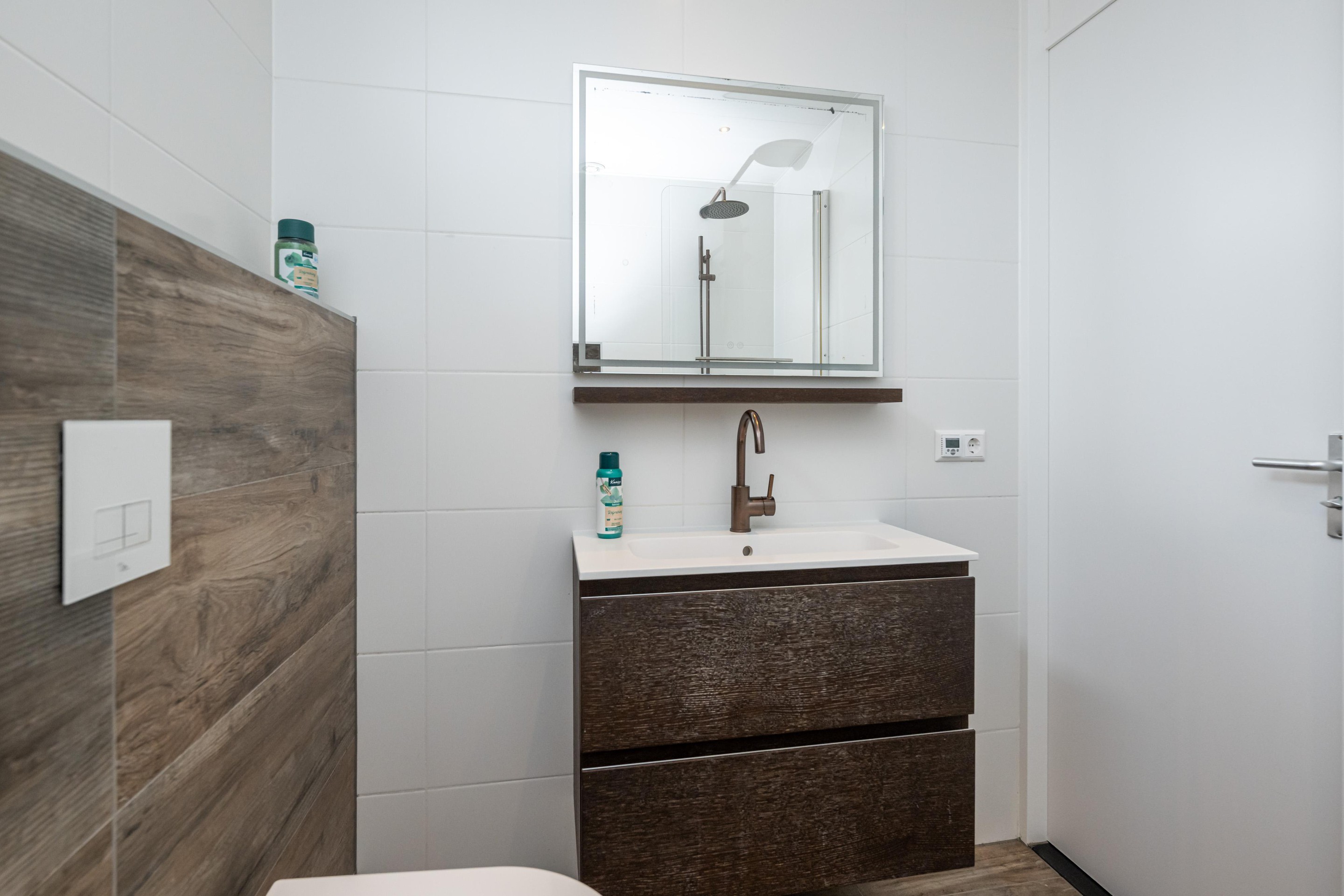 Plavuizenvloer met elektrische vloerverwarming, wastafel met meubel, badkamerspiegel met verlichting en anti-condens verwarming, mechanische ventilatie, zwevend toilet, douchen in een bad met whirlpoolfunctie en lichttherapie, spots in plafond, elektrische afzuiging en een elektrisch uitzetraam.