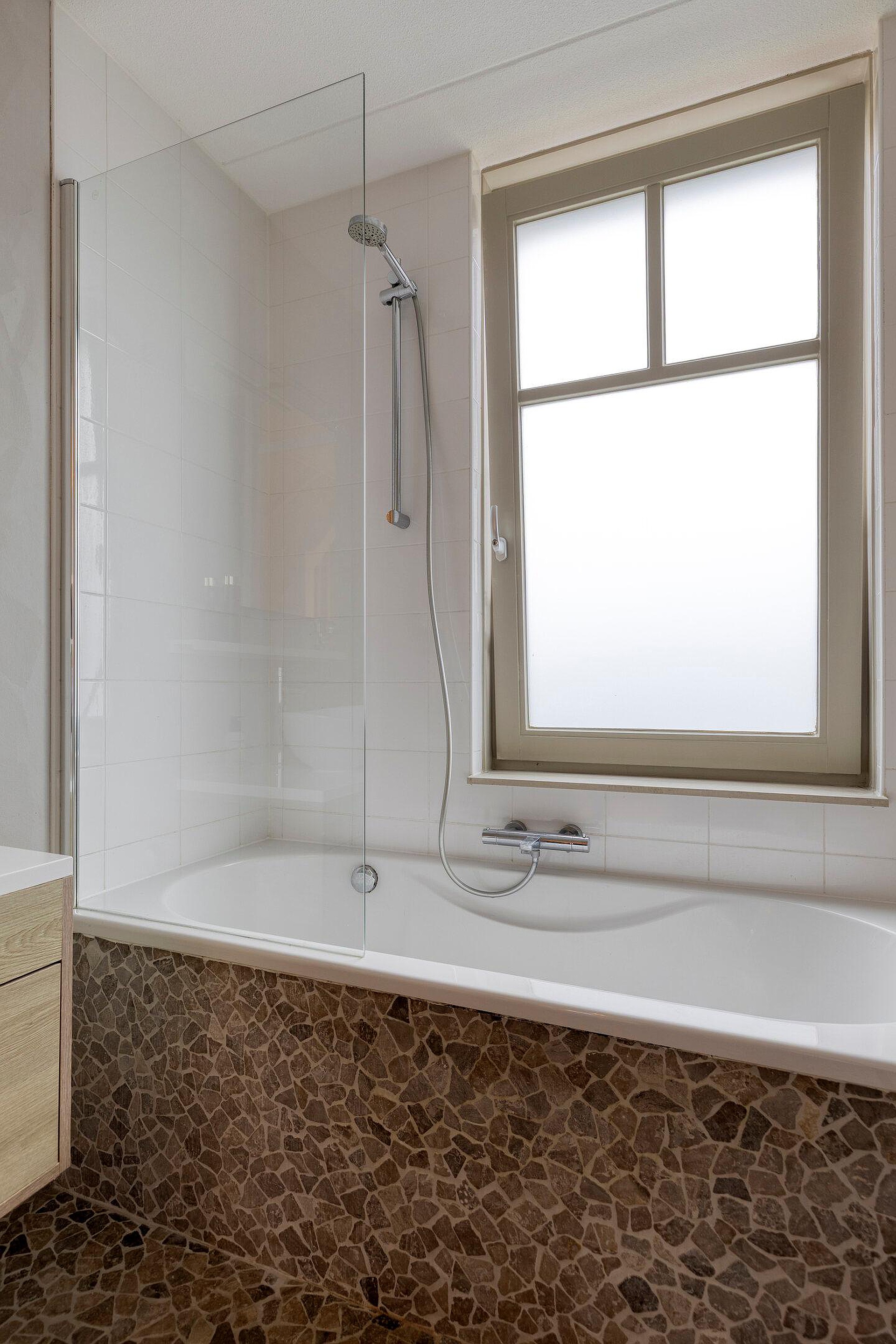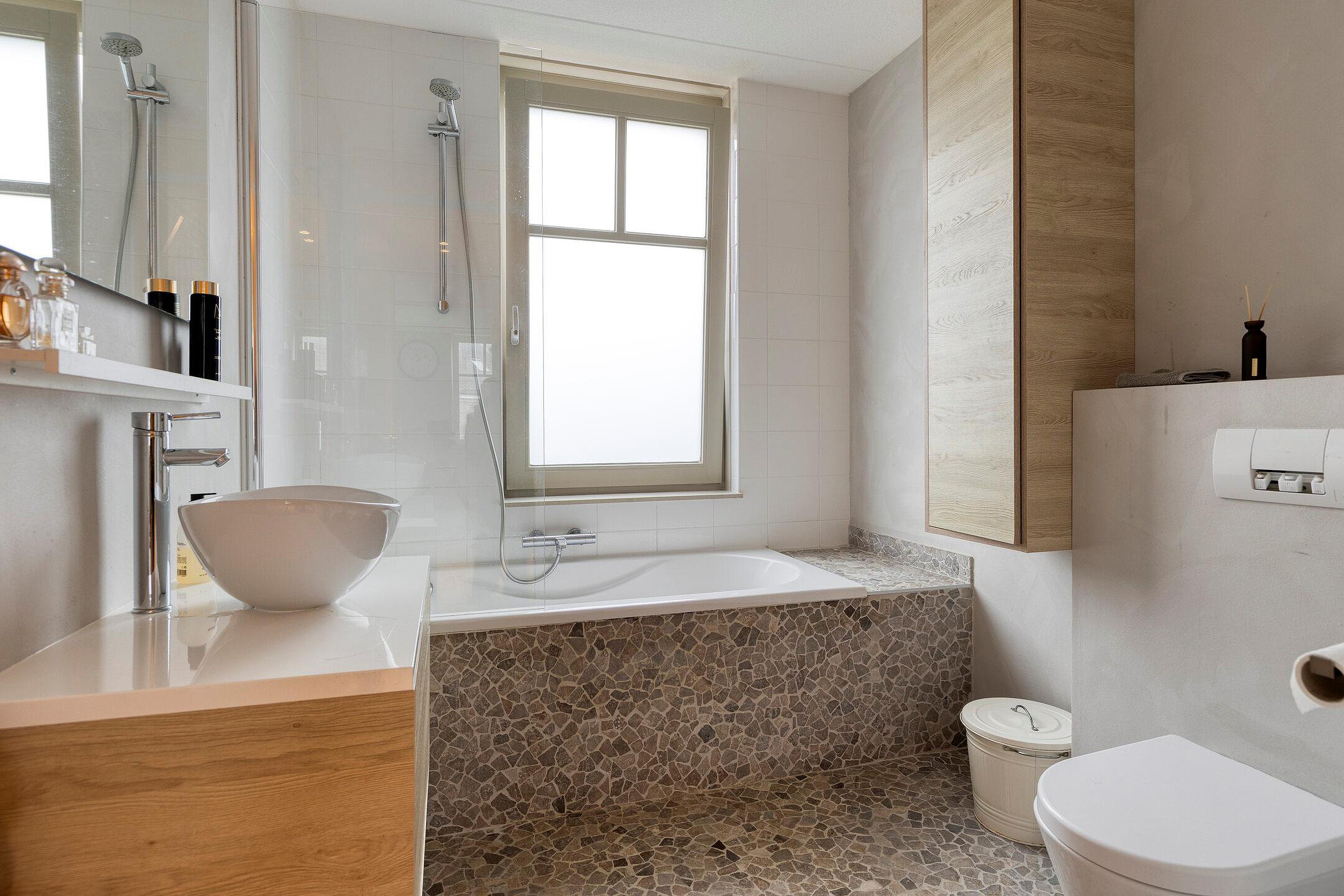 De luxe badkamer straalt rust en kwaliteit uit en is voorzien van een ligbad, modern sanitair en een stijlvolle afwerking. Een plek om echt even te ontspannen.
