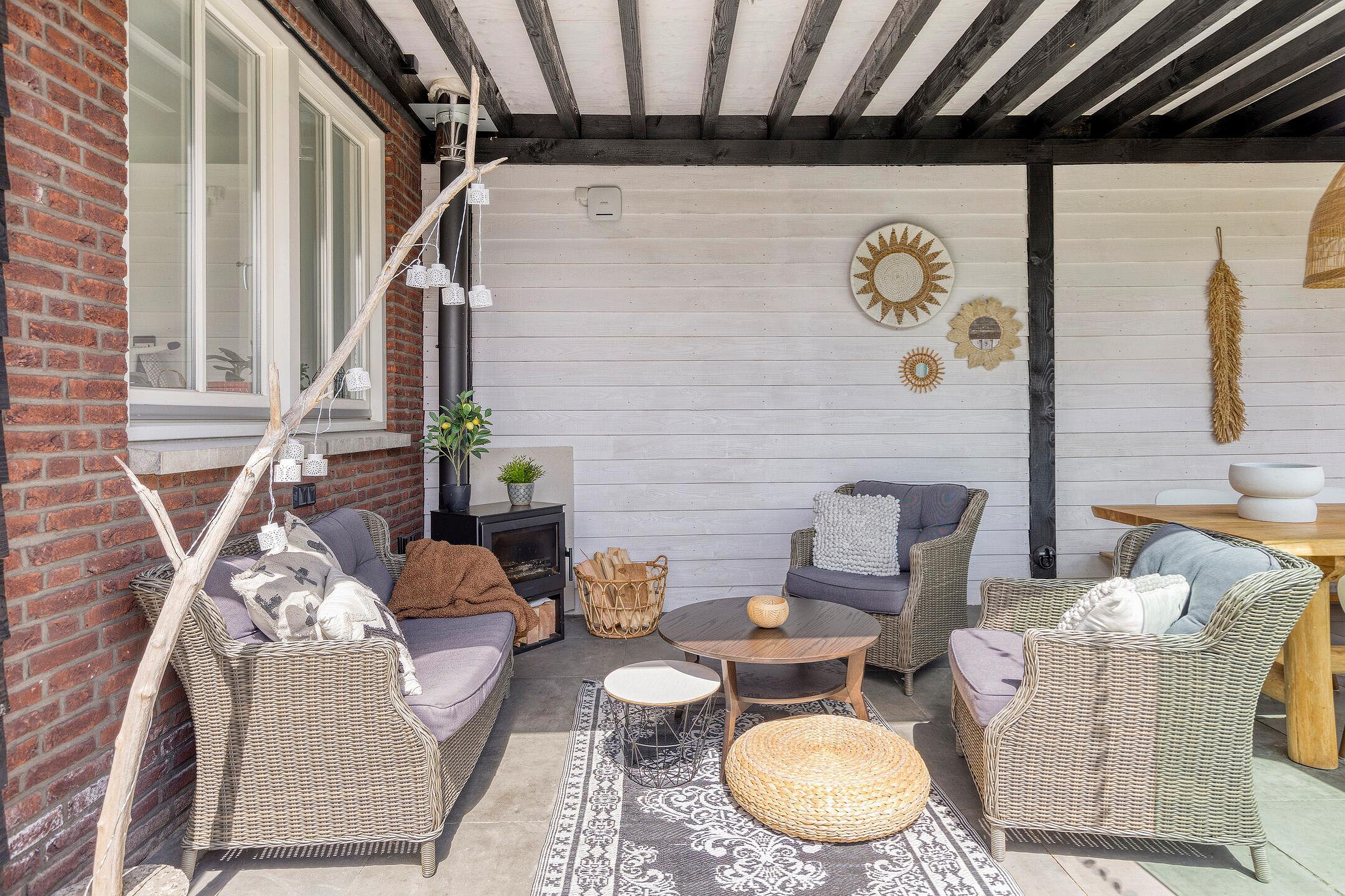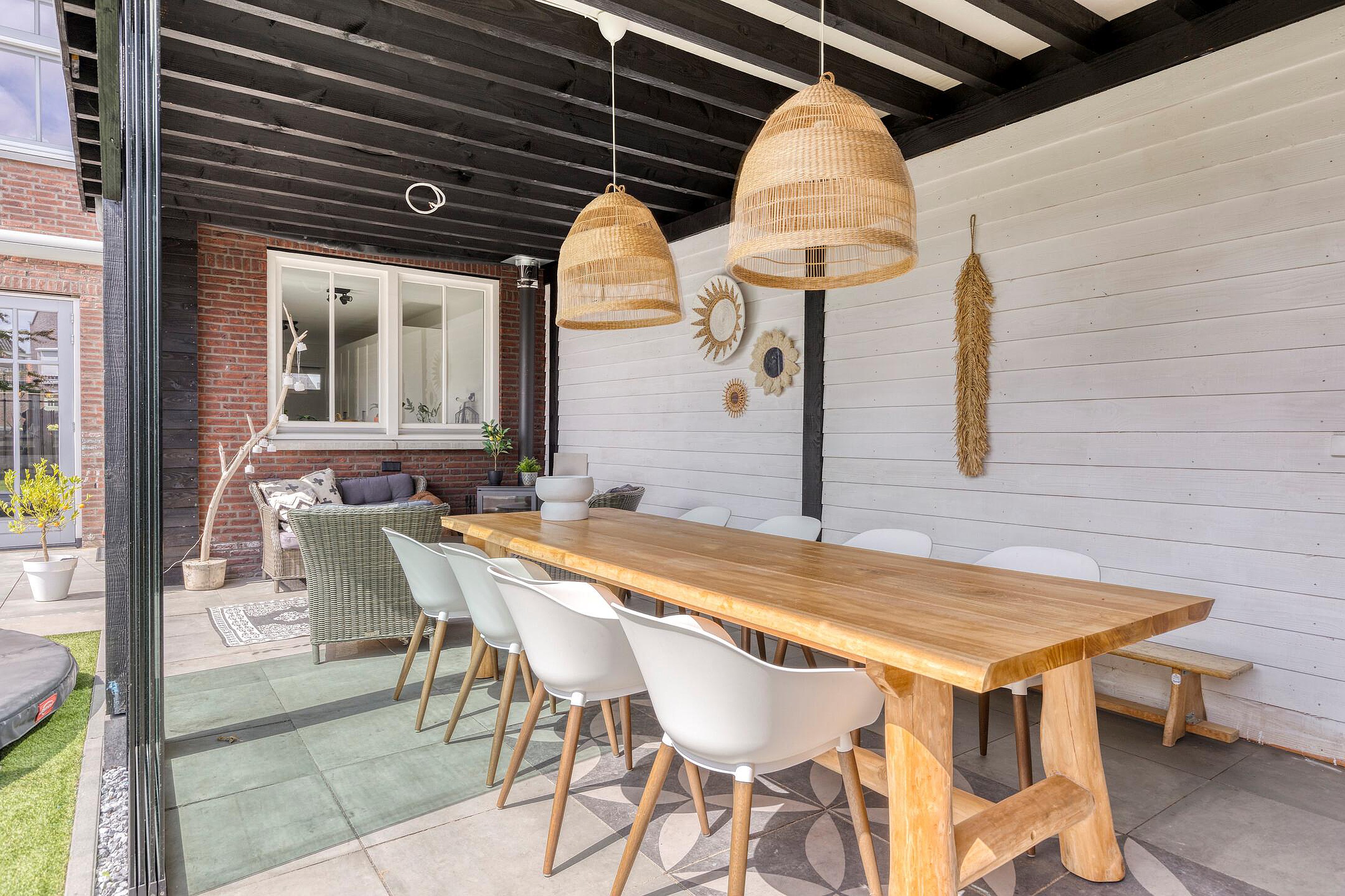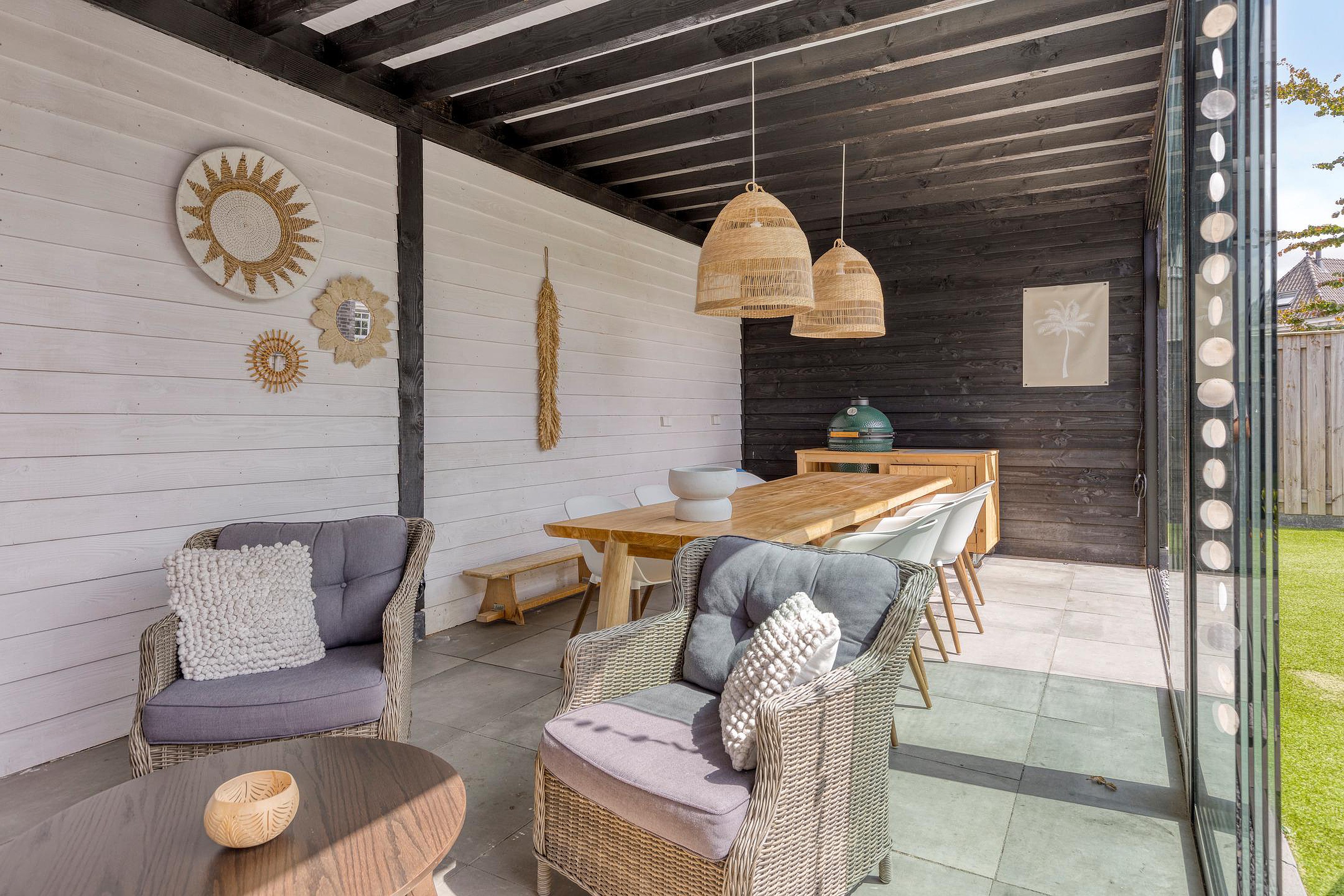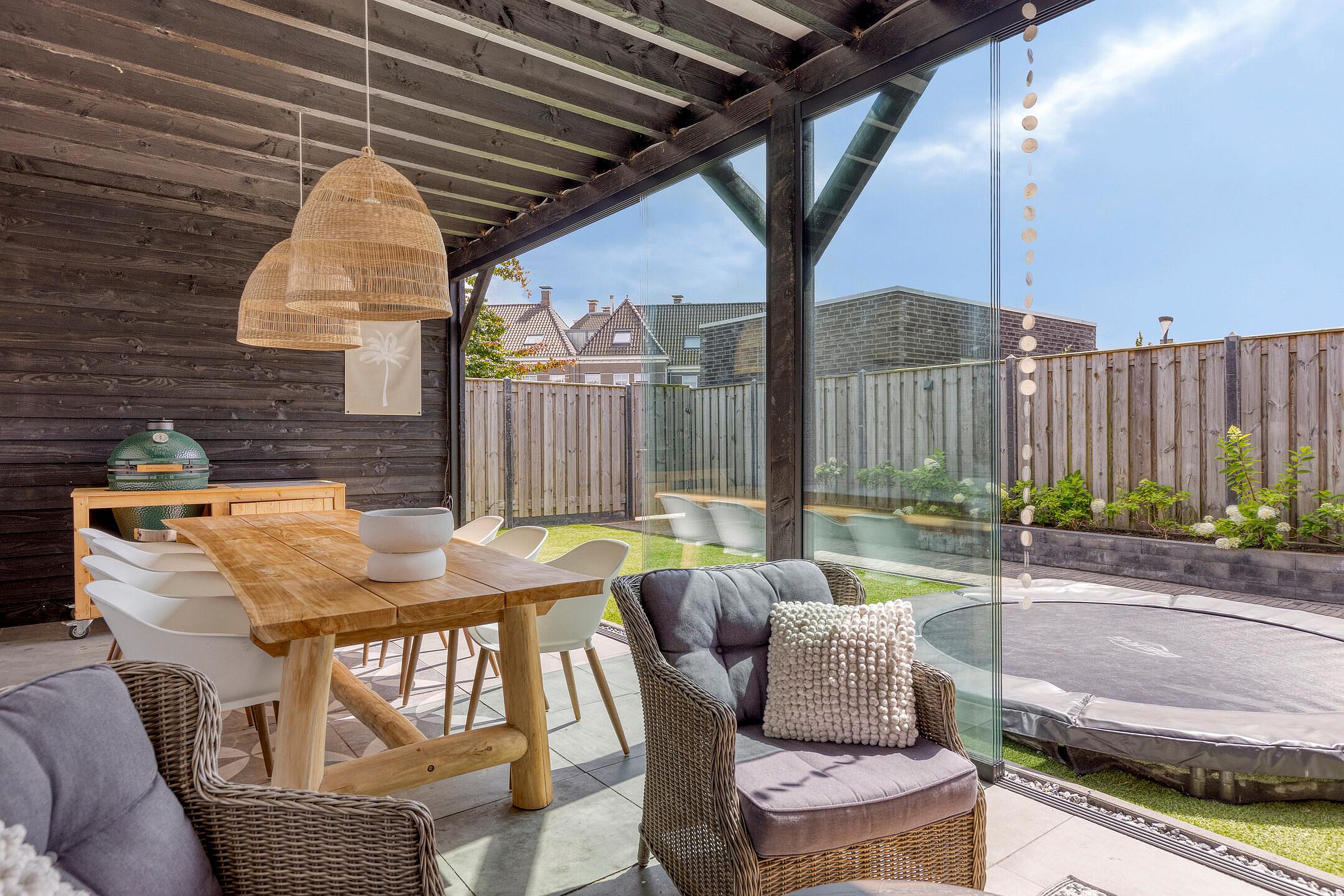 Een absolute blikvanger is de moderne, royale overkapping aan de achterzijde van de woning. Deze sfeervolle aanbouw is volledig afsluitbaar met glazen schuifpanelen en heeft een houtkachel en daardoor het hele jaar door te gebruiken. De ruimte is groot genoeg voor een eettafel voor het hele gezin, perfect voor lange diners, spelletjesavonden of als extra leefruimte. Een heerlijke plek waar binnen en buiten naadloos in elkaar overlopen.