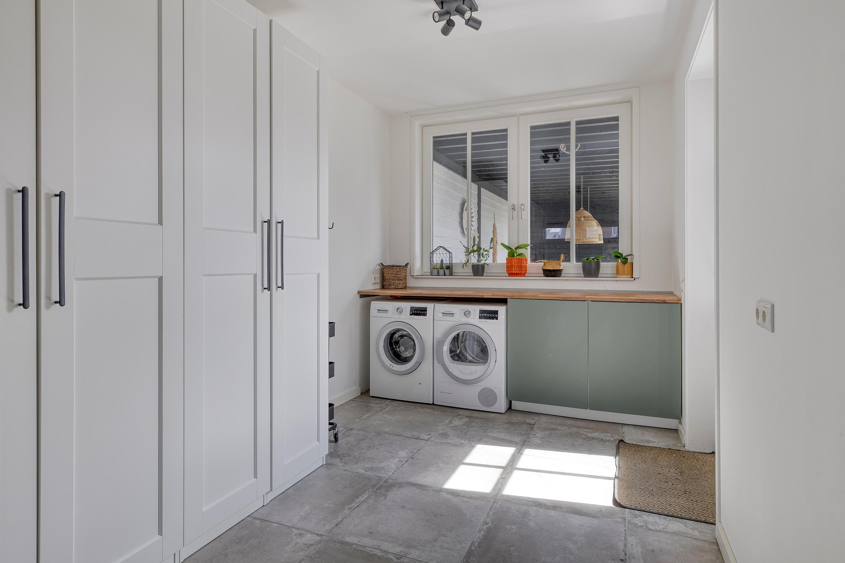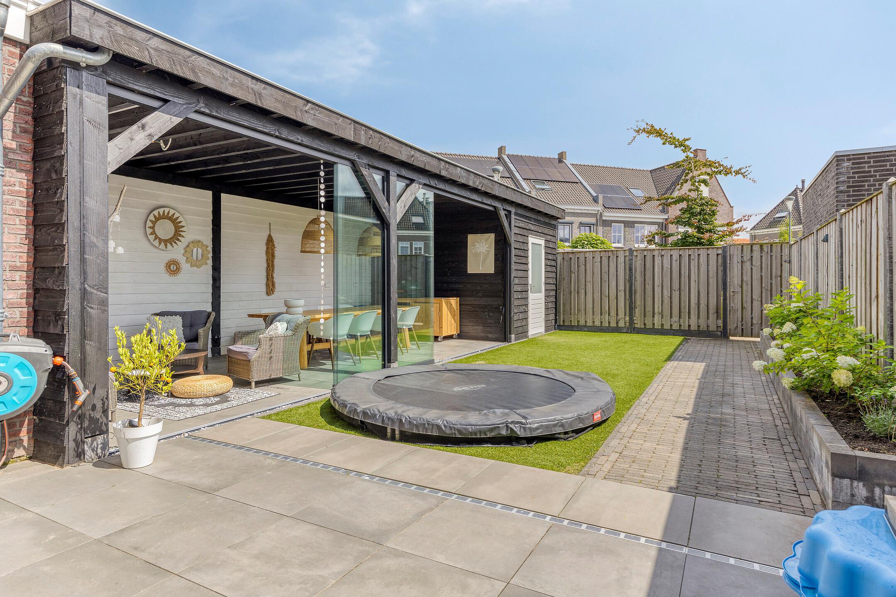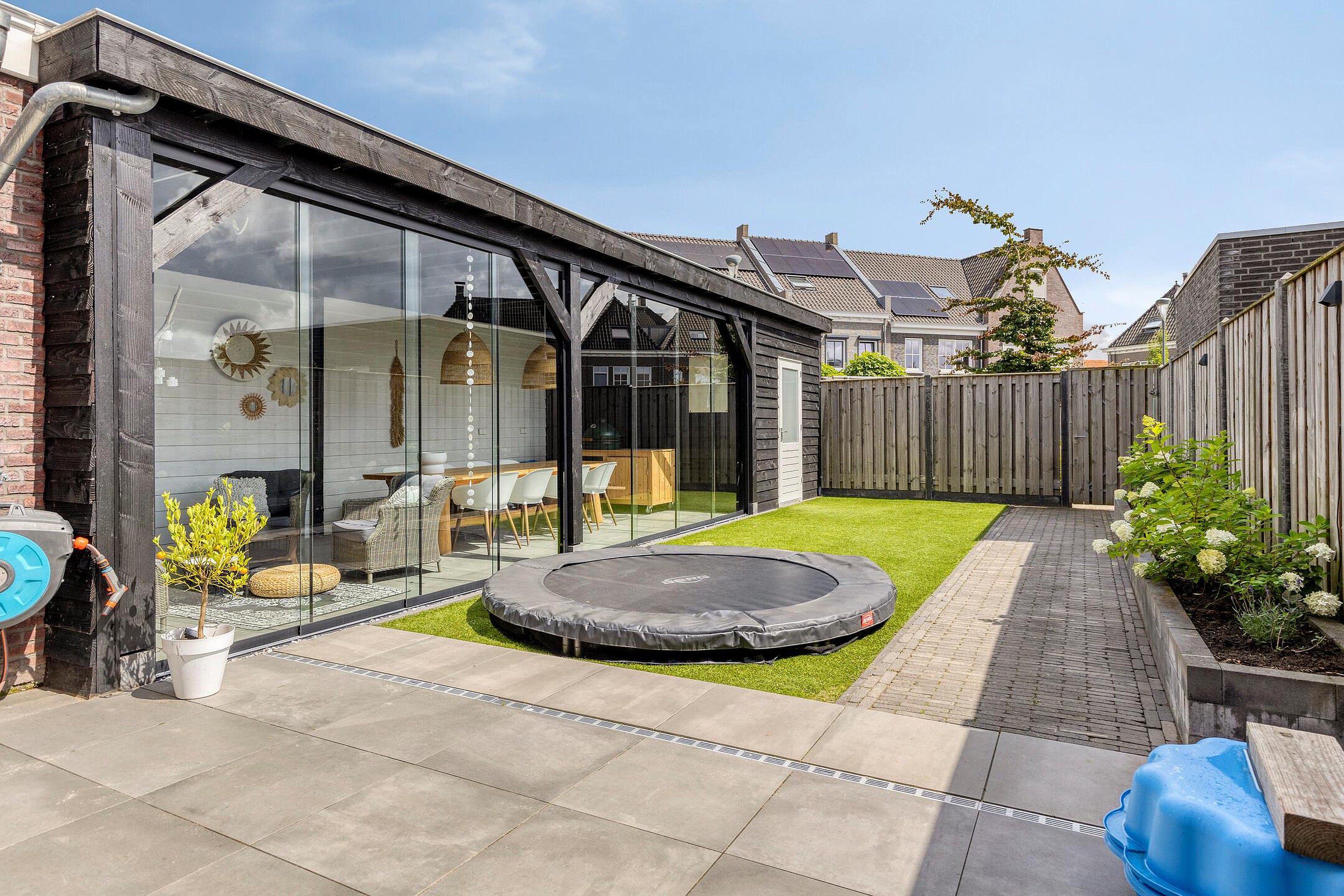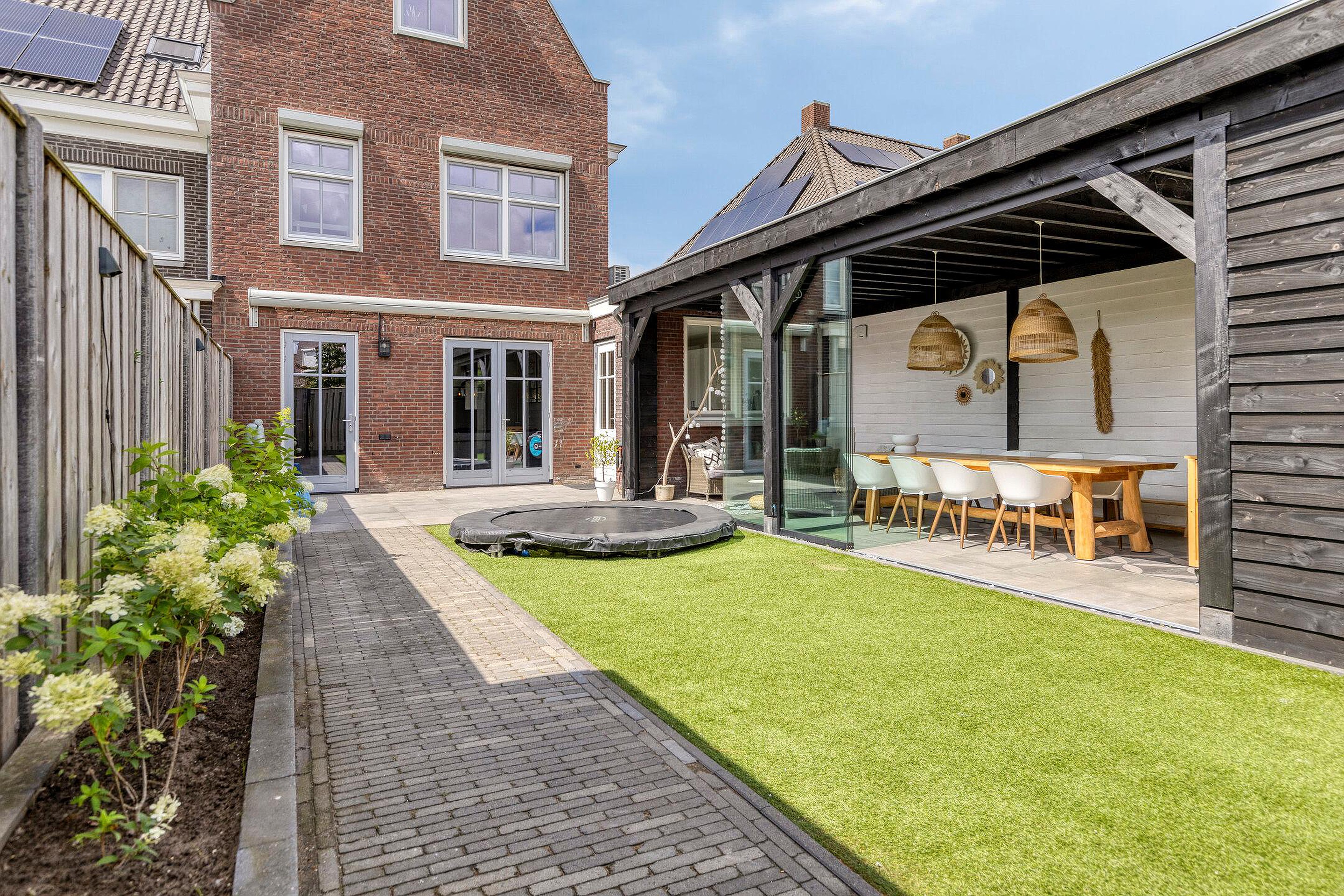 Een absolute blikvanger is de moderne, royale overkapping aan de achterzijde van de woning. Deze sfeervolle aanbouw is volledig afsluitbaar met glazen schuifpanelen en heeft een houtkachel en daardoor het hele jaar door te gebruiken. De ruimte is groot genoeg voor een eettafel voor het hele gezin, perfect voor lange diners, spelletjesavonden of als extra leefruimte. Een heerlijke plek waar binnen en buiten naadloos in elkaar overlopen.