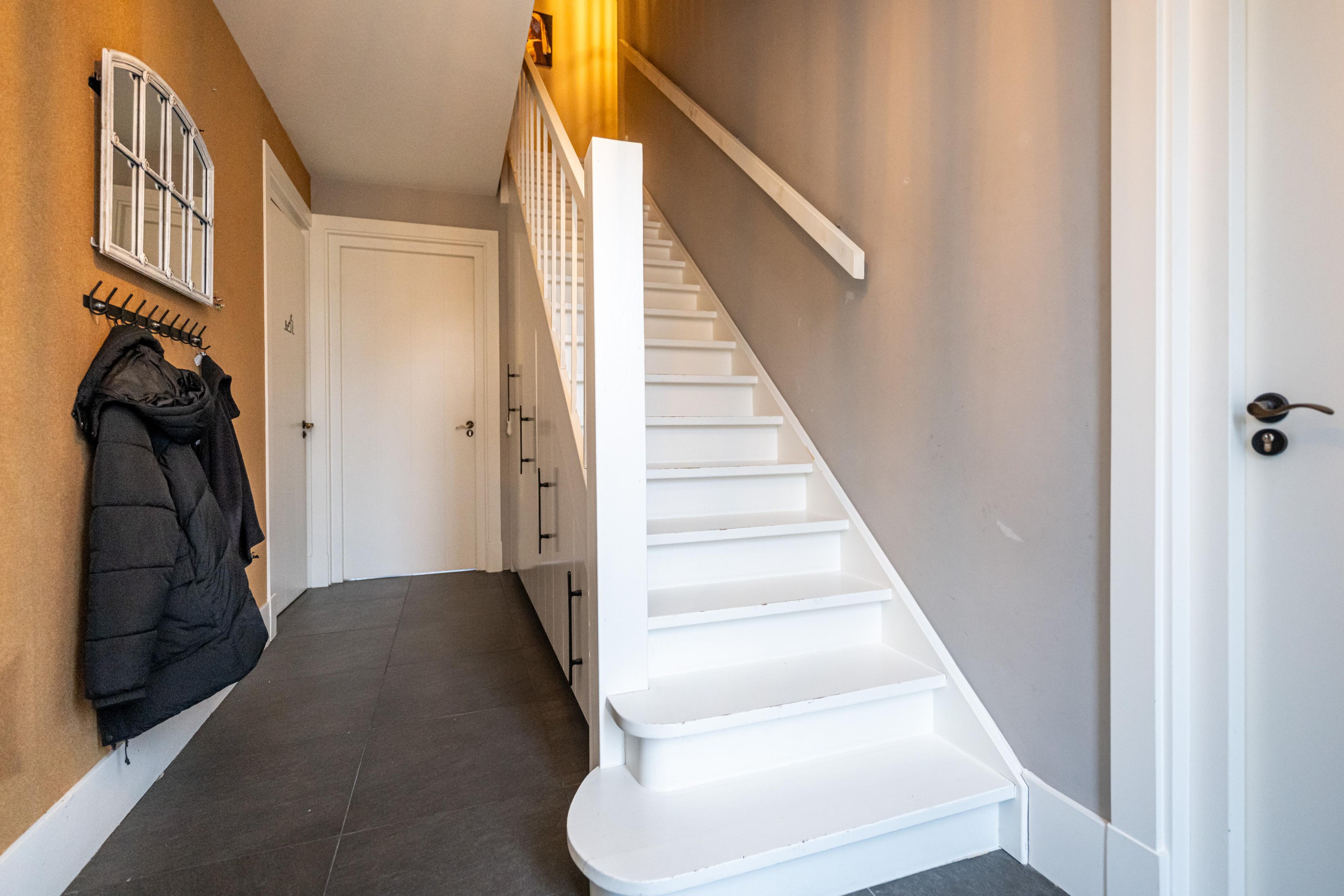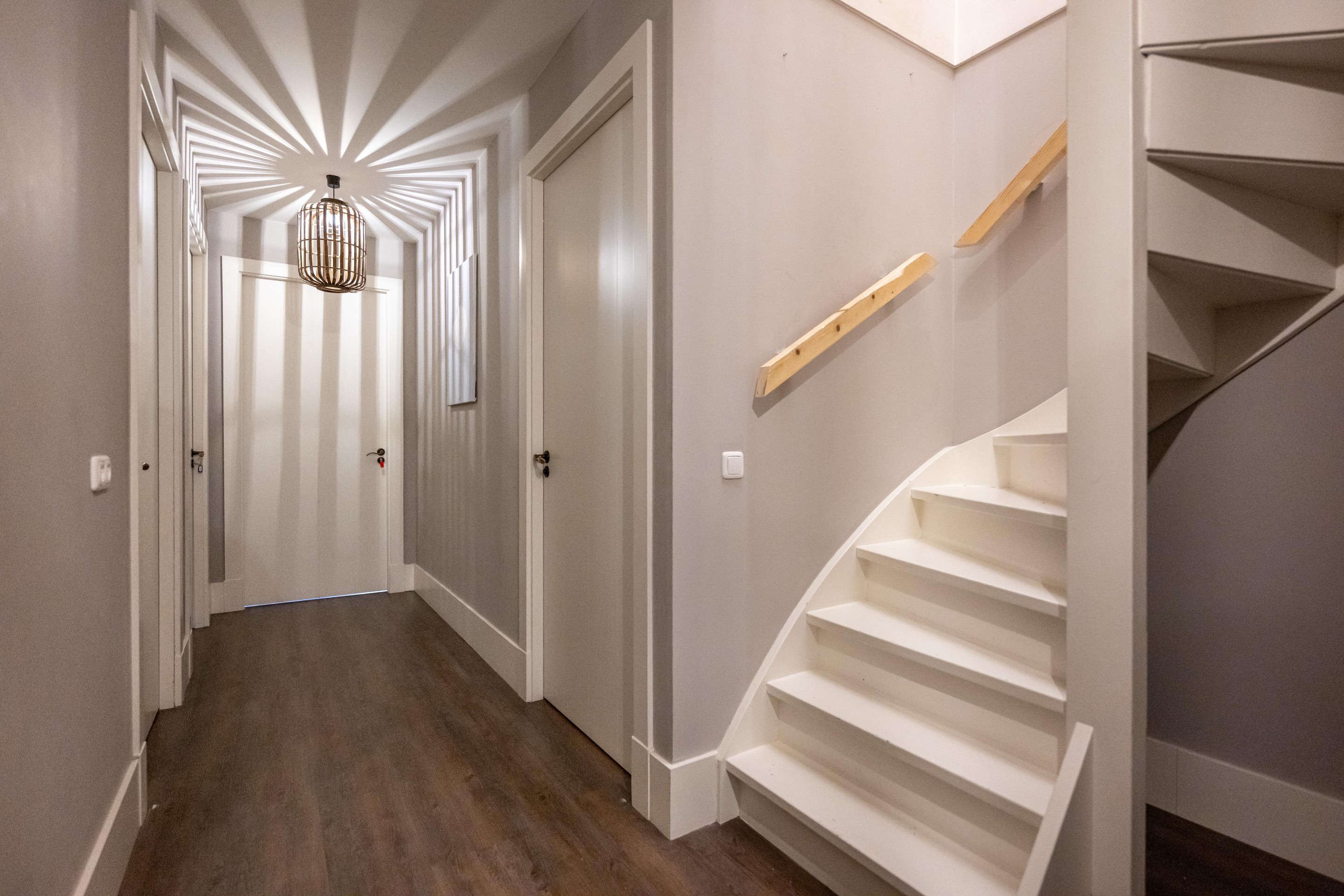 Plavuizen vloer met vloerverwarming, trapopgang, trapkast met schuiflades en groepenkast.
