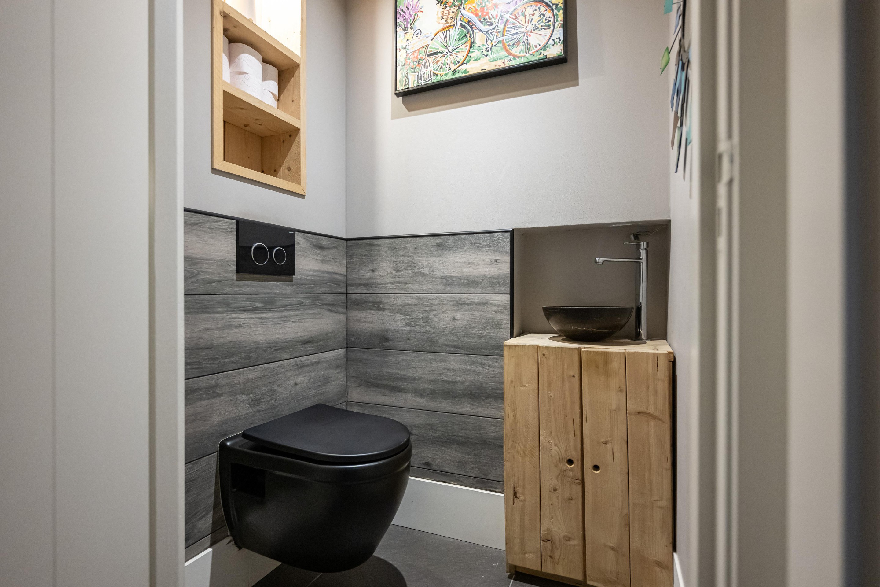 Plavuizen vloer met vloerverwarming, half betegeld, fontein, mechanische afzuiging en spots in plafond.