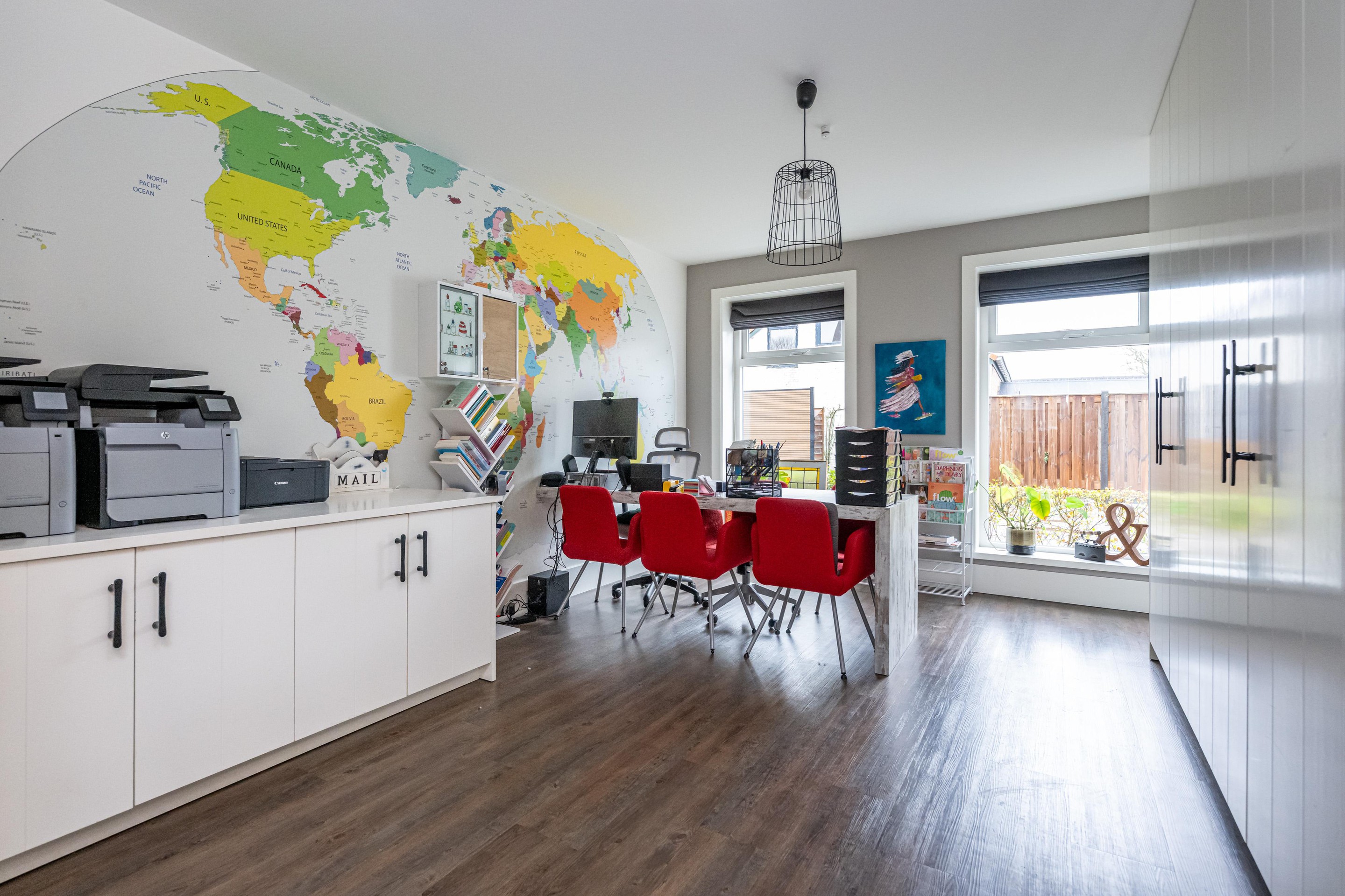 PVC vloer met vloerverwarming, vast bureau en vaste kastenwand.