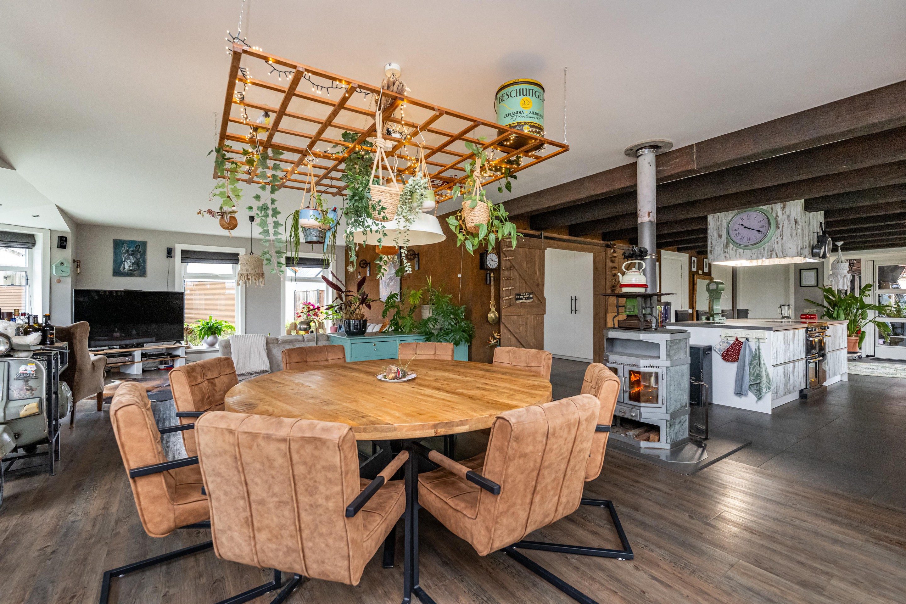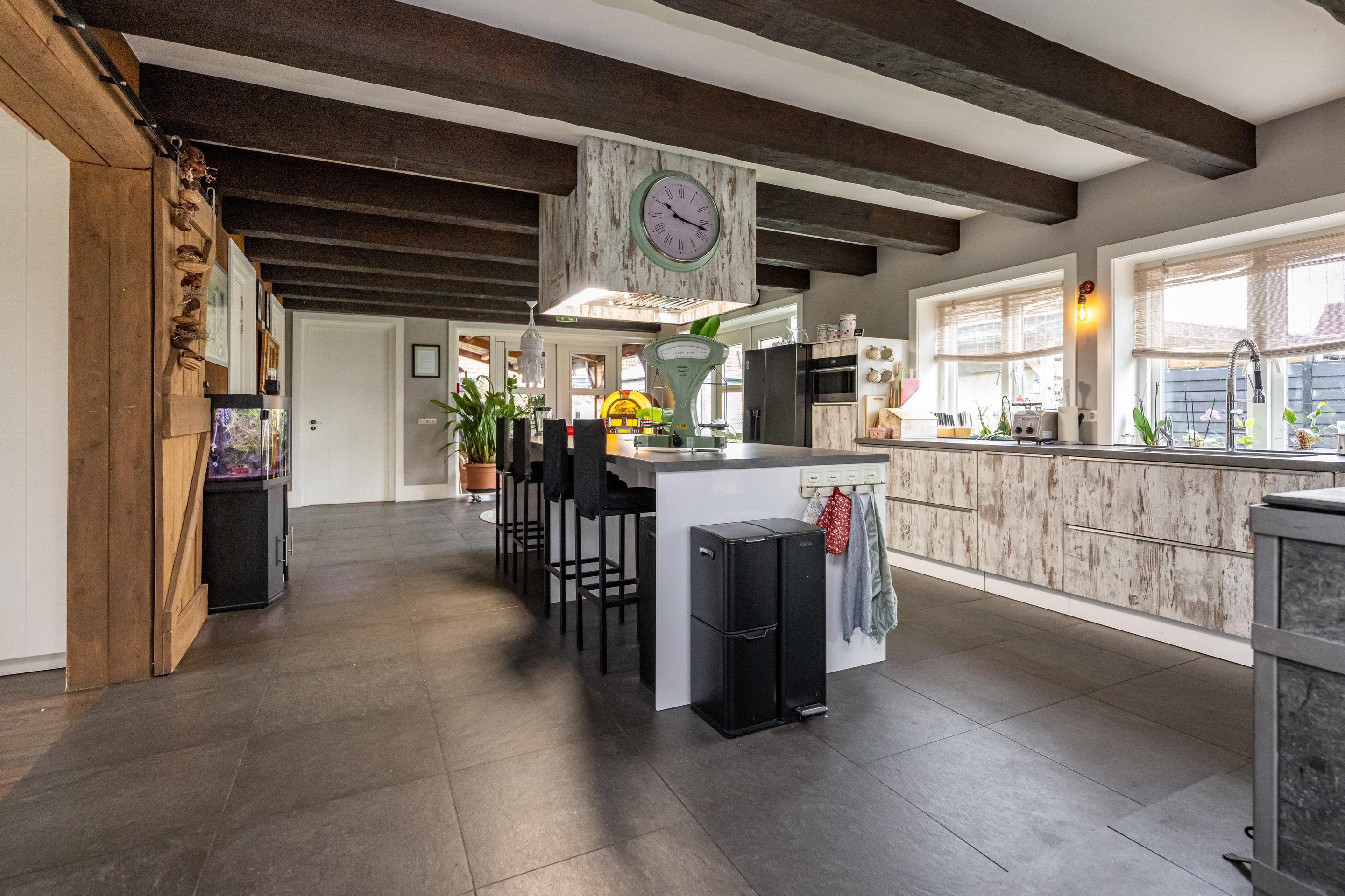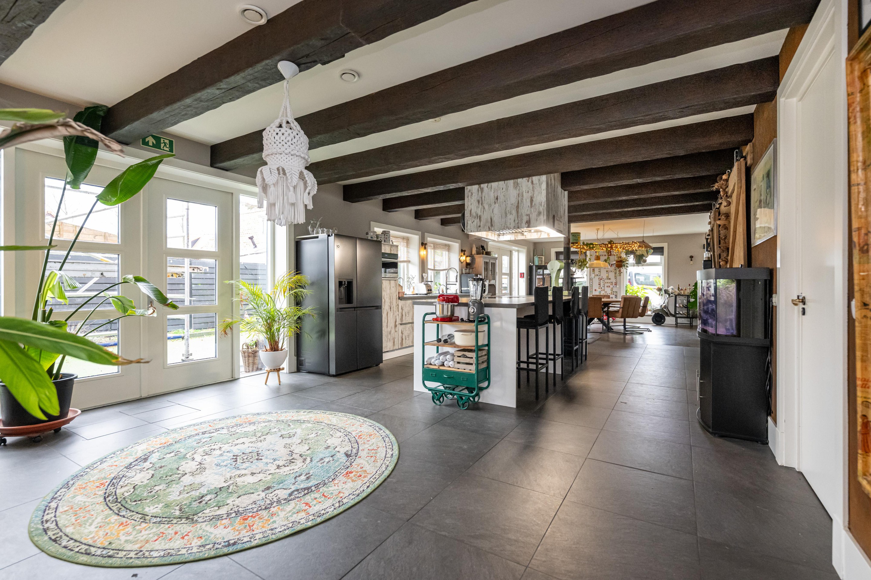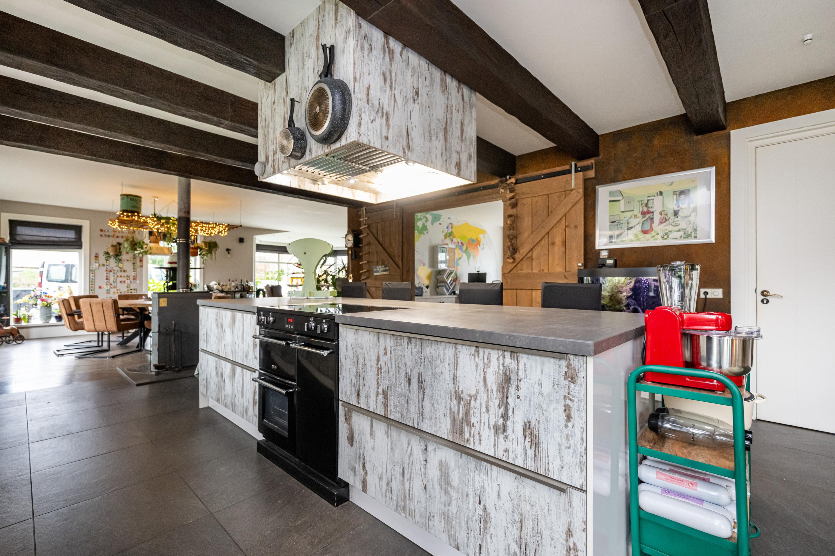 Plavuizen vloer met vloerverwarming, kookeiland met 4 barkrukken, Belling Farmhouse 90Ei – 90 cm breed inductie rangefornuis met drie ovens, grillfunctie, vier inductiezones en een warmhoudplaat, afzuigkap, spoelbak met RVS keukenkraan met veermechanisme, dubbele bediening en uittrekbare sproeikop, vaatwasser, koelkast, combi-oven, Amerikaanse koelkast met water- en ijsdispenser, speksteen houtkachel, openslaande deuren naar tuin en openslaande deuren naar overkapping.