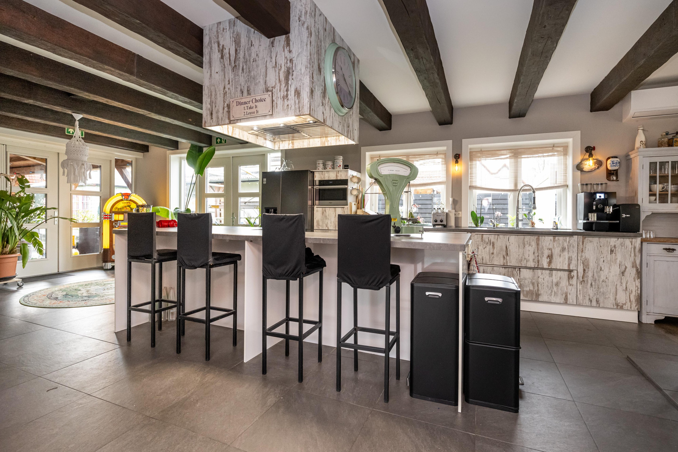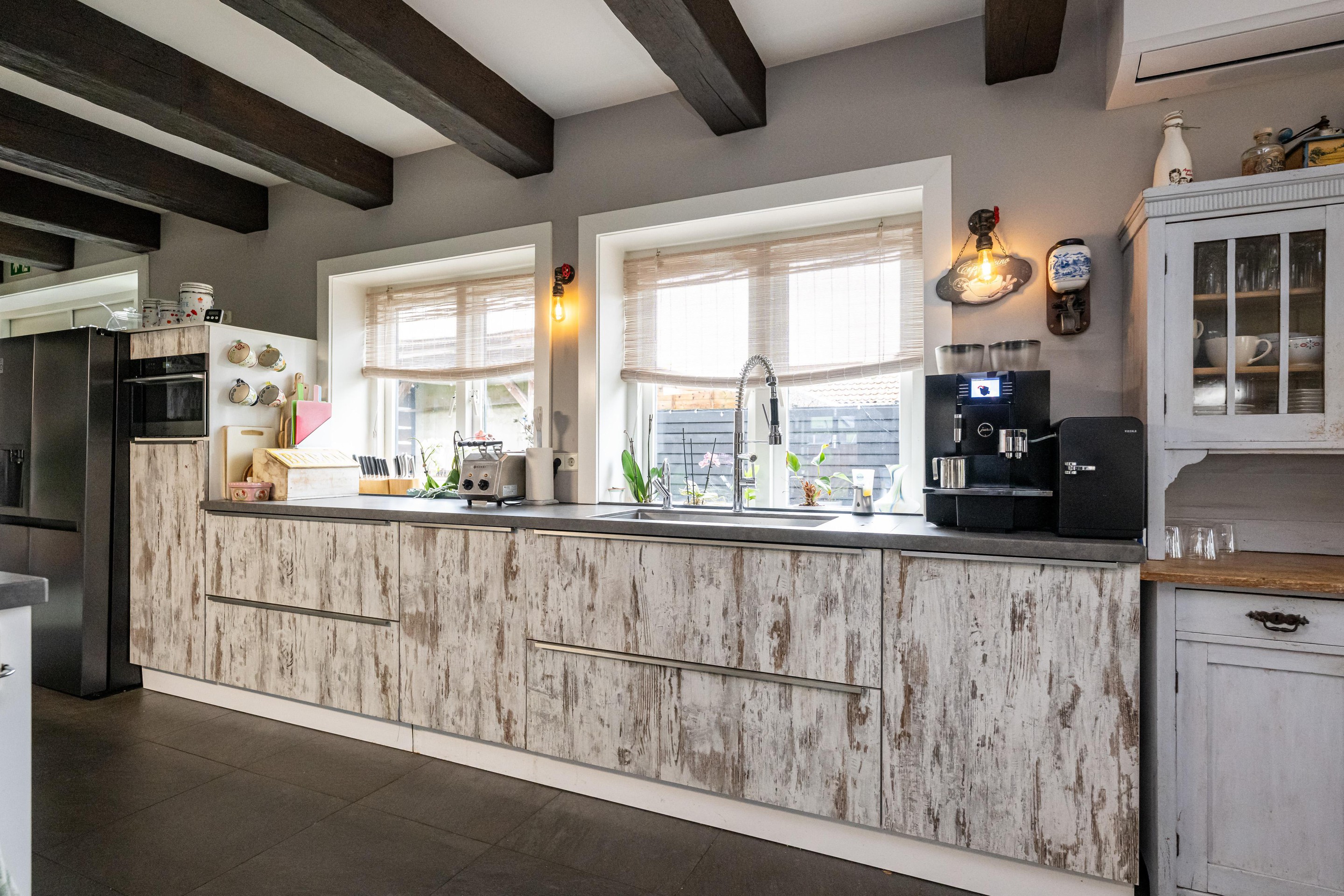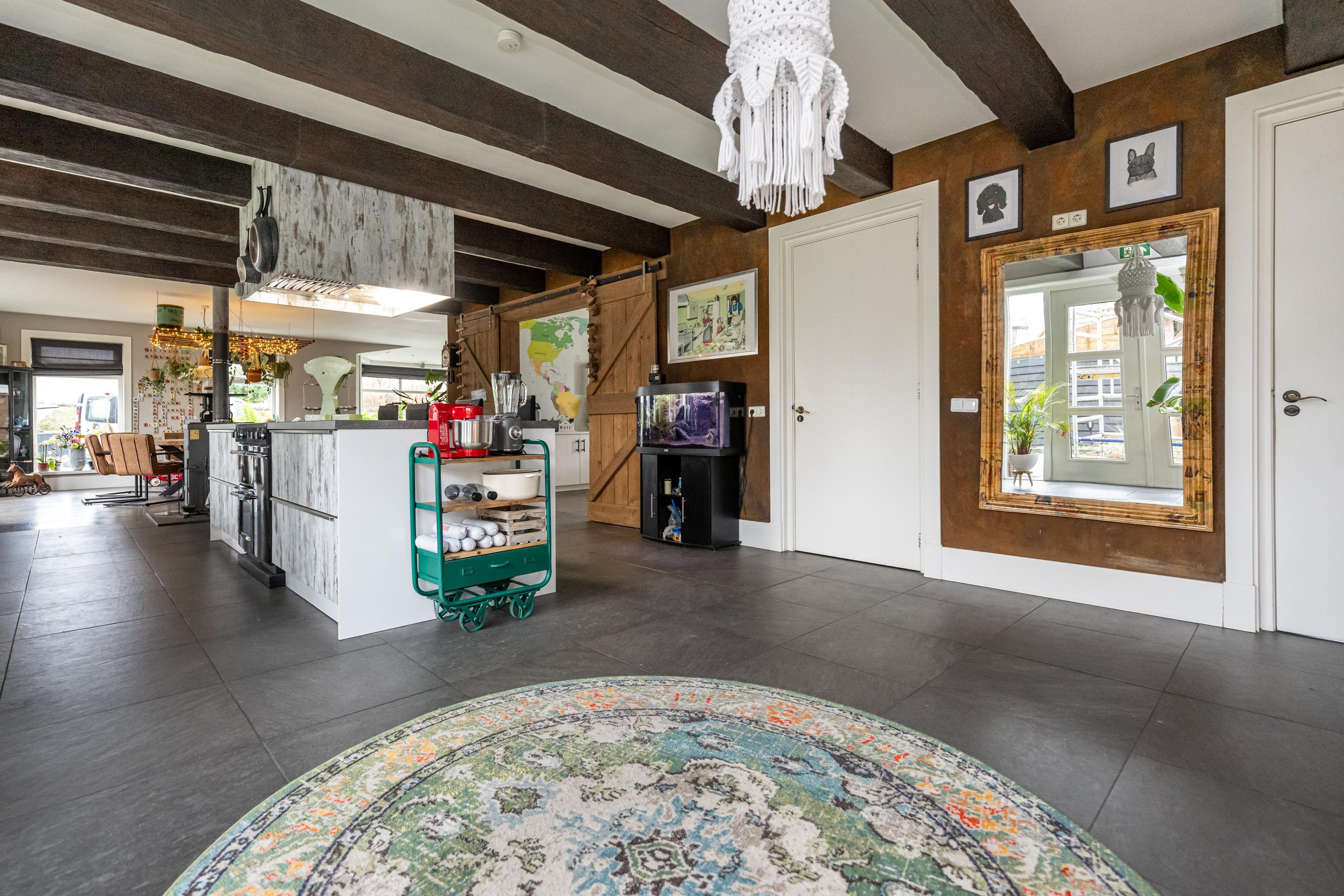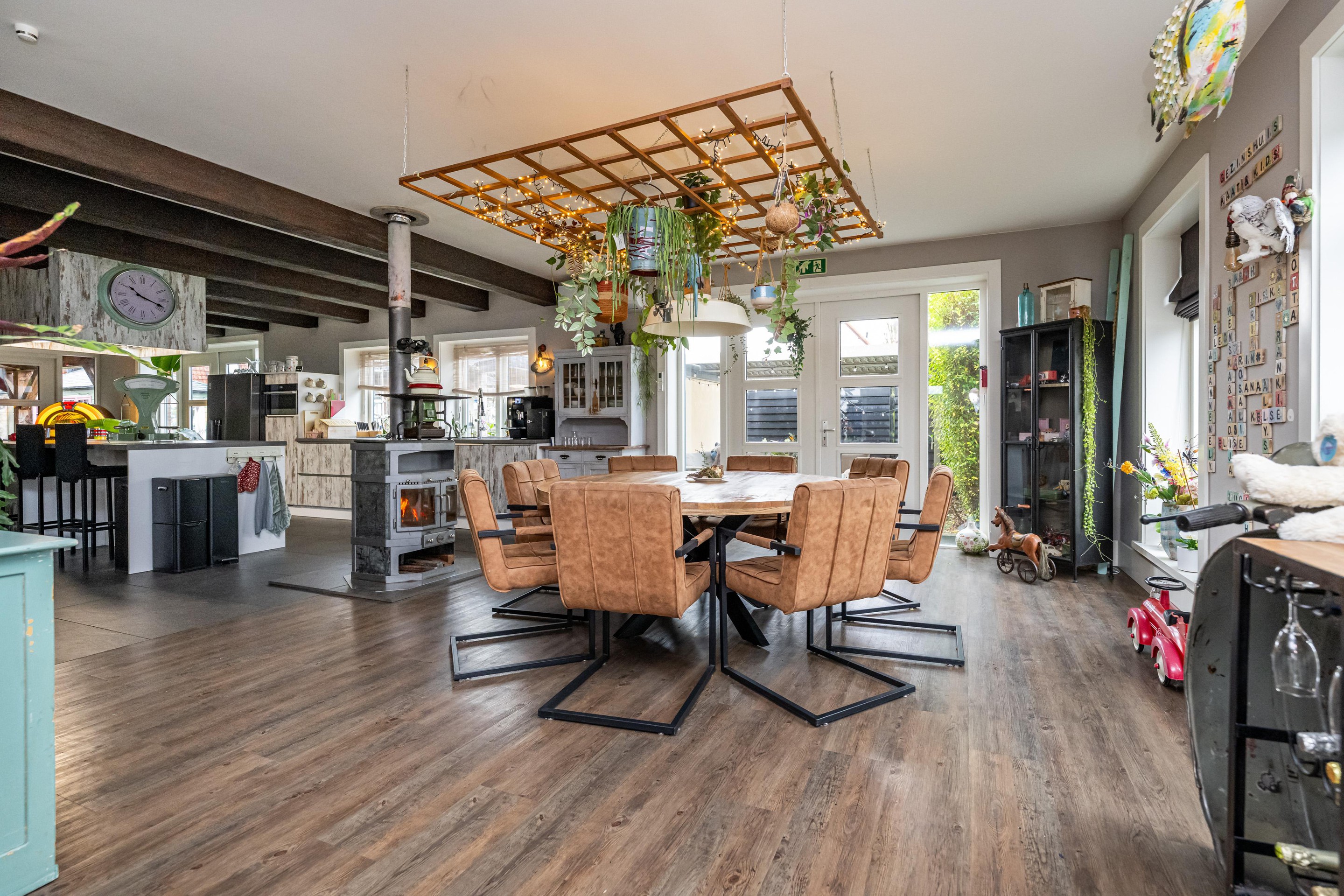 Plavuizen vloer met vloerverwarming, kookeiland met 4 barkrukken, Belling Farmhouse 90Ei – 90 cm breed inductie rangefornuis met drie ovens, grillfunctie, vier inductiezones en een warmhoudplaat, afzuigkap, spoelbak met RVS keukenkraan met veermechanisme, dubbele bediening en uittrekbare sproeikop, vaatwasser, koelkast, combi-oven, Amerikaanse koelkast met water- en ijsdispenser, speksteen houtkachel, openslaande deuren naar tuin en openslaande deuren naar overkapping.