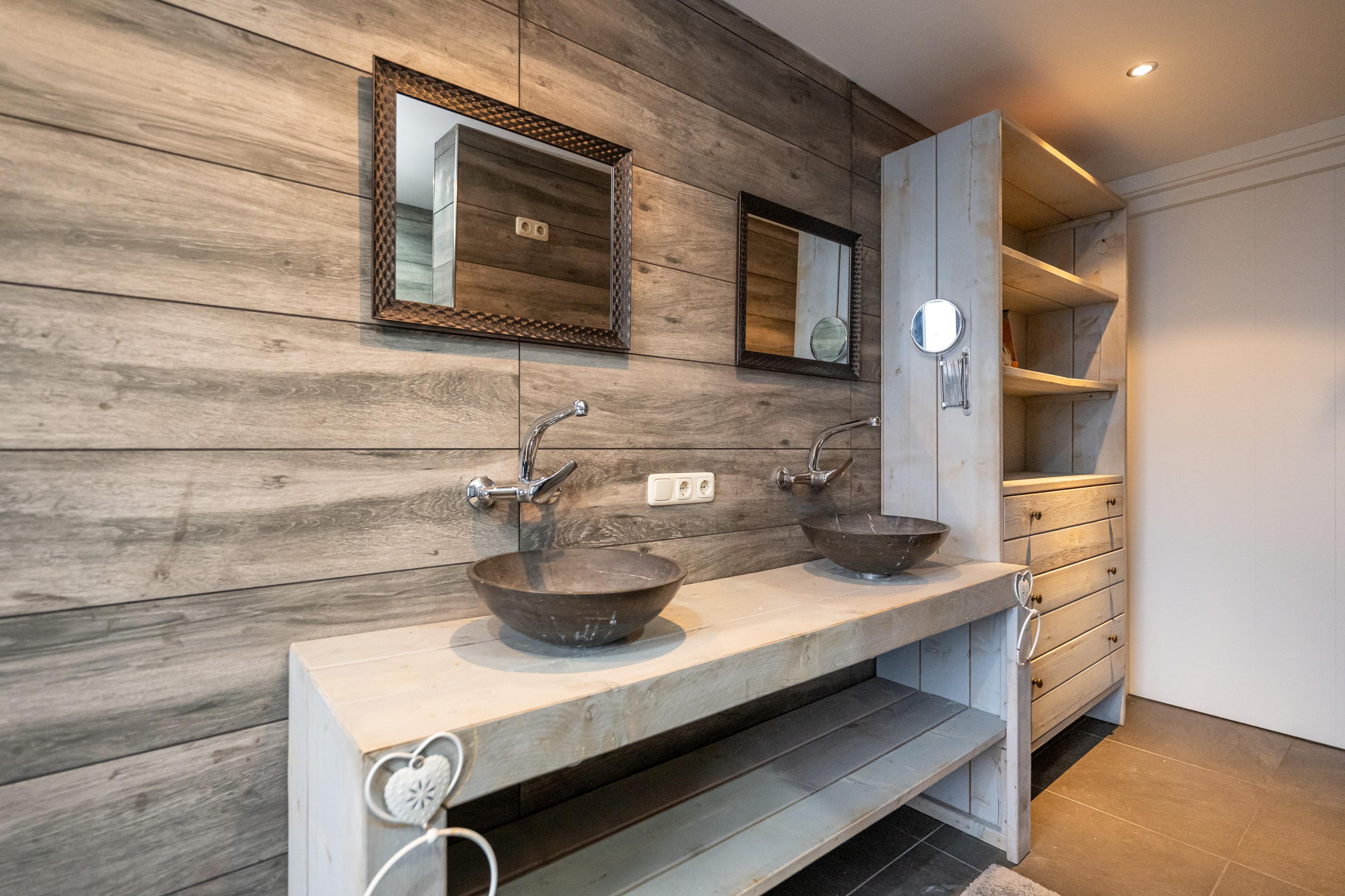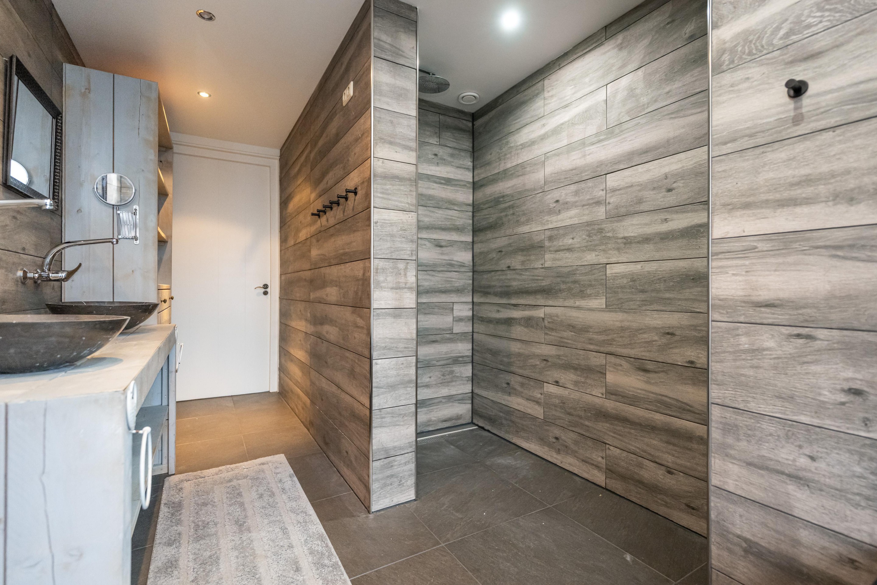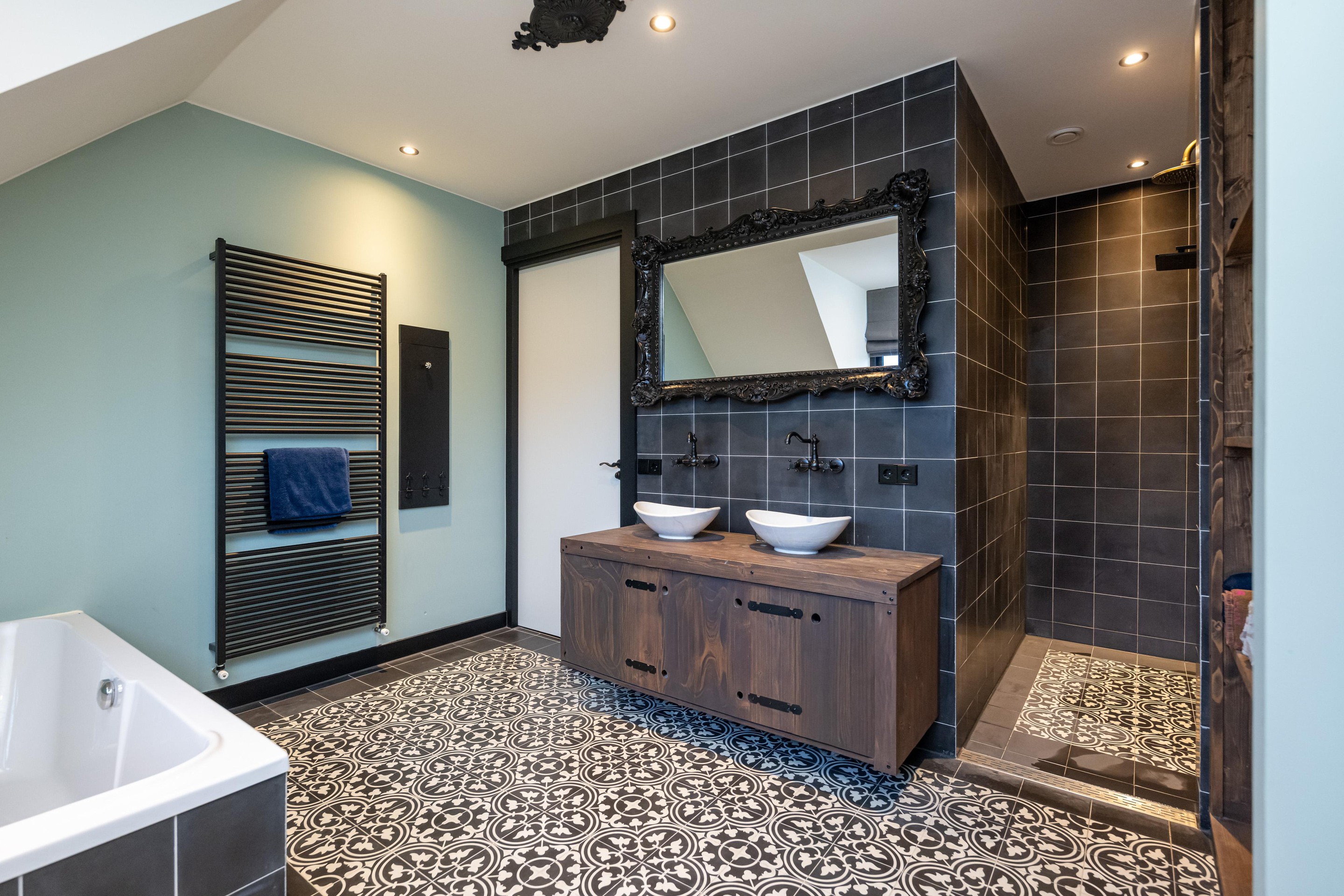 Plavuizen vloer met vloerverwarming, 2 x waskom met meubel en spiegel, handdoekenradiator, ligbad, inloopdouche, dubbele regendouche, mechanische afzuiging en spots in plafond.