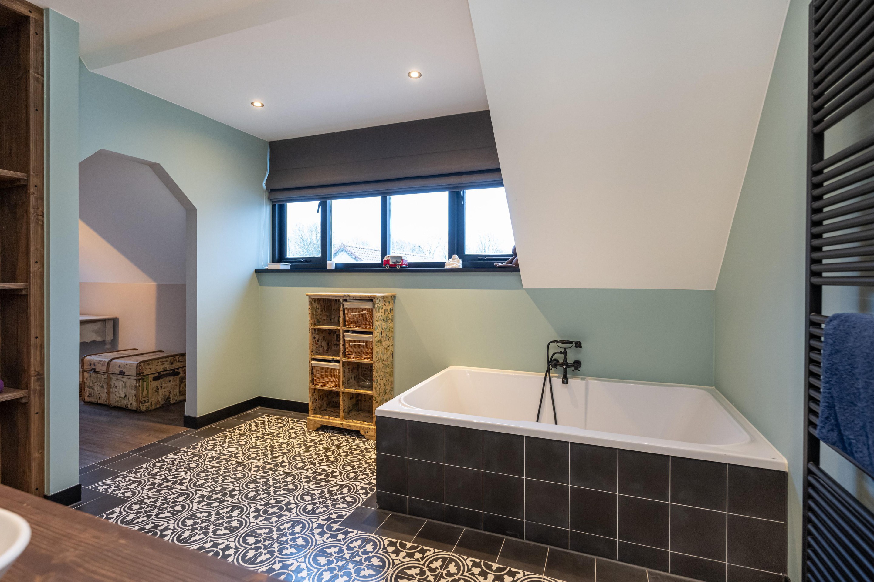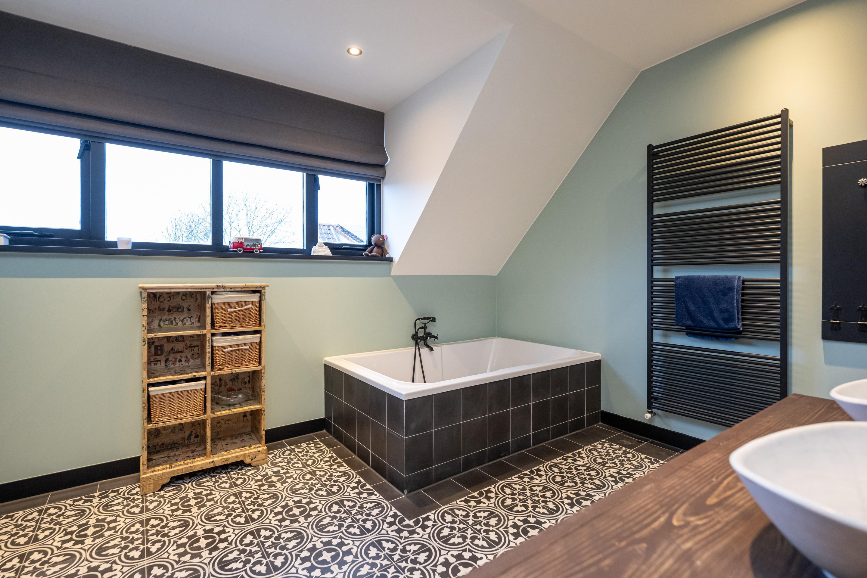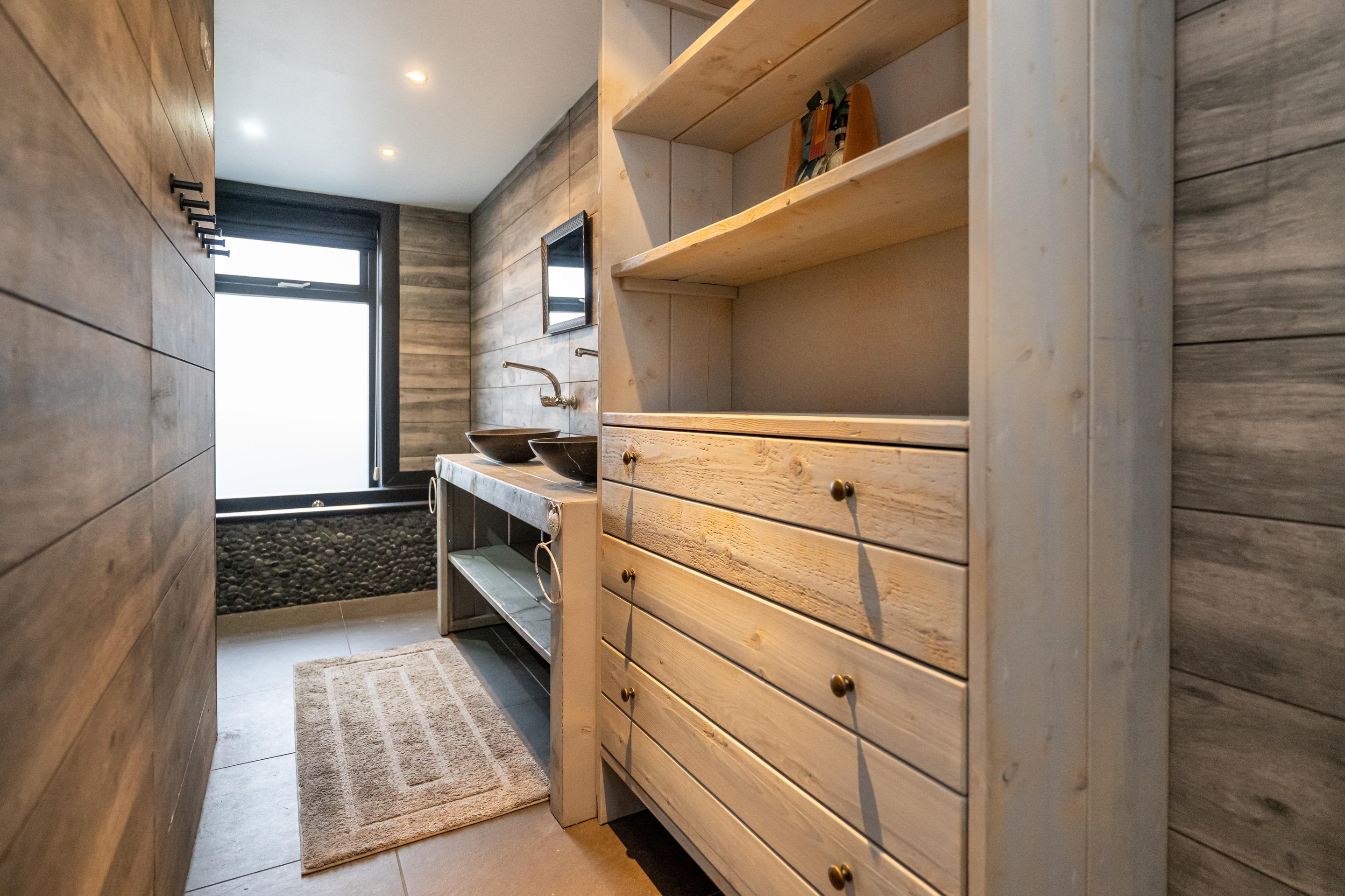 Plavuizen vloer met vloerverwarming, 2 x waskom met meubel en spiegel, handdoekenradiator, ligbad, inloopdouche, dubbele regendouche, mechanische afzuiging en spots in plafond.
