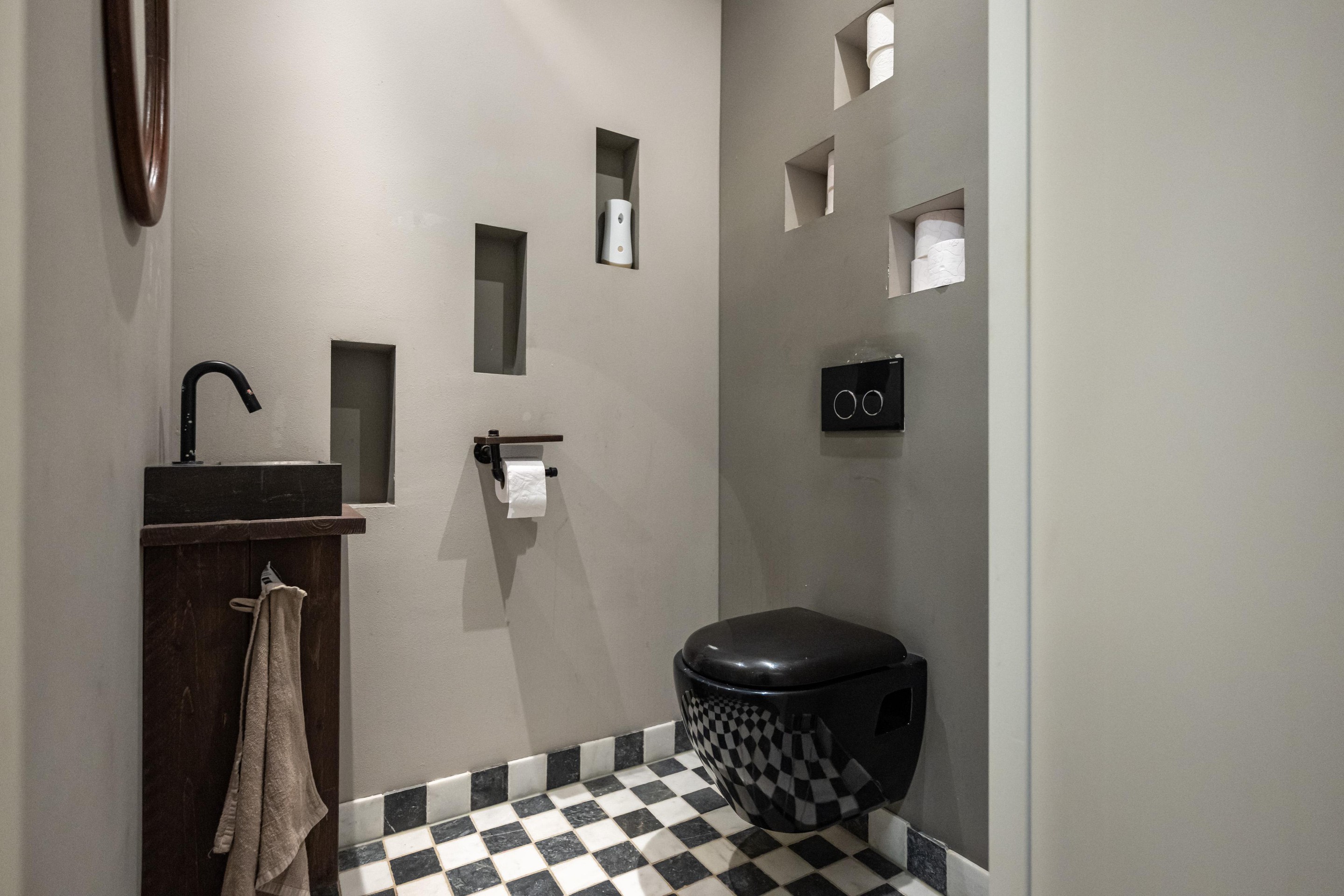 Marmeren vloer met vloerverwarming, zwevend toilet, fontein met onderkast en mechanische afzuiging.