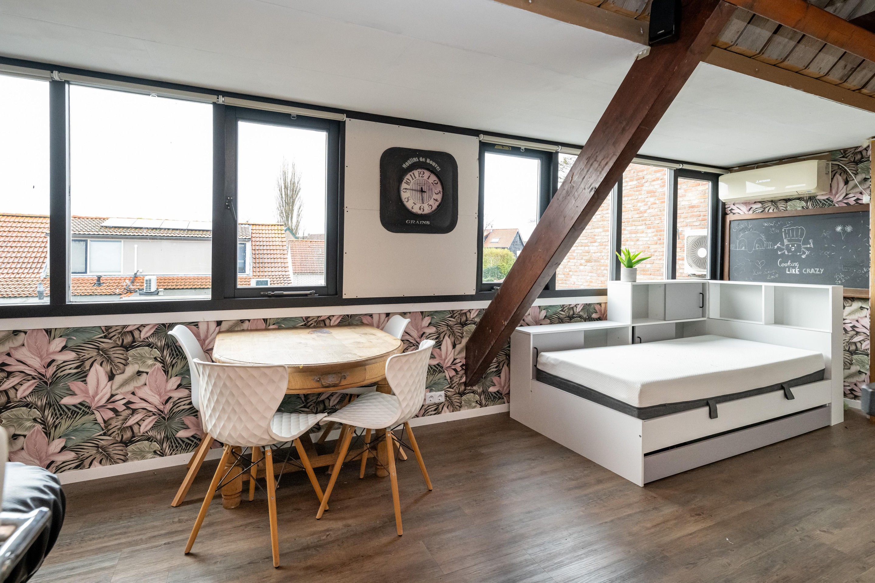 PVC vloer met vloerverwarming, bergruimte achter kastdeuren en slaapkamerraam vernieuwd in 2025.