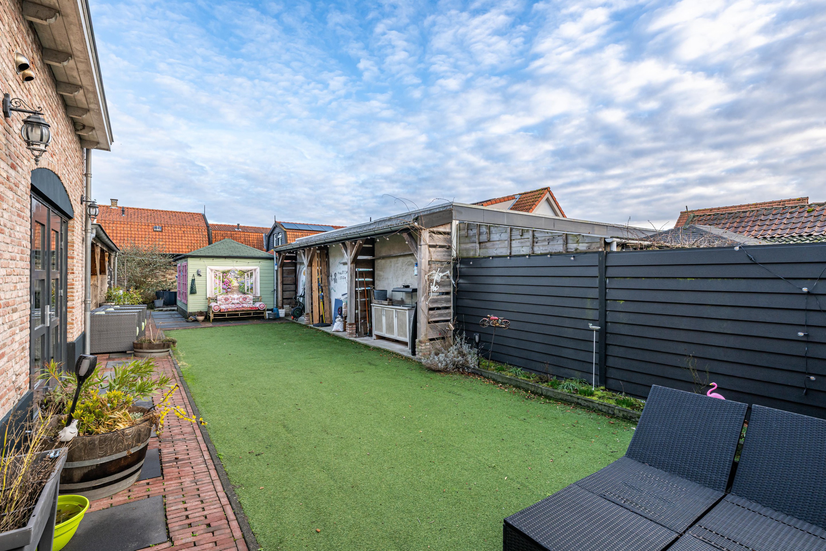 Deels bestraat, deels kunstgras, stalen schutting, terras, buitenkraan, eigen achterom en tuinhuis voorzien van elektra en verlichting.