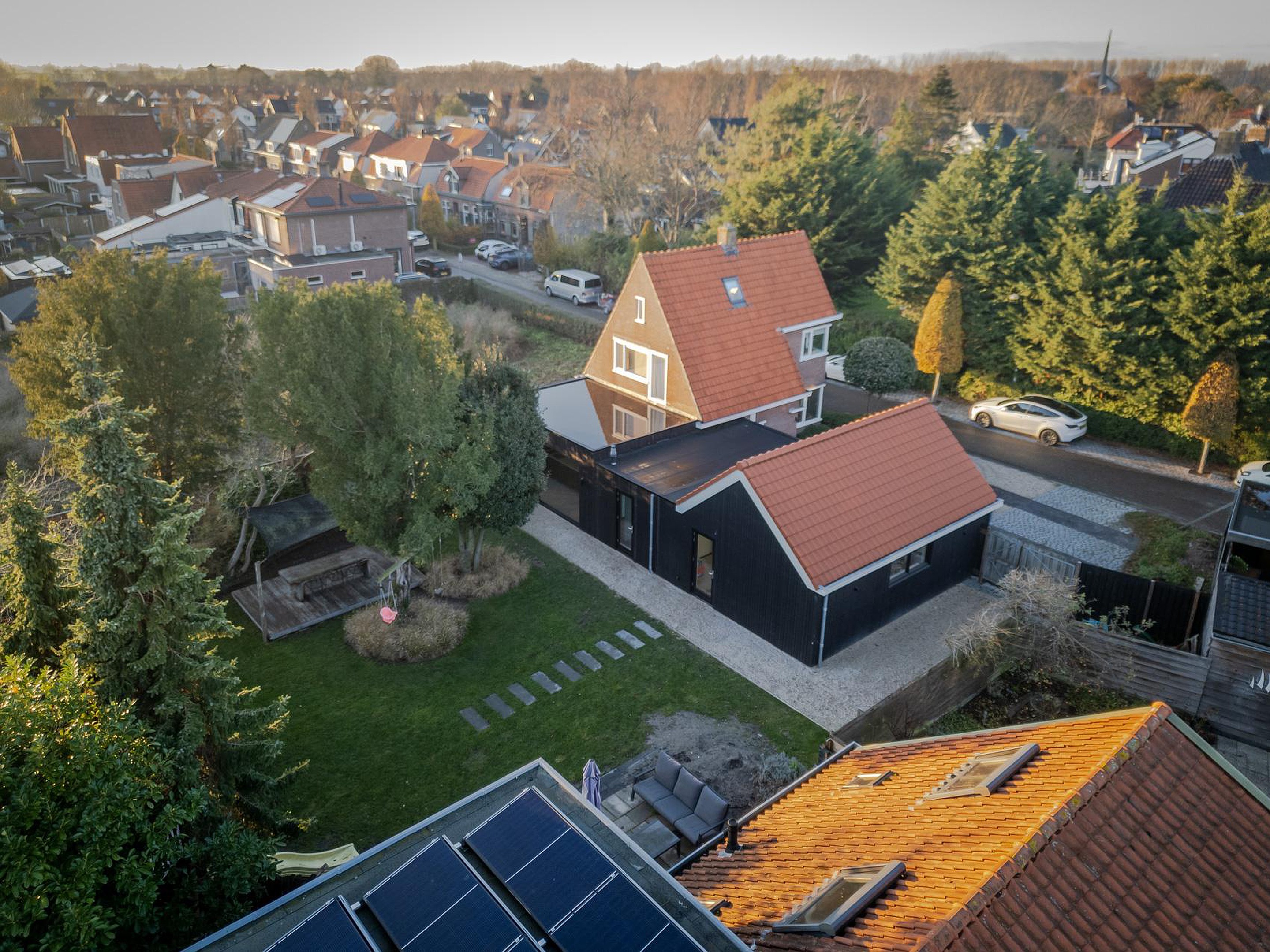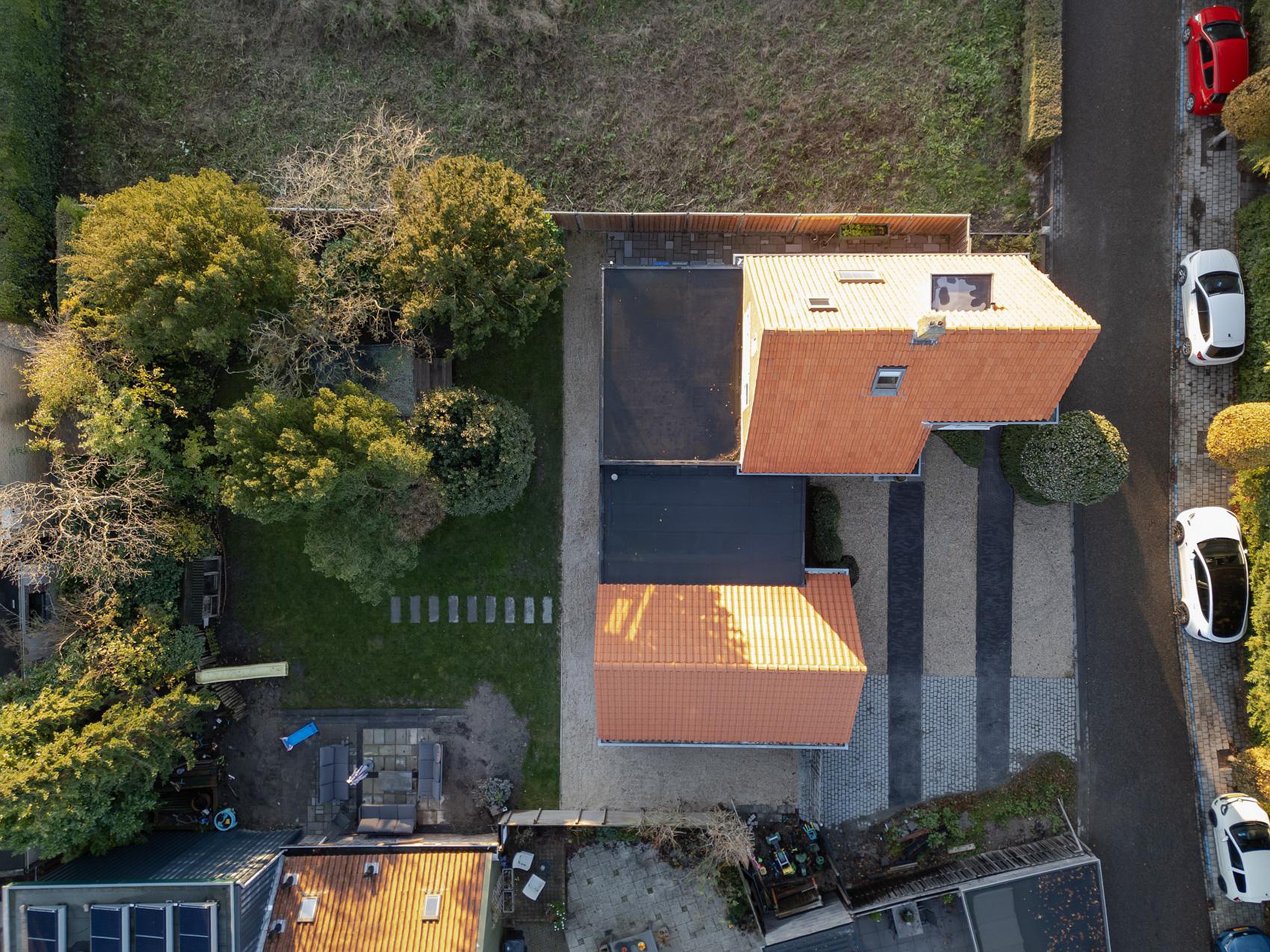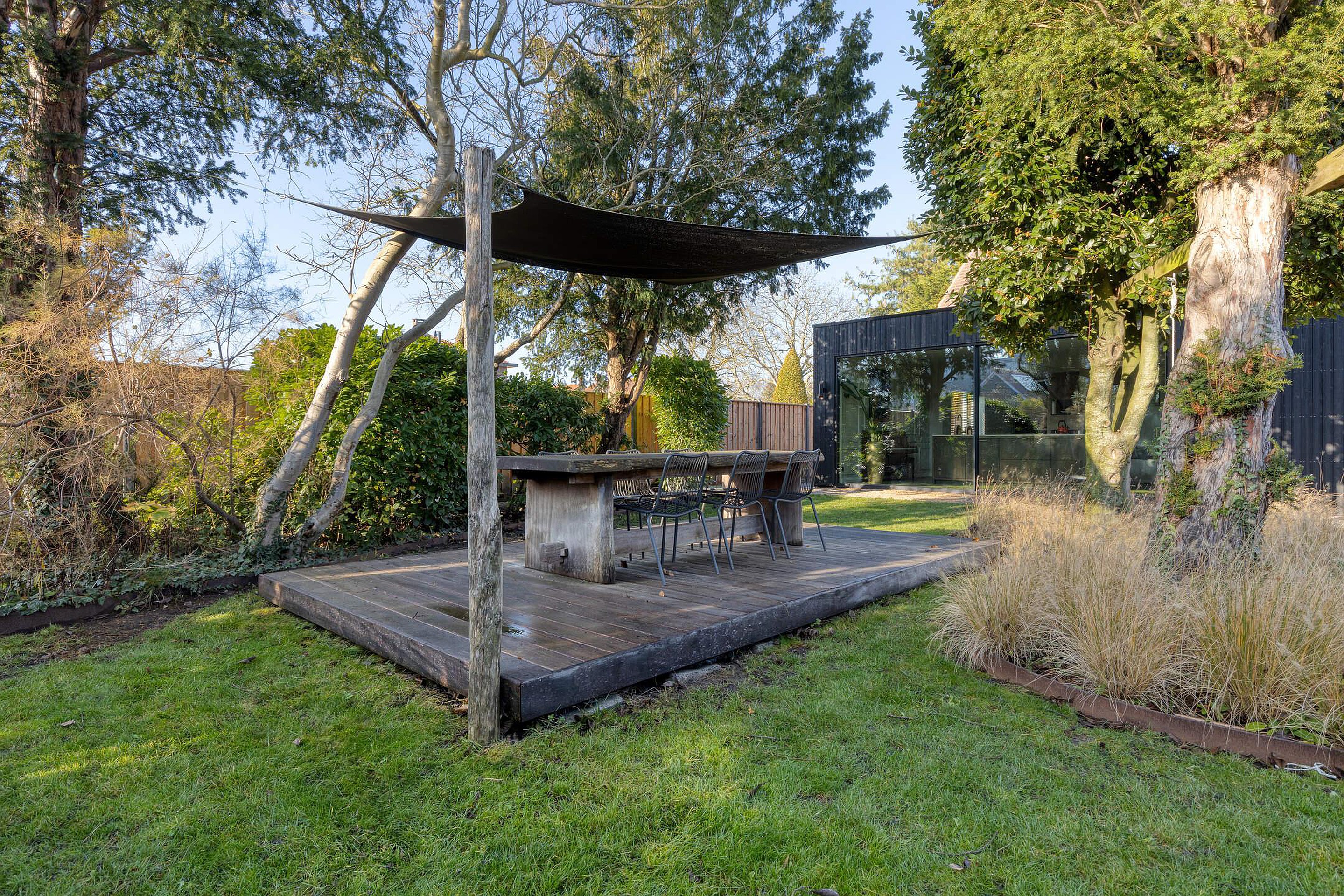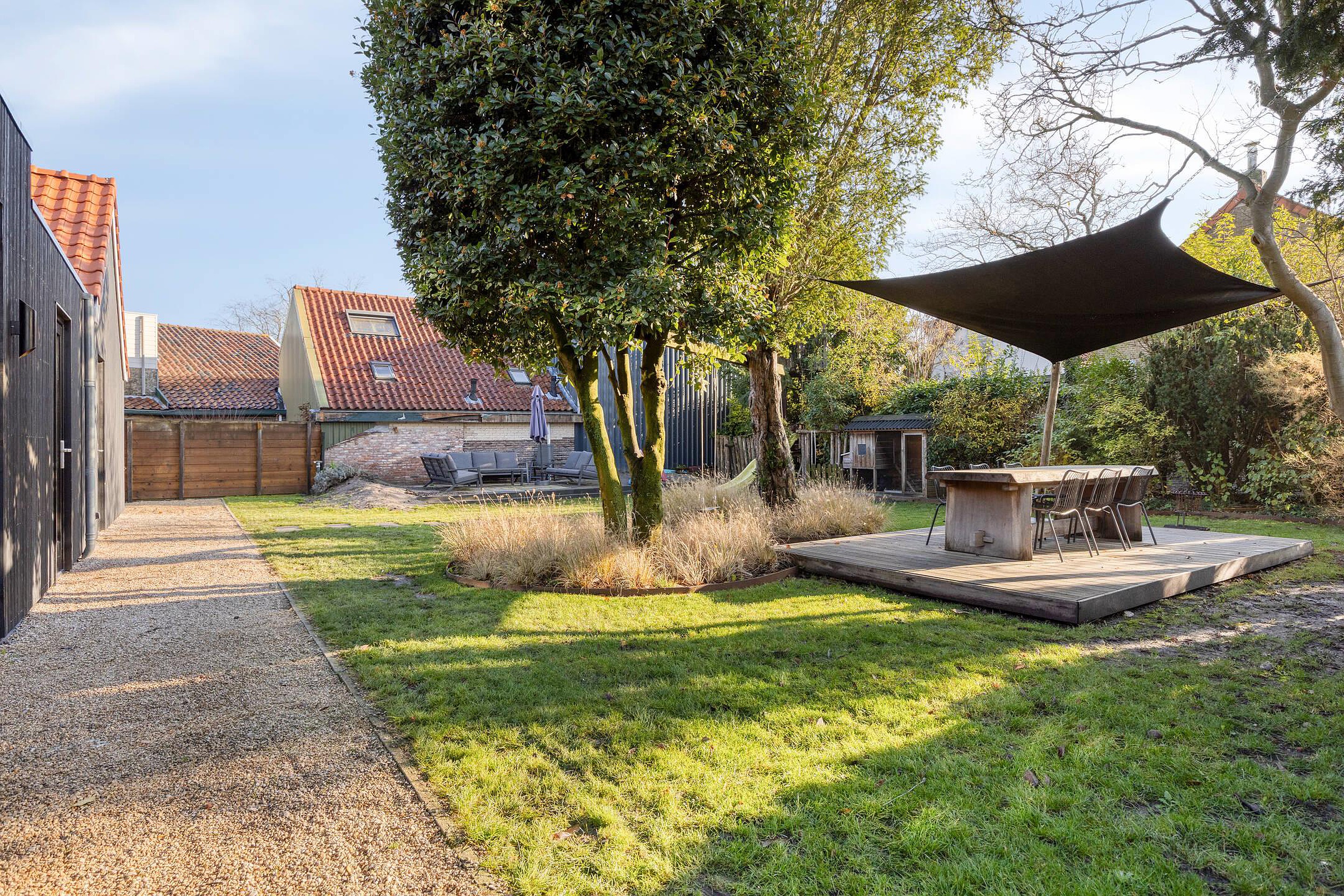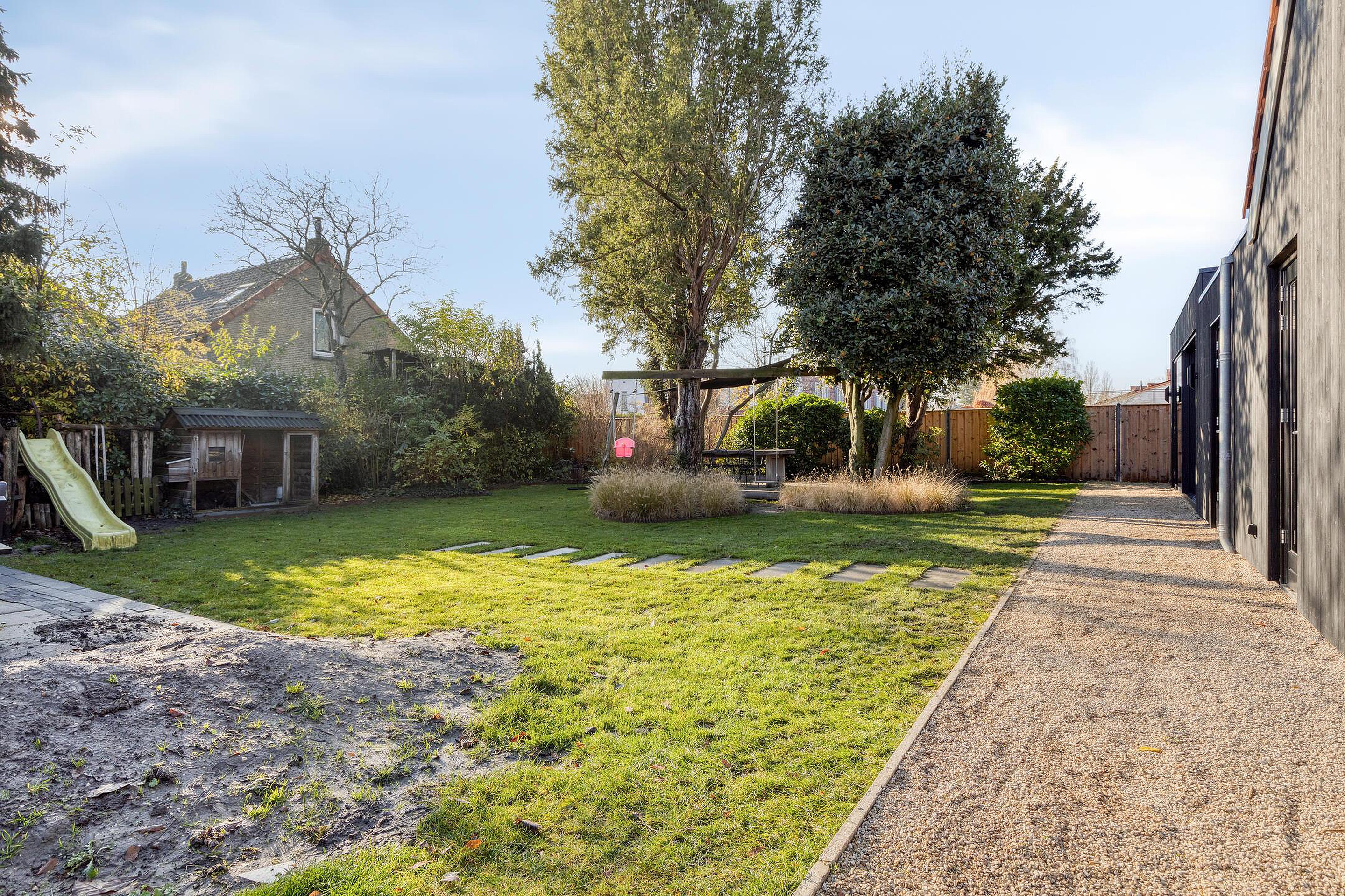 De woning staat op een royaal perceel en heeft een fijne tuin rondom. Er is parkeergelegenheid voor meerdere auto's op eigen terrein. De achtertuin biedt volop privacy en mogelijkheden om verschillende terrassen te creëren.