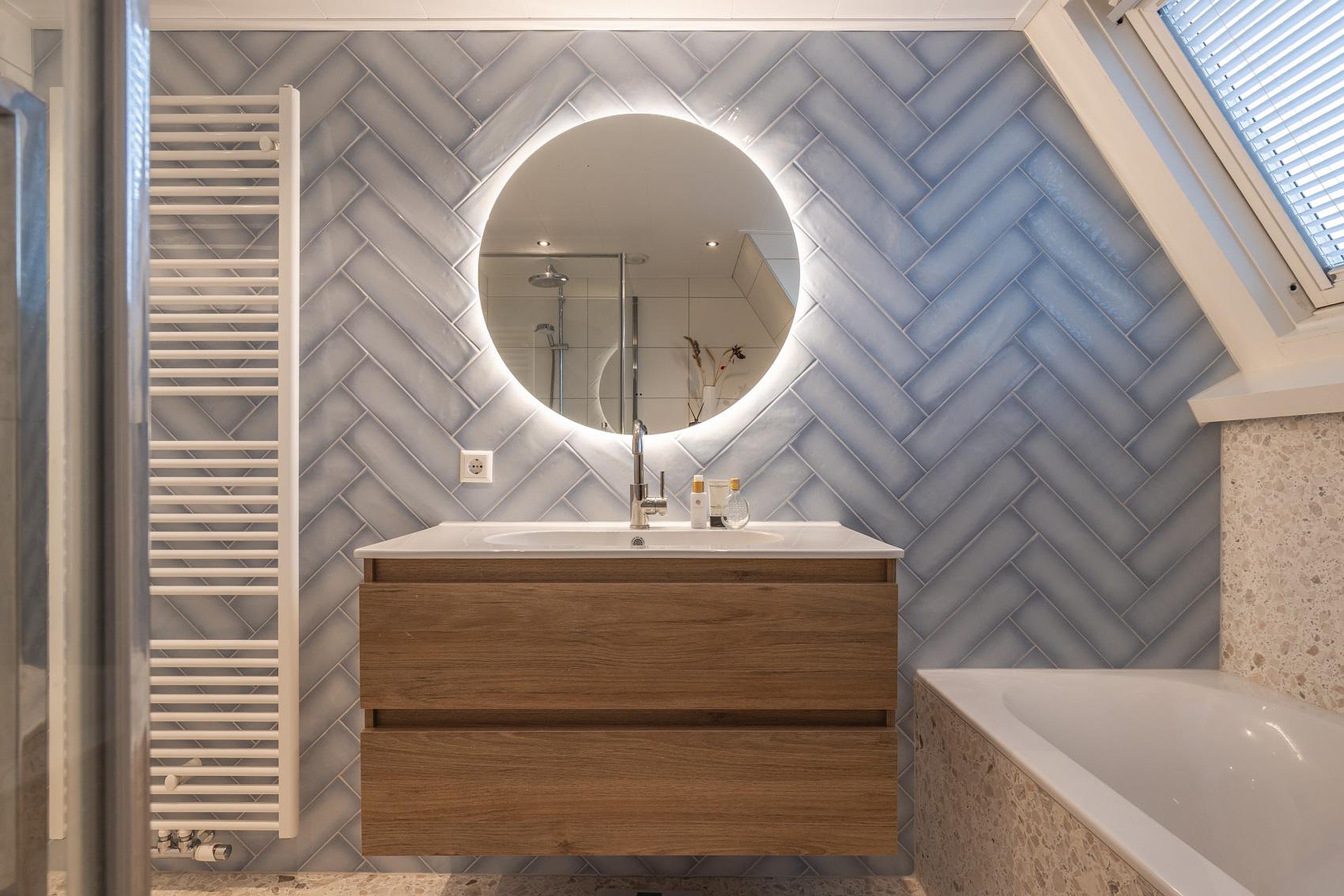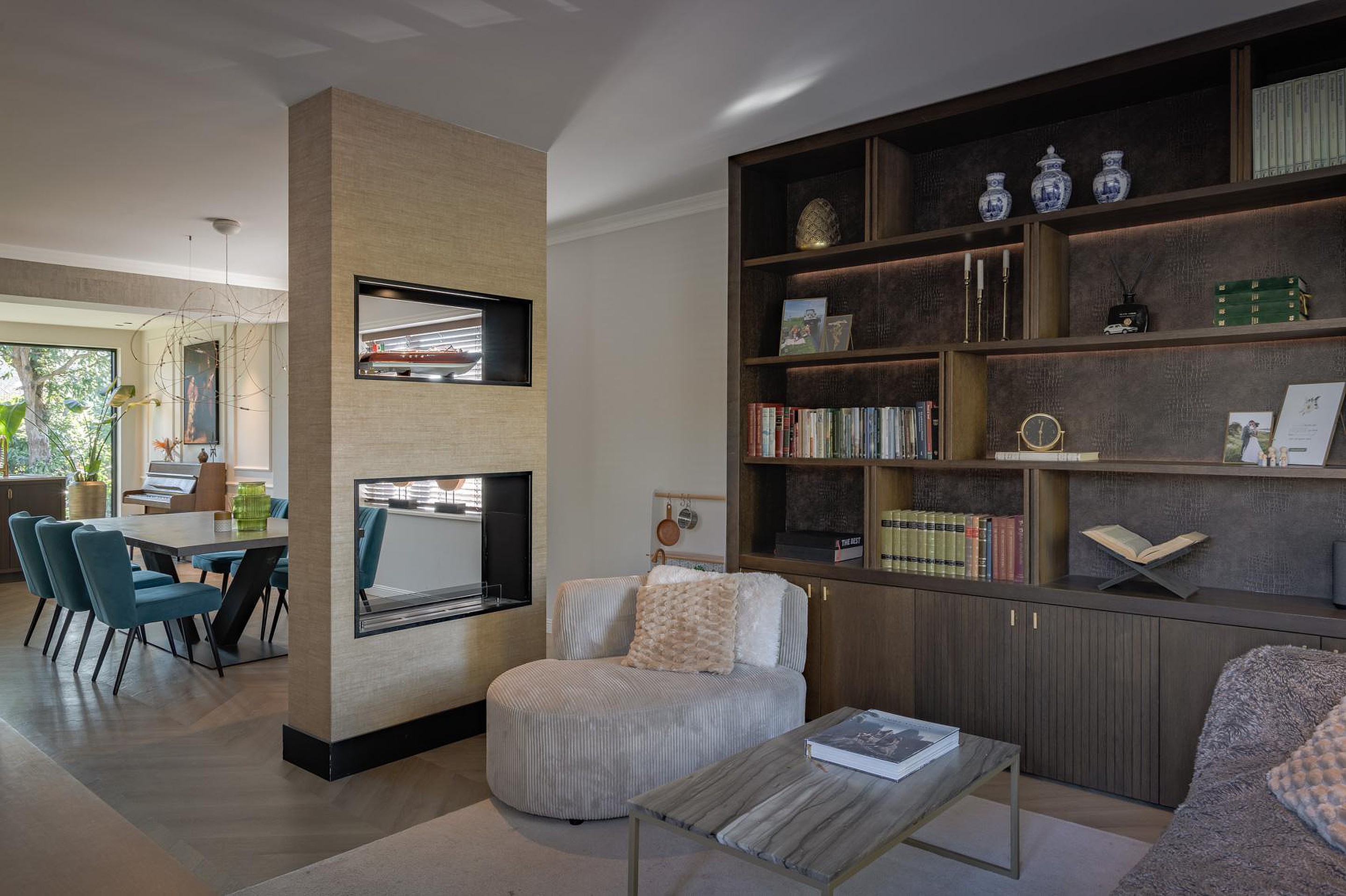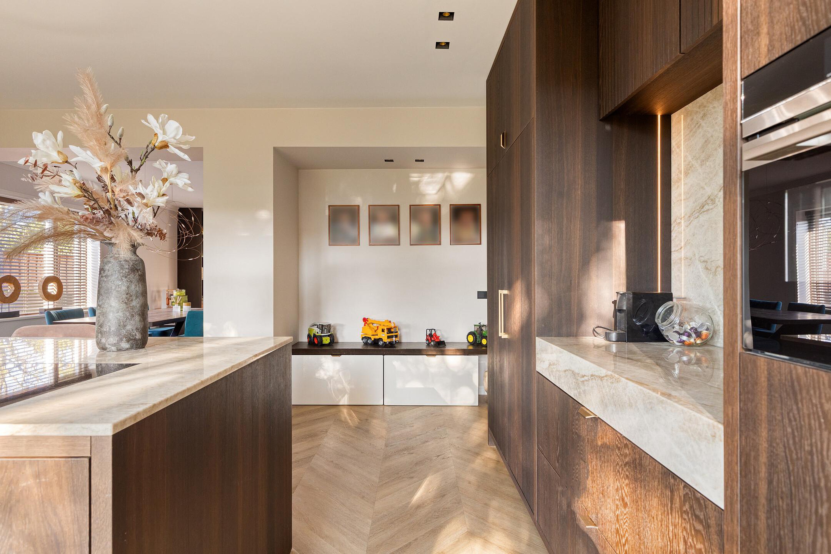 Aan de achterzijde bevindt zich de royale open keuken. Deze leef keuken beschikt over een groot kookeiland, veel werkruimte en een royale aluminium schuifpui naar de tuin. Direct naast de keuken ligt de bijkeuken, ideaal voor extra voorraad of de wasruimte.