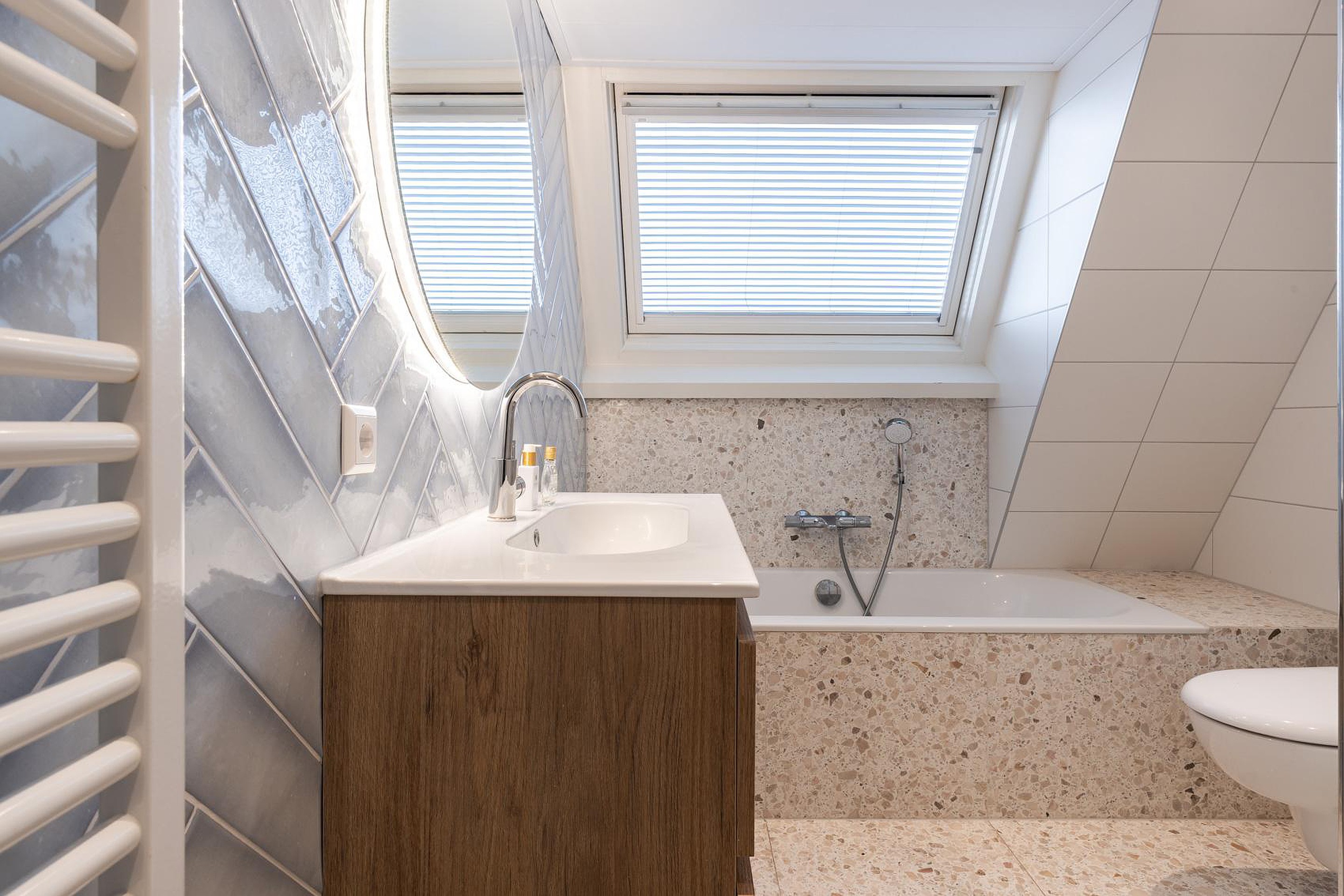 Eerste verdieping De eerste verdieping telt twee ruime slaapkamers en een complete badkamer. De, zo goed als nieuwe badkamer is uitgerust met een ligbad, douche, wastafel en toilet.