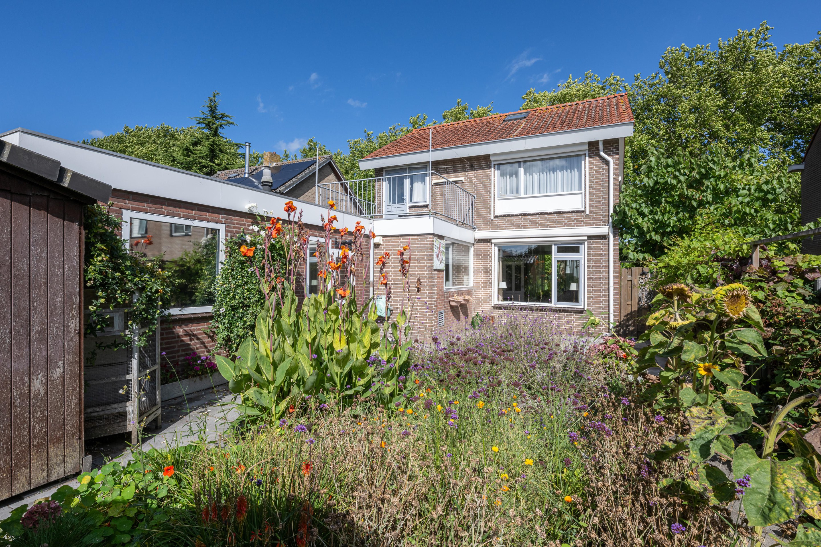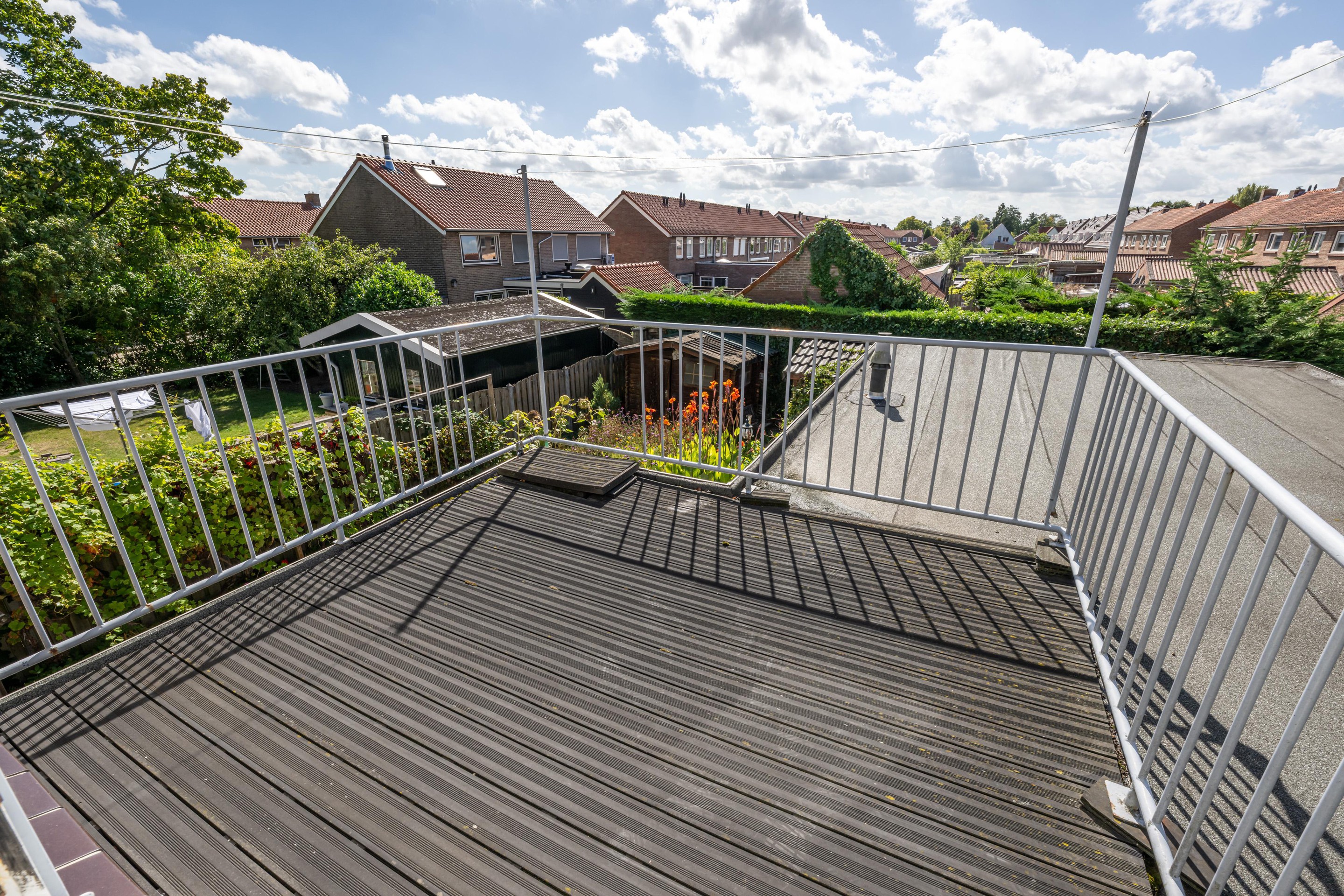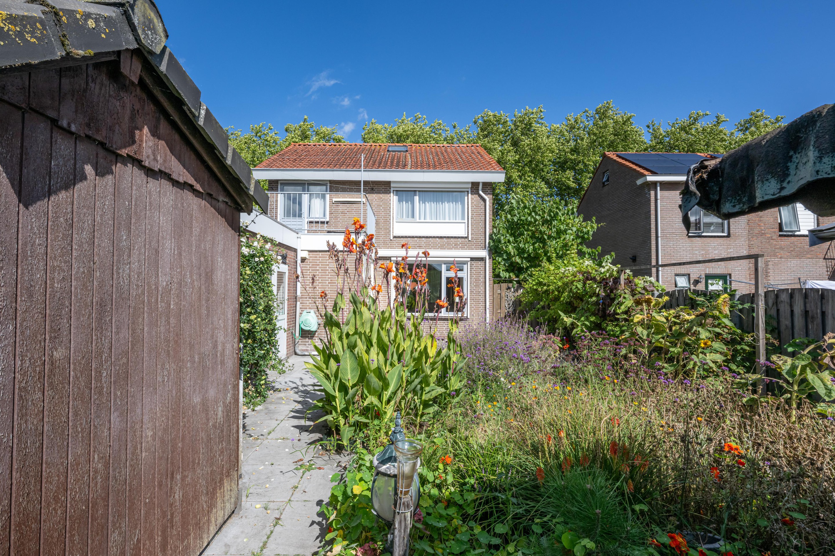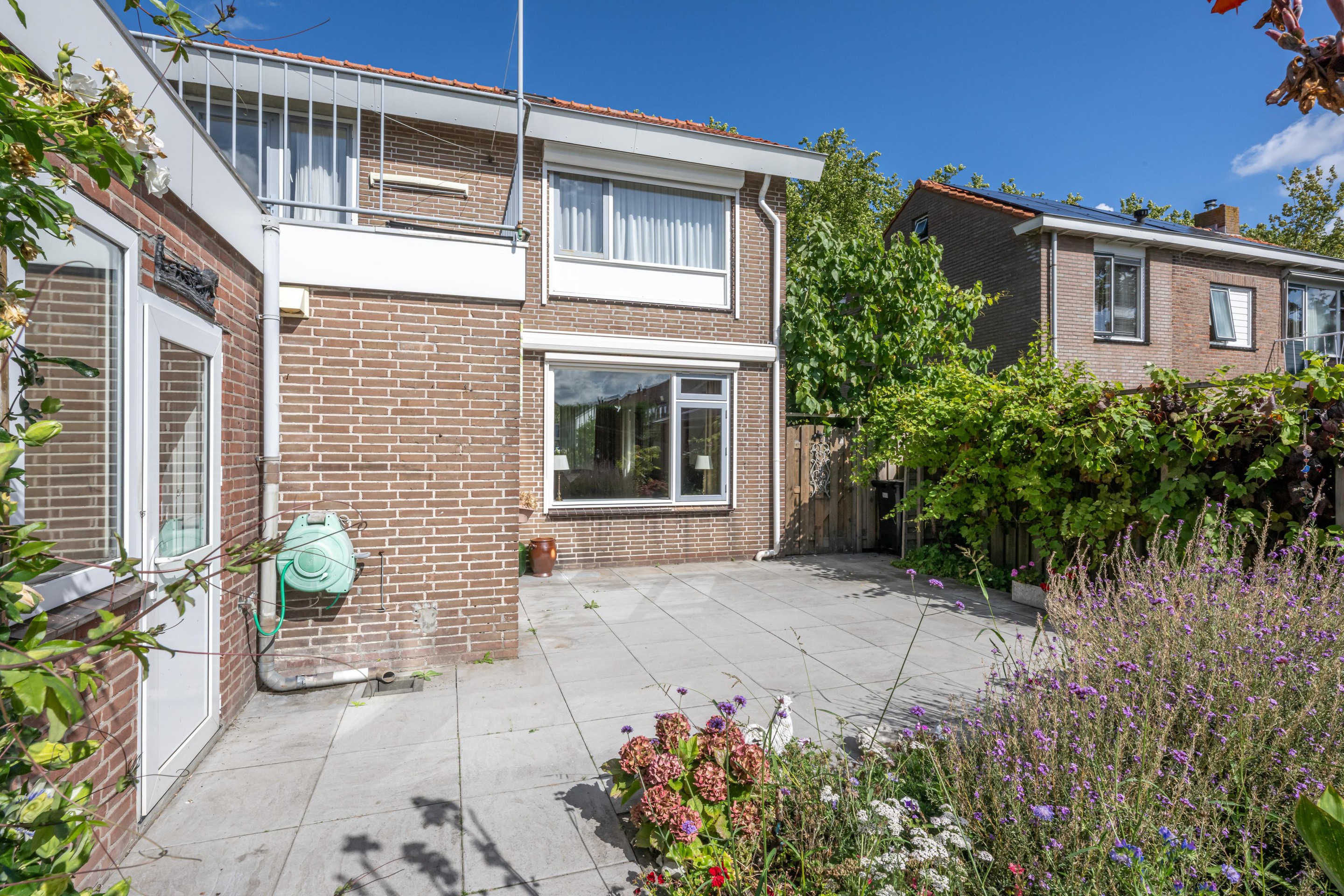 Ook buiten is het genieten. De achtertuin van circa 12 meter diep ligt op het zuiden, wat betekent dat u hier de hele dag kunt profiteren van de zon. Of u nu houdt van tuinieren, ontspannen met een boek of lange zomeravonden met vrienden, deze tuin biedt u alle mogelijkheden. Bovendien beschikt de woning over een dakterras dat eveneens op het zuiden ligt: een perfecte plek om in alle rust te genieten van het uitzicht en de zon.