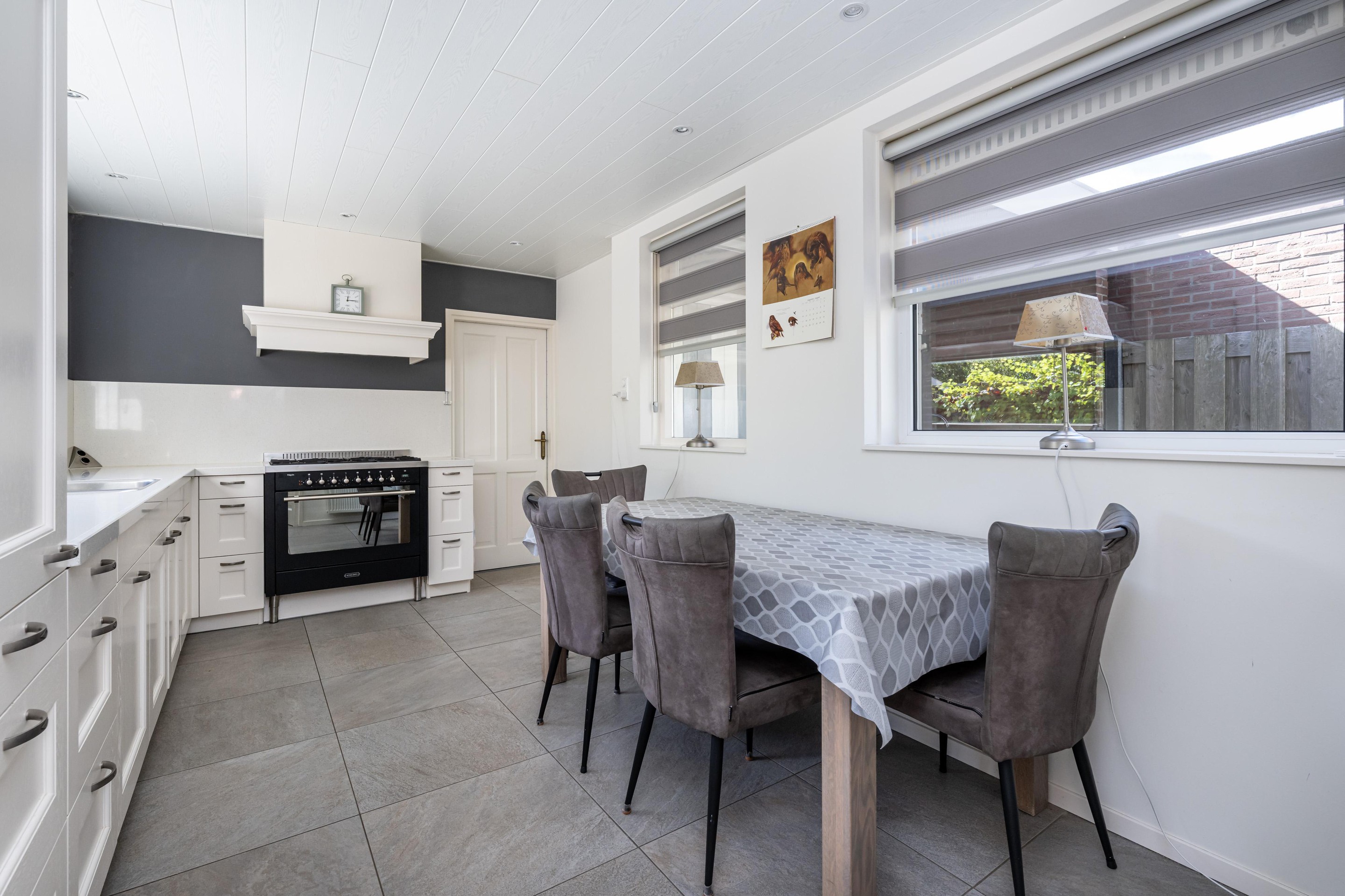 Plavuizenvloer, voorraadkast, vaatwasser, dubbele spoelbak, 6-pits gasfornuis met elektrische oven, afzuigkap, koelkast, vriezer, radiator, elektrische screen, zonnescherm handbediend, spots in plafond en toegang tot garage.