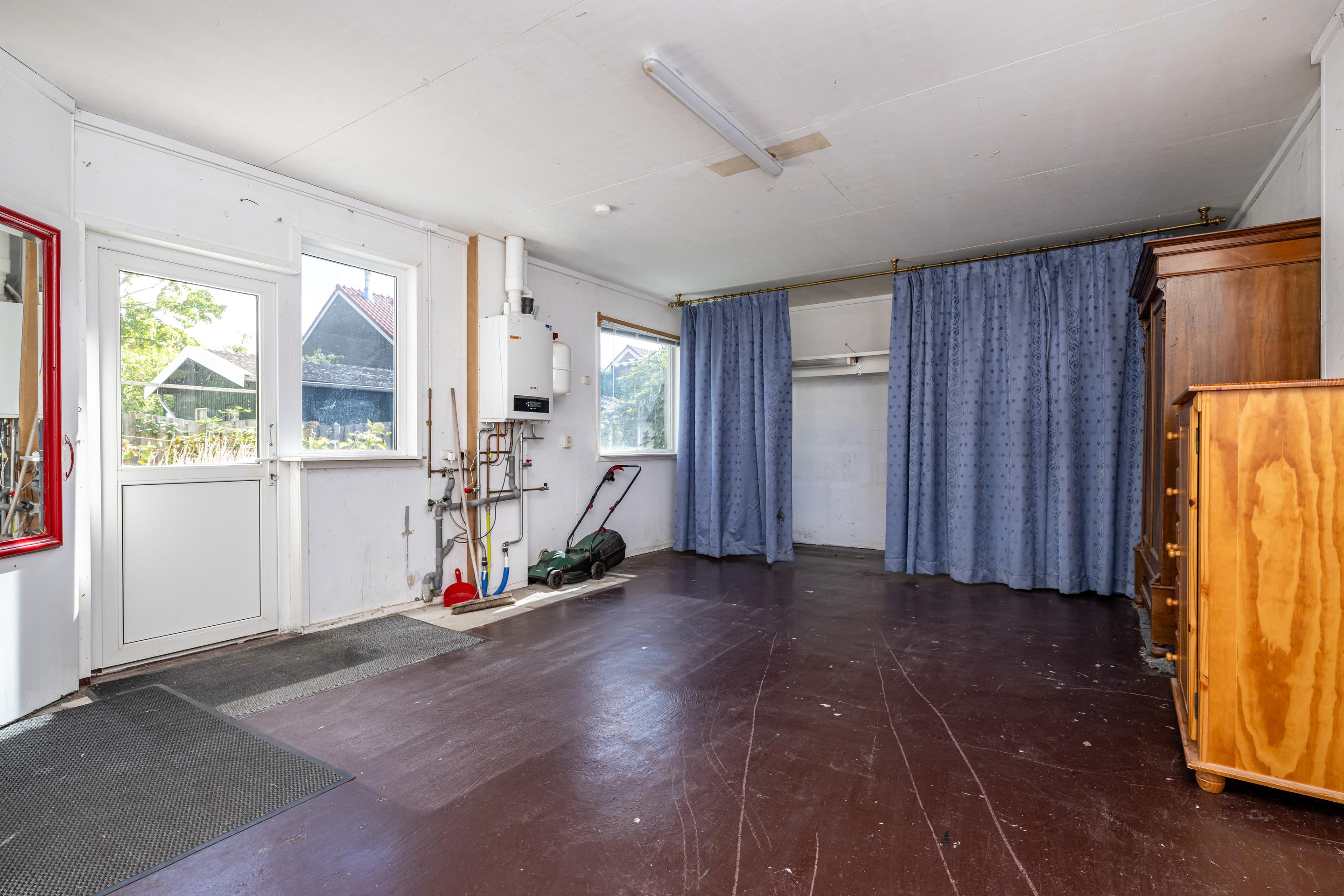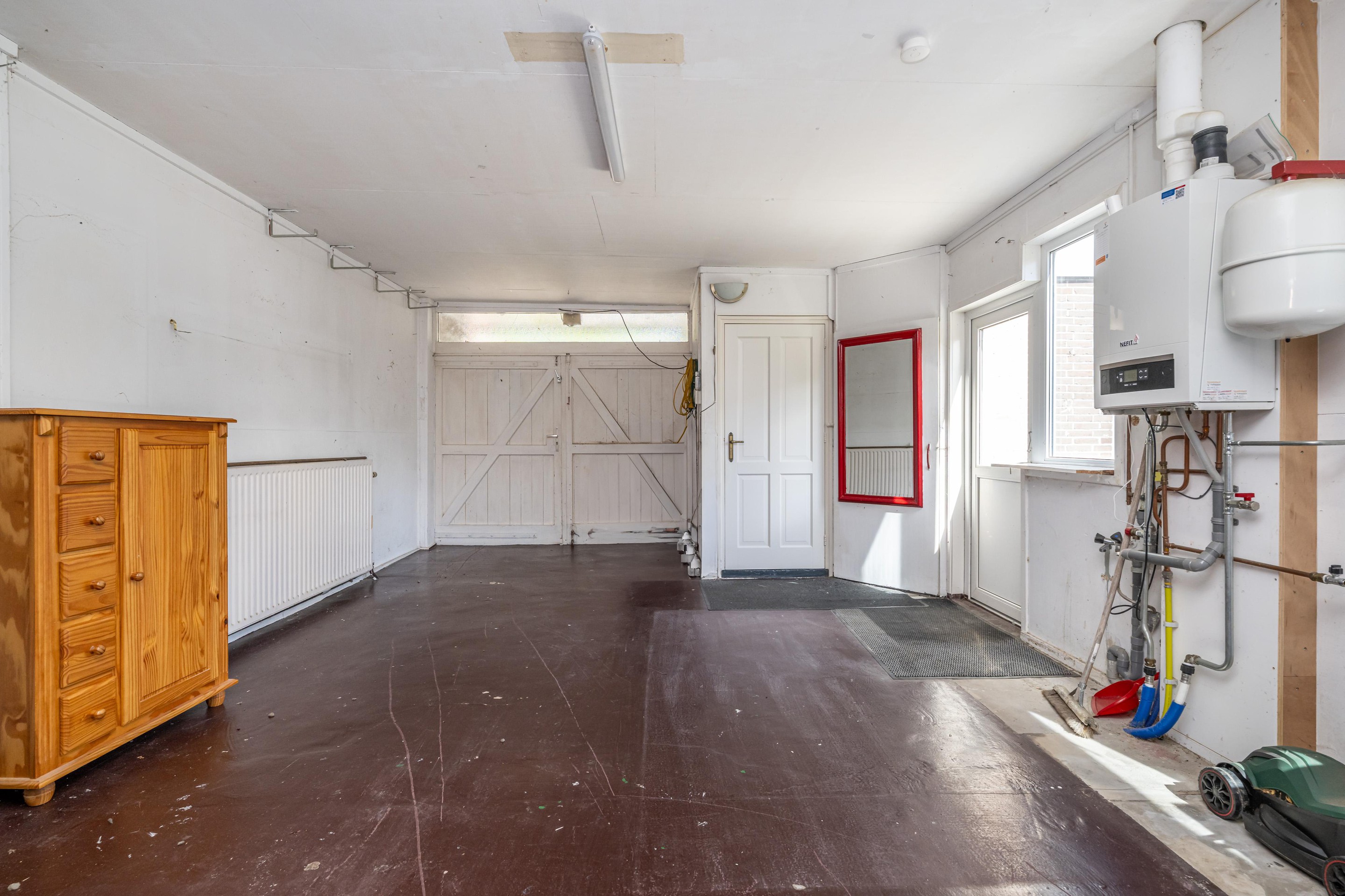 Betonvloer, openslaande garage deuren, radiator, cv-opstelling (Nefit 2017), bergkast met gasmeter, witgoedaansluitingen en deur naar achtertuin.