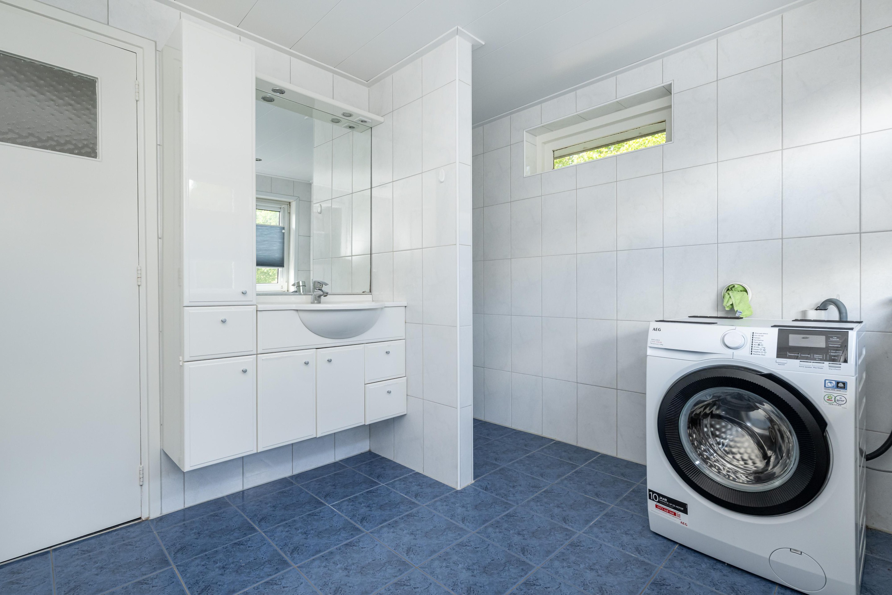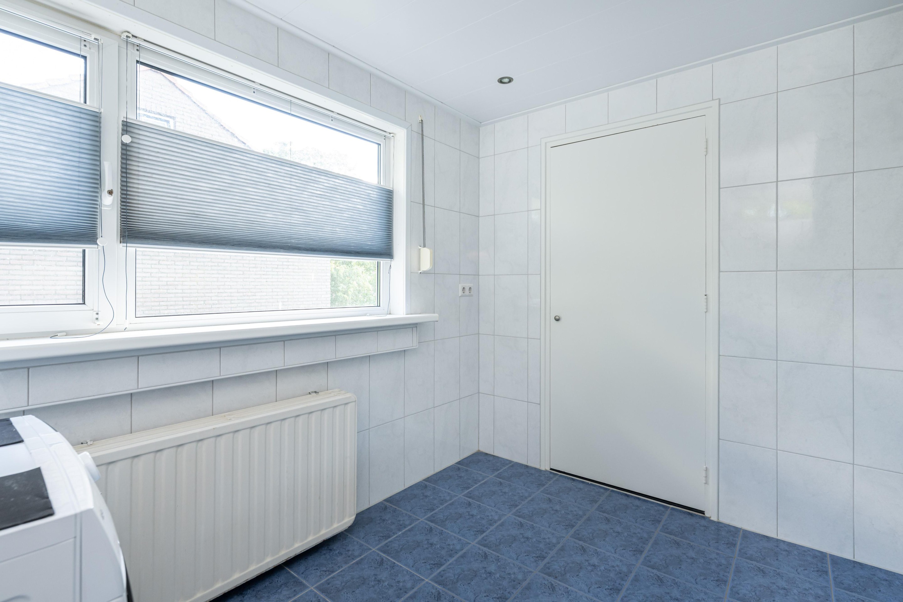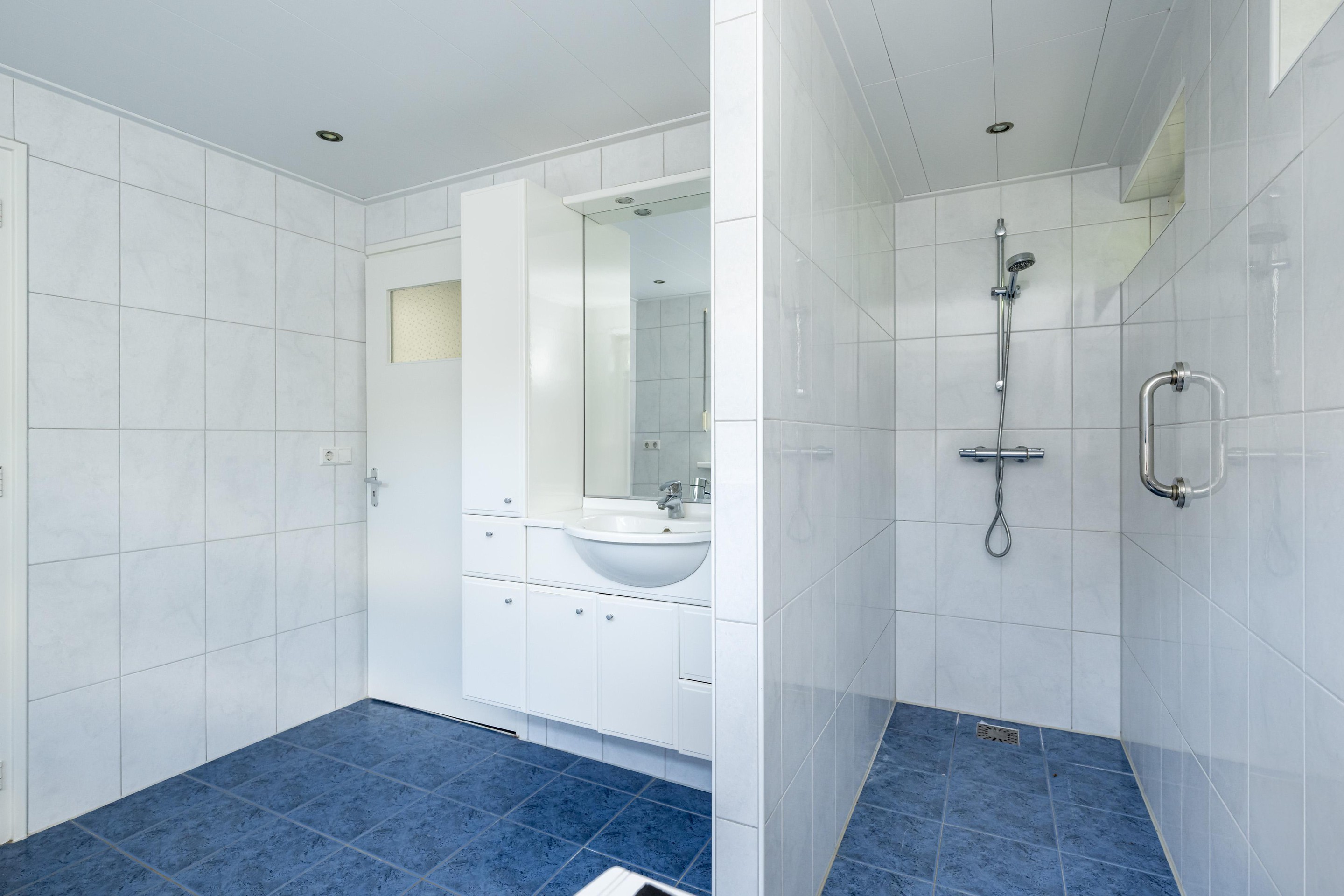 Plavuizenvloer, inloopdouche, wastafel met meubel, radiator, spots in plafond, inbouw kledingkast, rolluik handbediend en witgoedaansluiting.
