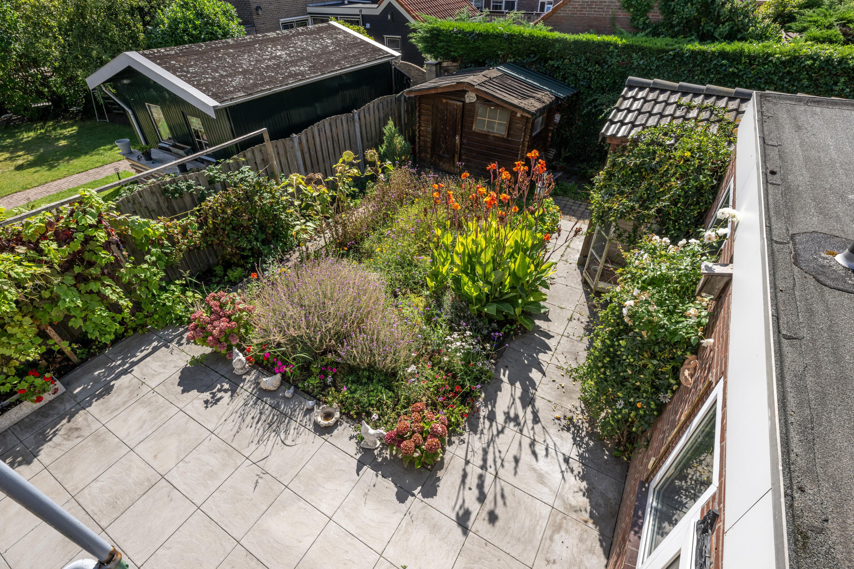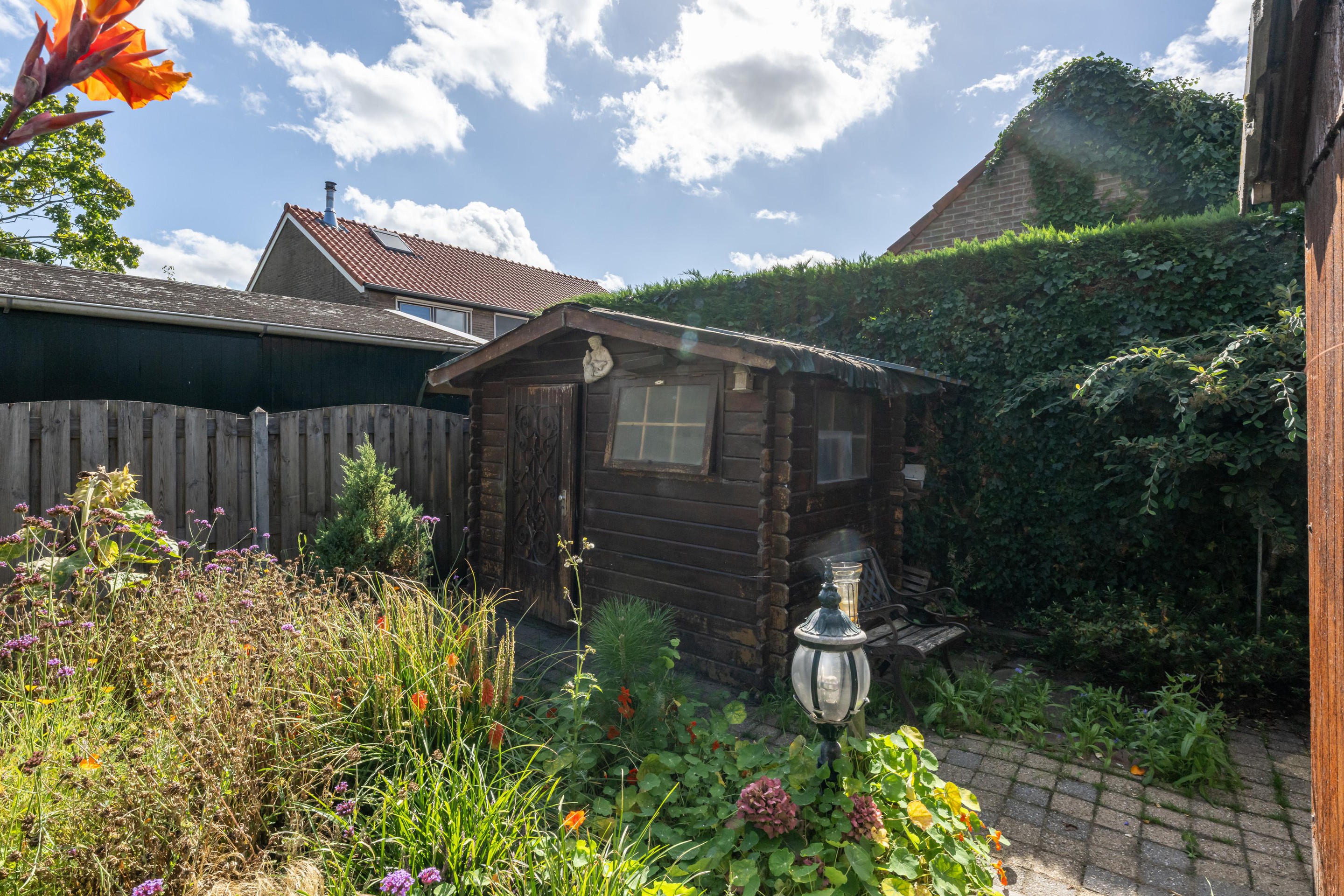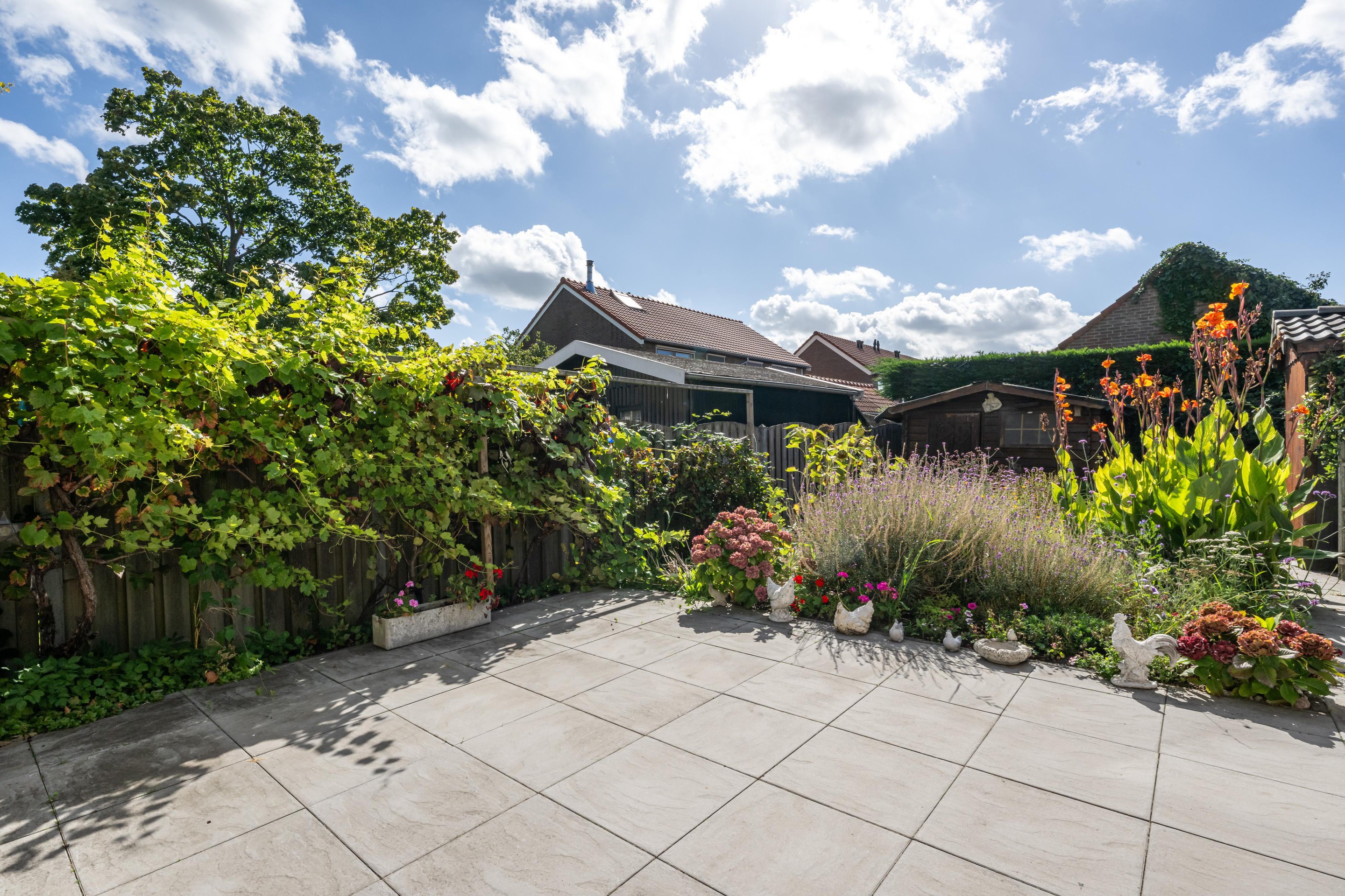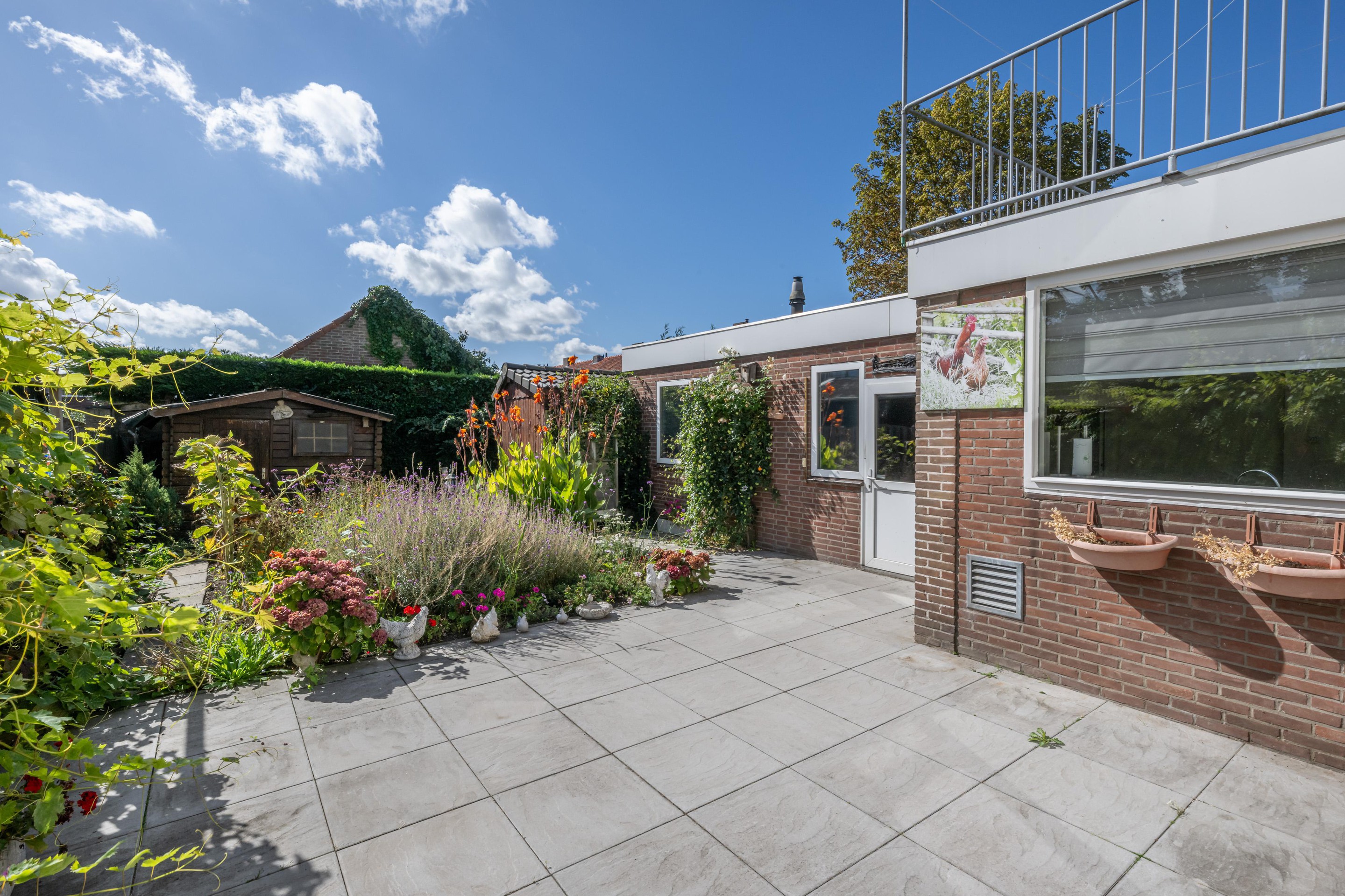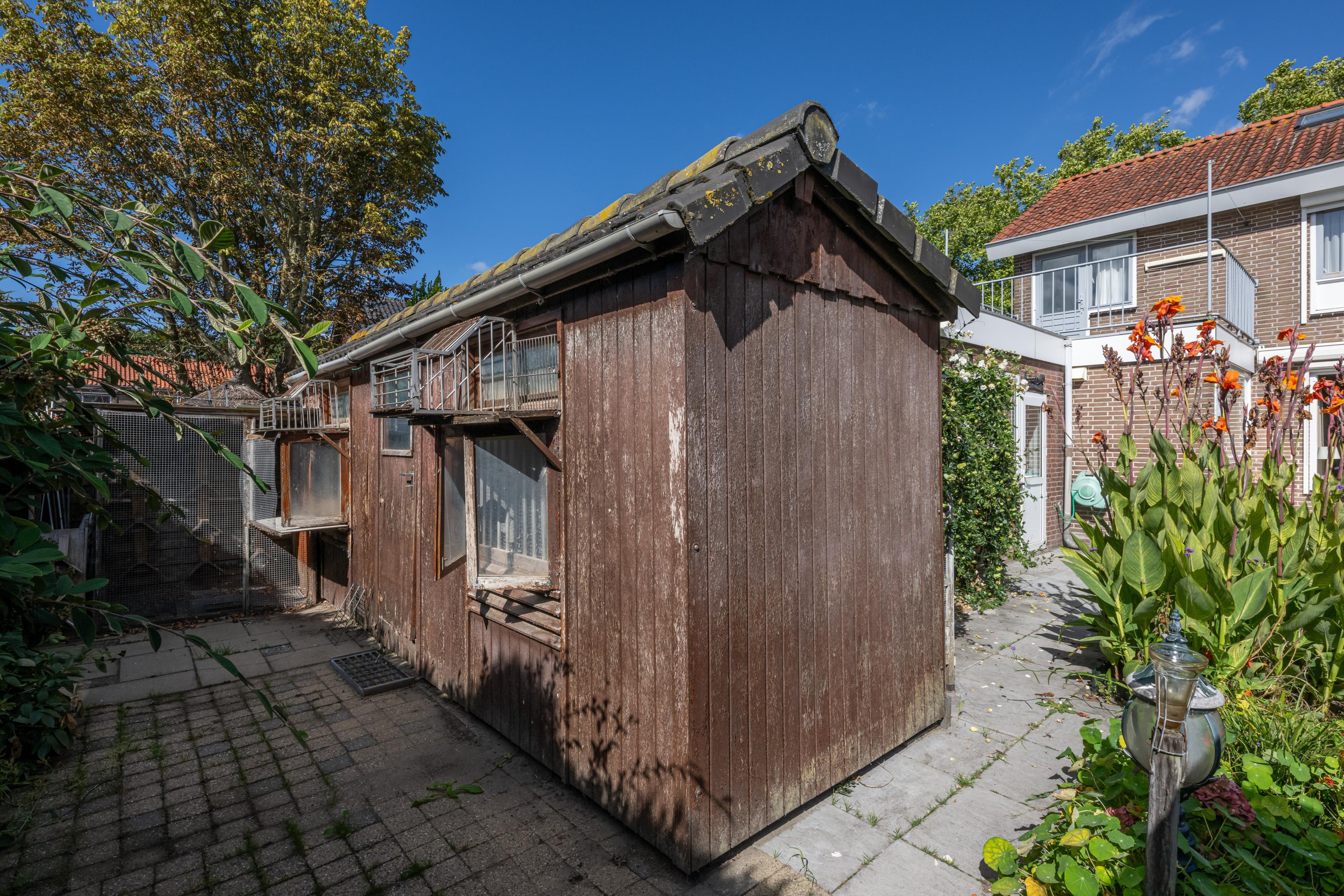 Deels bestraat, buitenkraan, elektrisch zonnescherm, achterom, duiventil en een houtenberging.