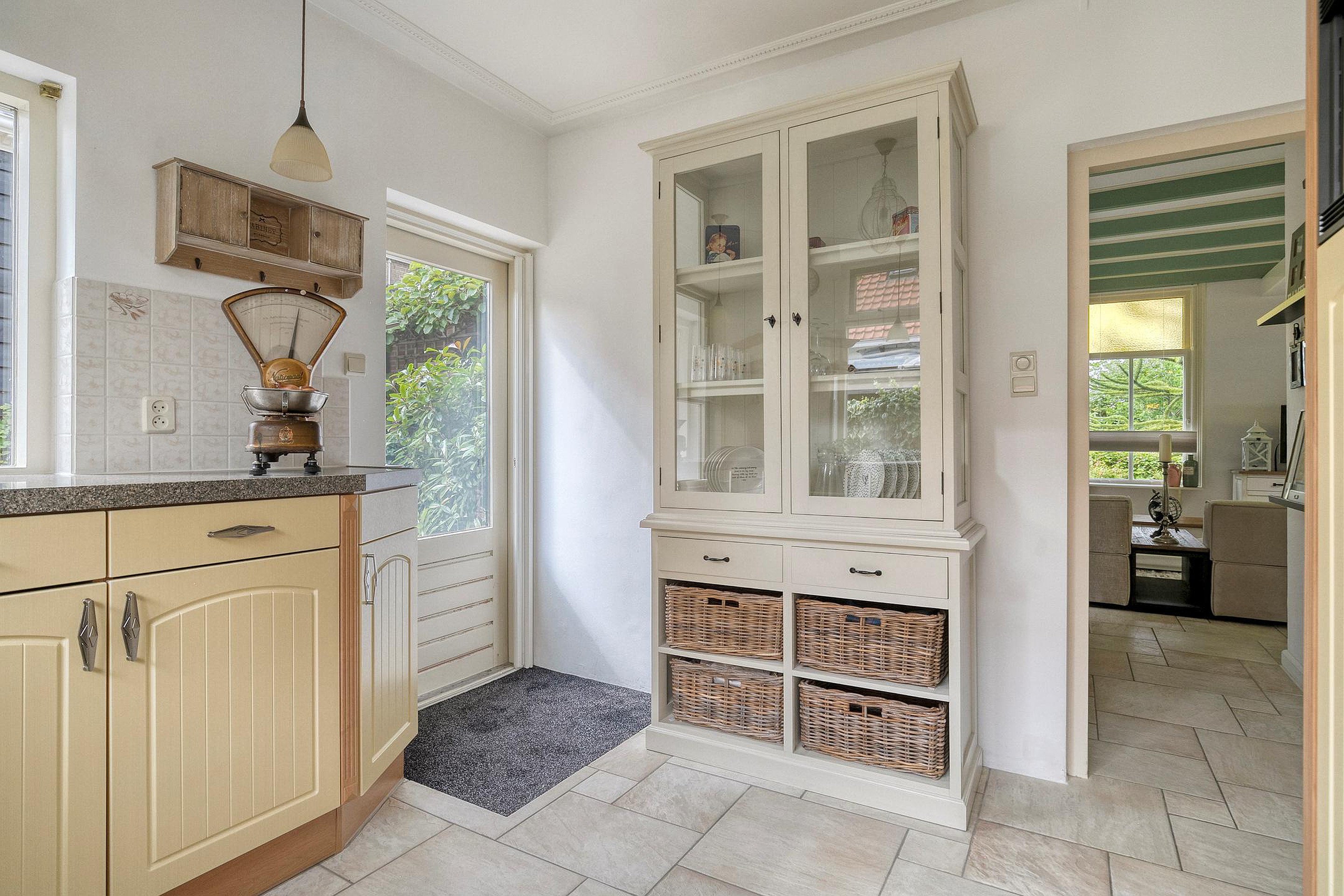 Begane grond Via de entree met trapopgang, toilet en praktische opbergruimte komt u in de sfeervolle woonkamer. De ruimte straalt warmte en licht uit dankzij de hoge plafonds, balkenplafond, grote raampartijen en gashaard. De woonkamer loopt door naar een eetkamer, ideaal voor lange diners met familie en vrienden. De aangrenzende keuken is ruim opgezet, voorzien van diverse inbouwapparatuur en biedt een fraai uitzicht op de tuin.