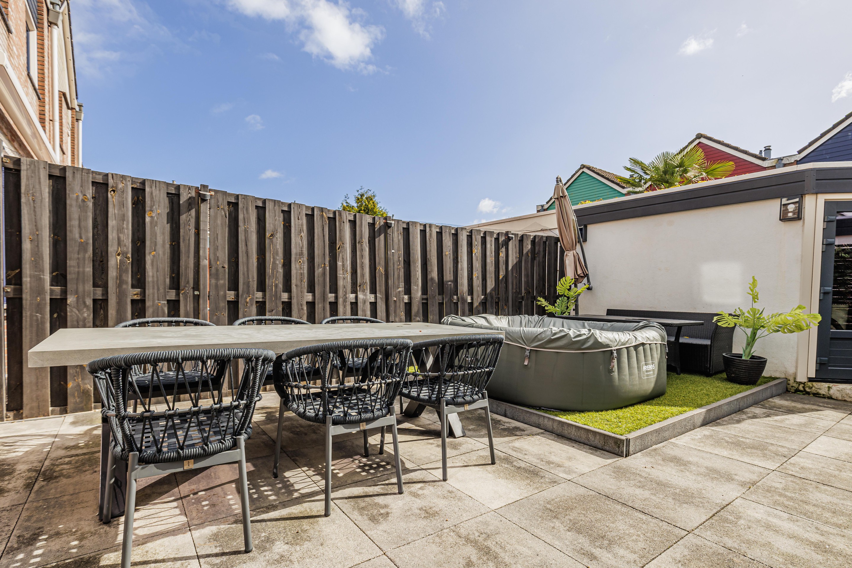 De achtertuin is gelegen op het zuidoosten en biedt daarmee de hele dag door zon. Hier kunt u in alle rust genieten van een kop koffie in de ochtendzon of juist uitgebreid dineren in de avond. De tuin is ruim genoeg voor zowel een loungehoek als een eettafel. Achter in de tuin staat een praktische berging, ideaal voor het opbergen van fietsen, tuingereedschap en andere spullen. Dankzij de ligging aan een doodlopende straat ervaart u bovendien extra privacy en een gemoedelijke sfeer, zonder drukte of verkeer.