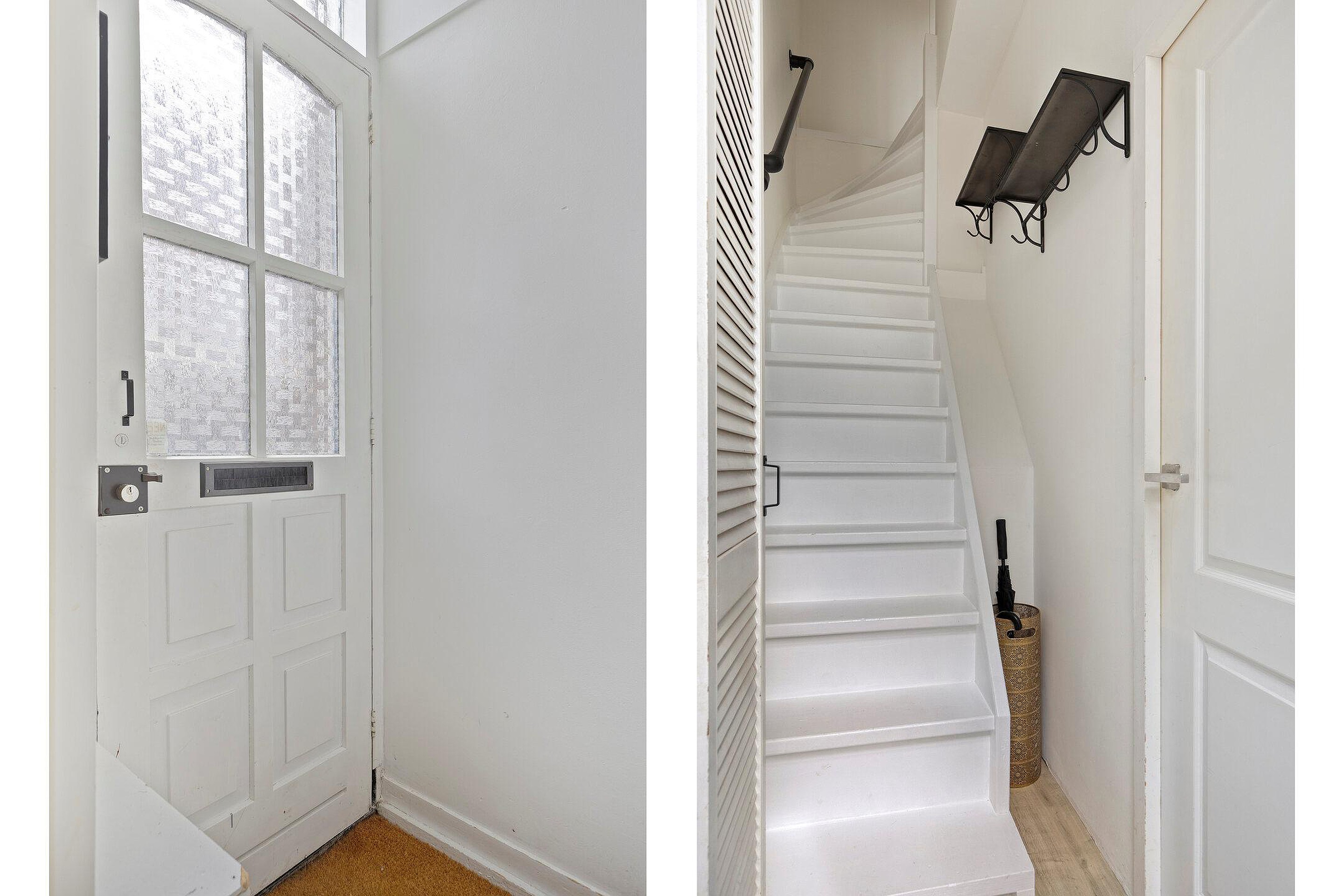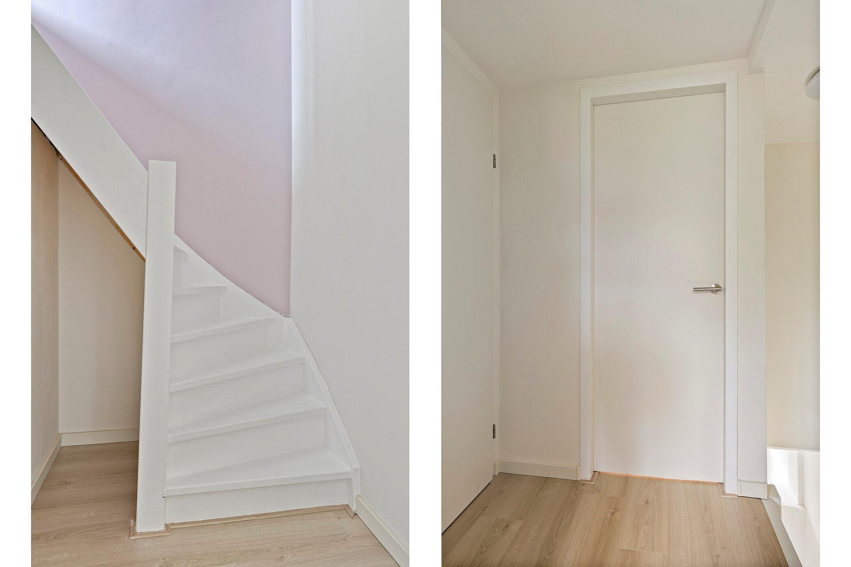Toegang tot de slaapkamers en toegang tot de tussenhal met trap naar de tweede verdieping.
