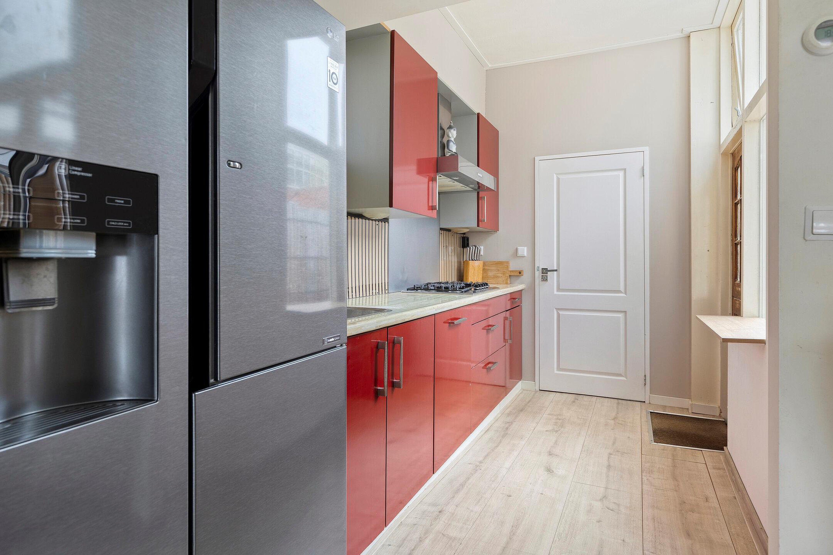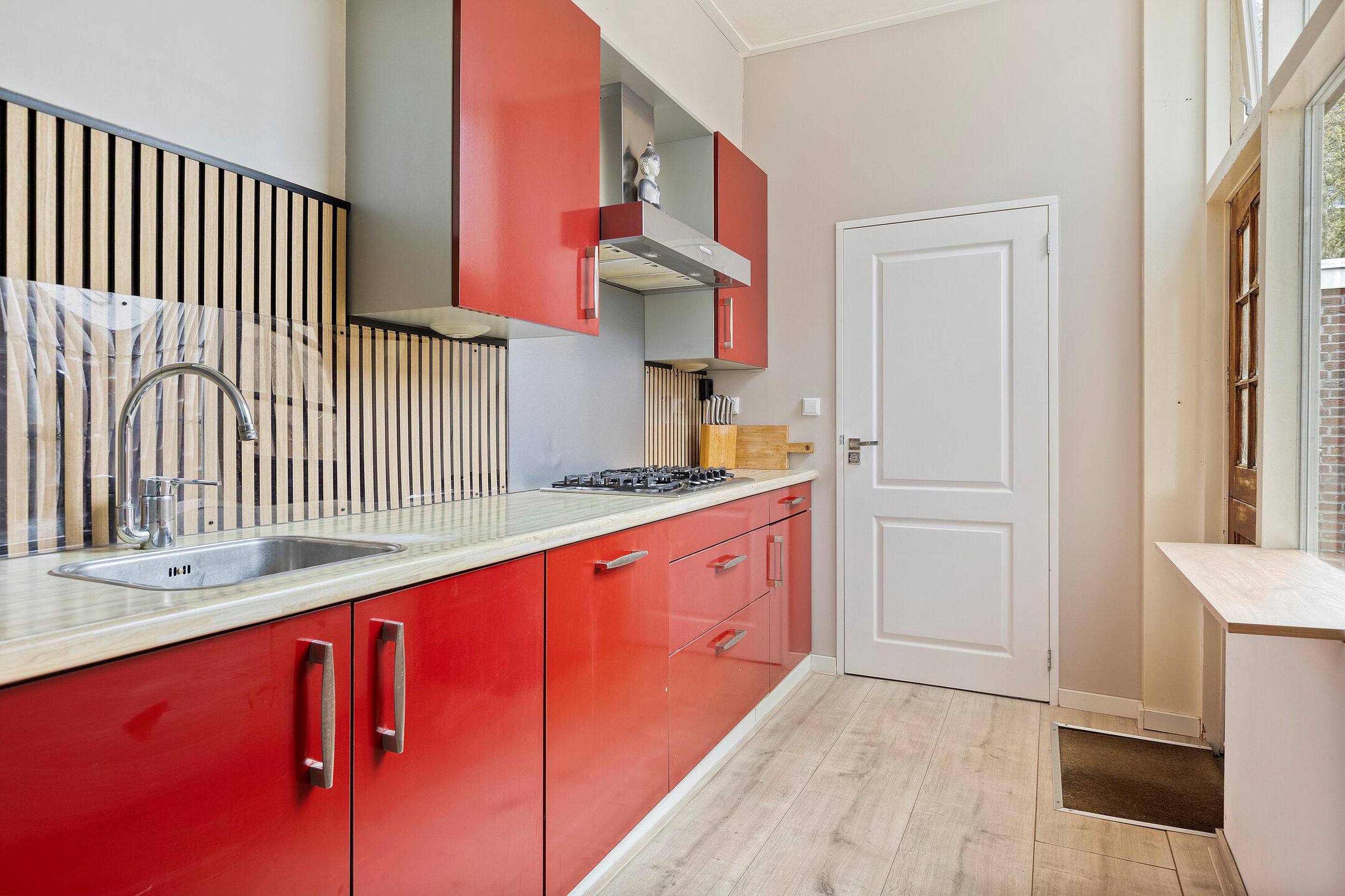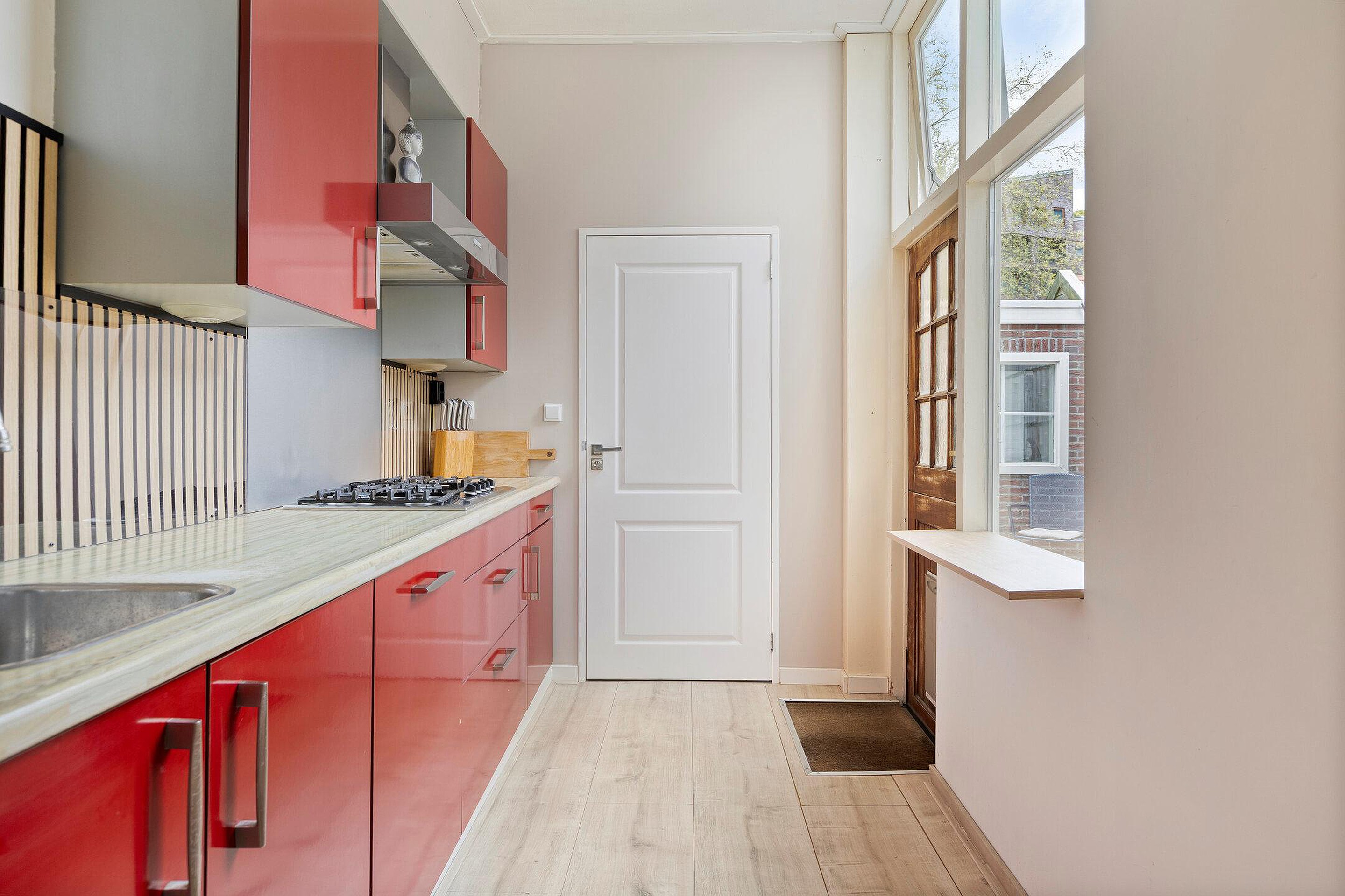 Nette open keuken voorzien van inbouwapparatuur en deur naar de tuin.