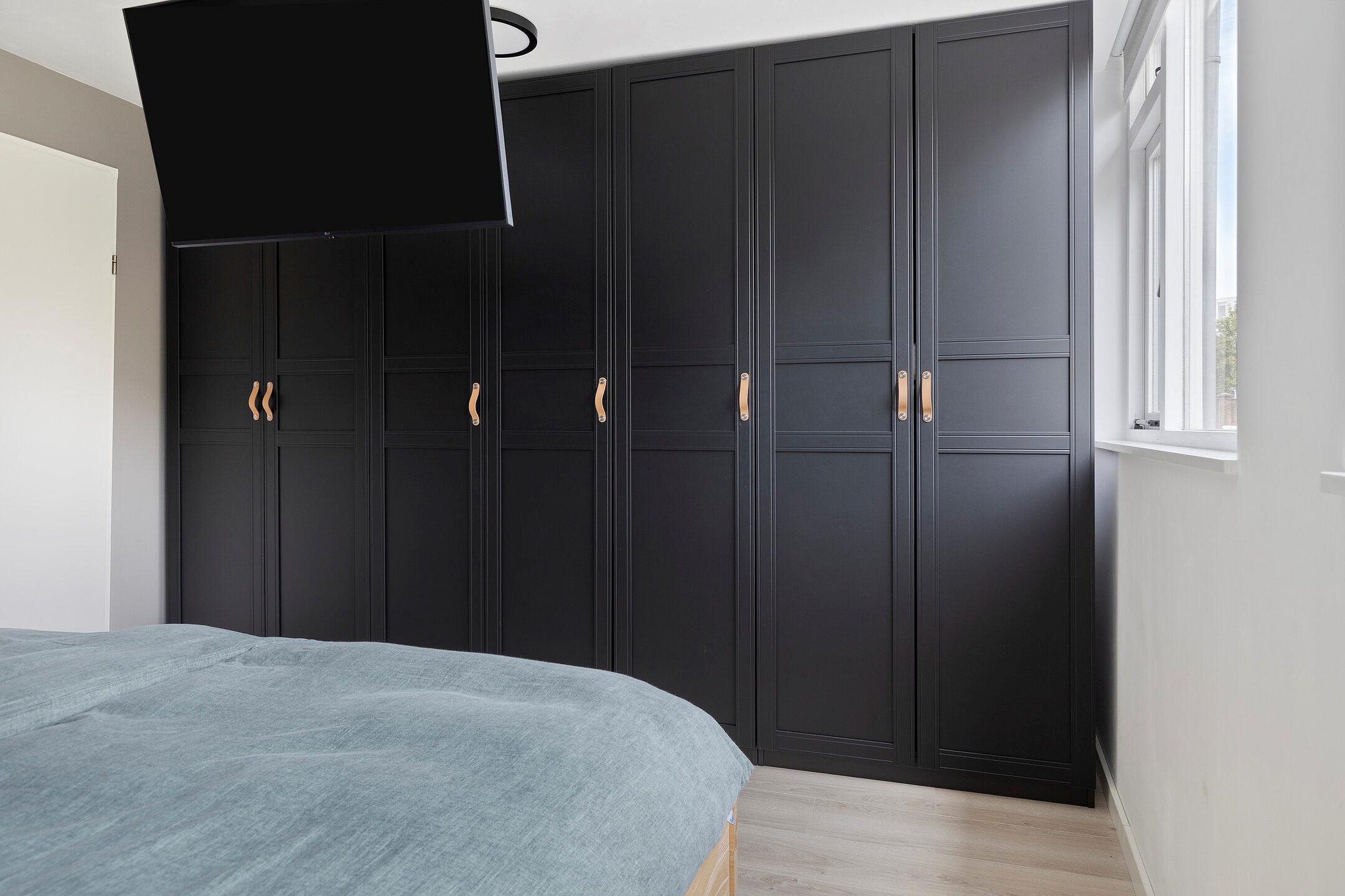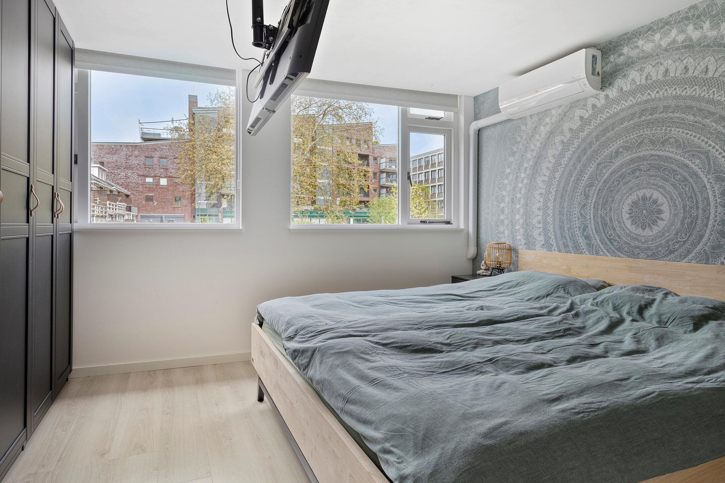 Ruime slaapkamer gelegen aan de achterzijde van de woning. Deze kamer is voorzien van een airco voor verwarmen en koelen.