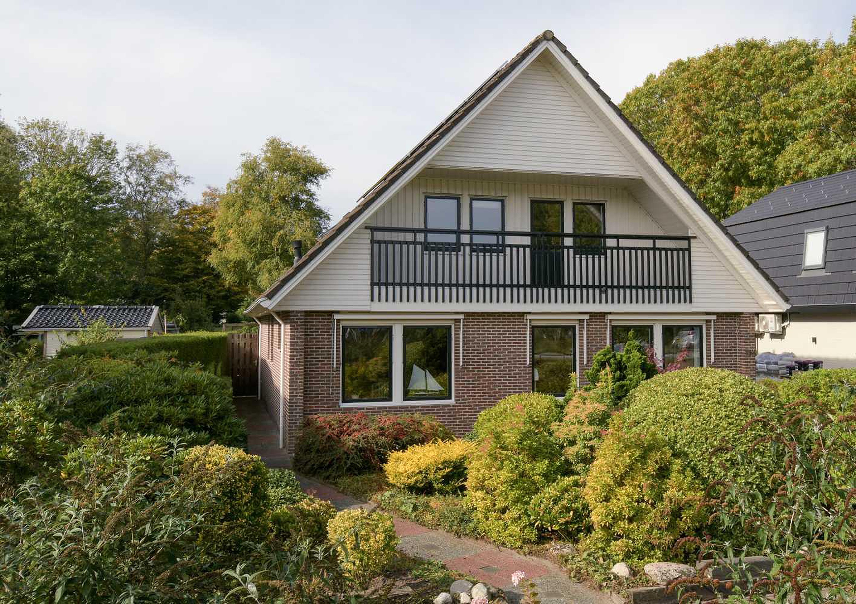 Bijzonder is dat de woning met energielabel A nagenoeg volledig voorzien is van triple glas. Aan beide zijden bevindt zich een inpandig balkon over de volle breedte van de woning. Op de zuidgevel van het dak liggen 12 zonnepanelen. Op de eerste verdieping bevinden zich 4 slaapkamers en een complete badkamer. Onder het huis is er ook nog een verrassend ruime kelder (ca 15 m2) met stahoogte en volledig betegeld – een unicum! Ideaal als opslag van proviand en wijn, maar ook groot genoeg voor bv. een gym.