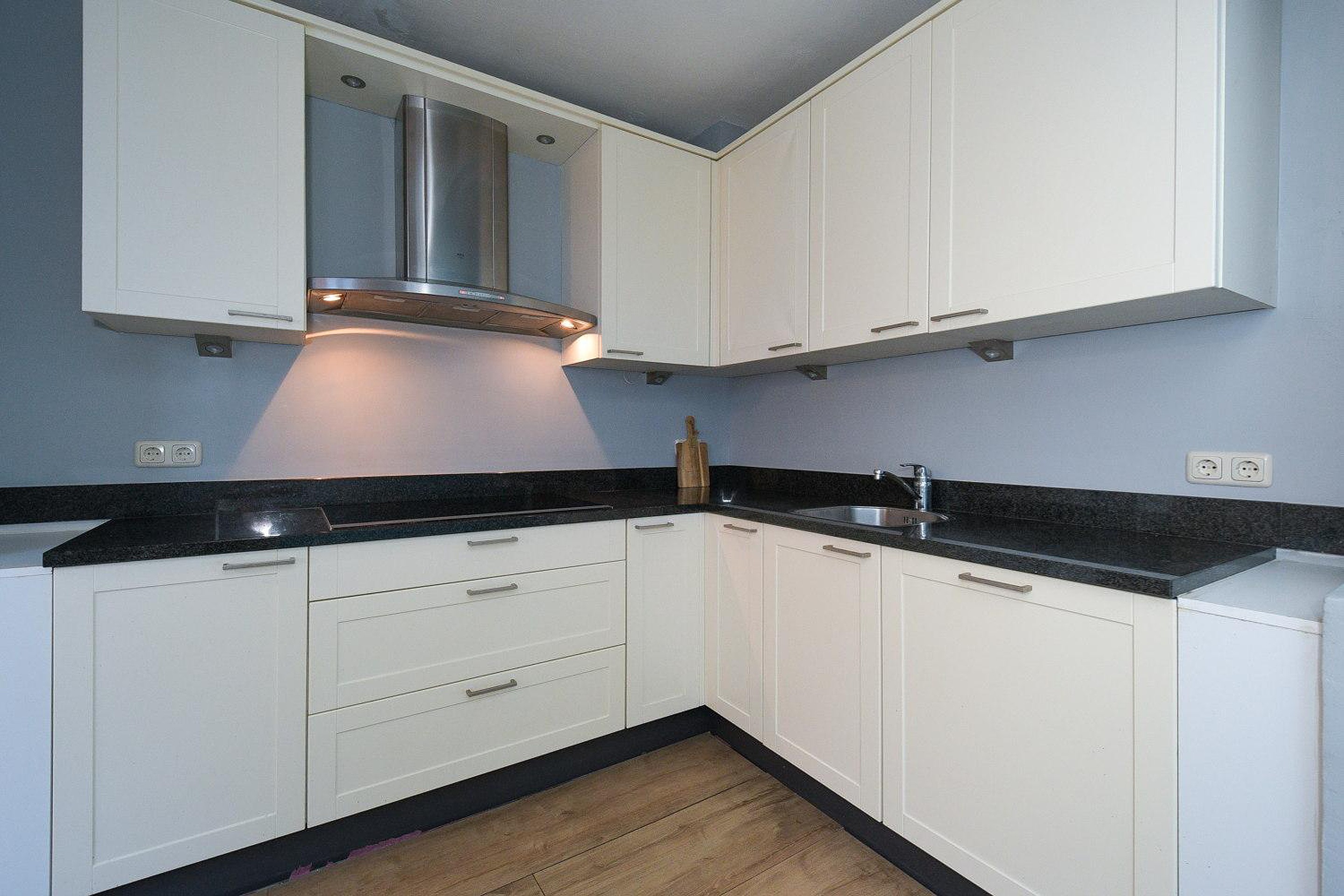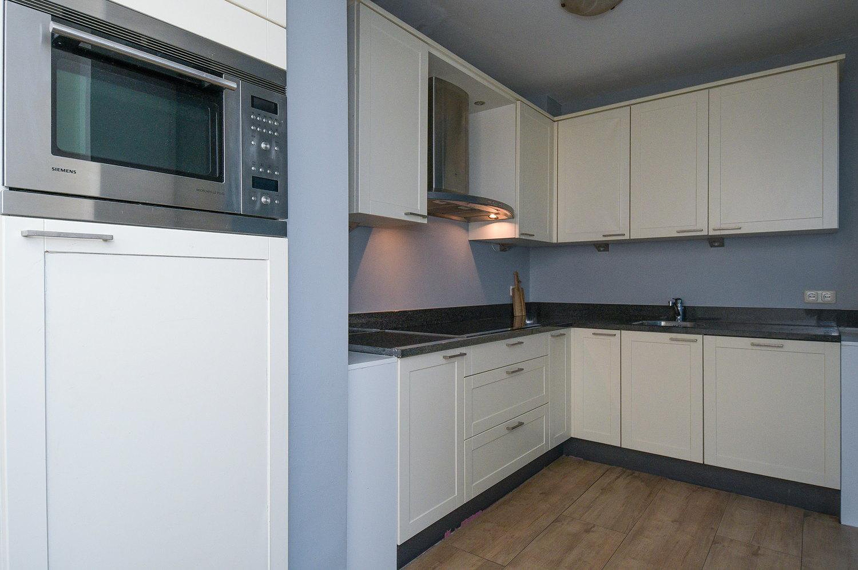 De moderne luxe open keuken beschikt over een natuurstenen werkblad met diverse inbouwapparatuur; inductie kookplaat, vaatwasser, magnetron (allen Siemens), koelkast en een afzuigkap (AEG). In de aangebouwde bijkeuken (2022) bevinden zich de witgoed aansluitingen.