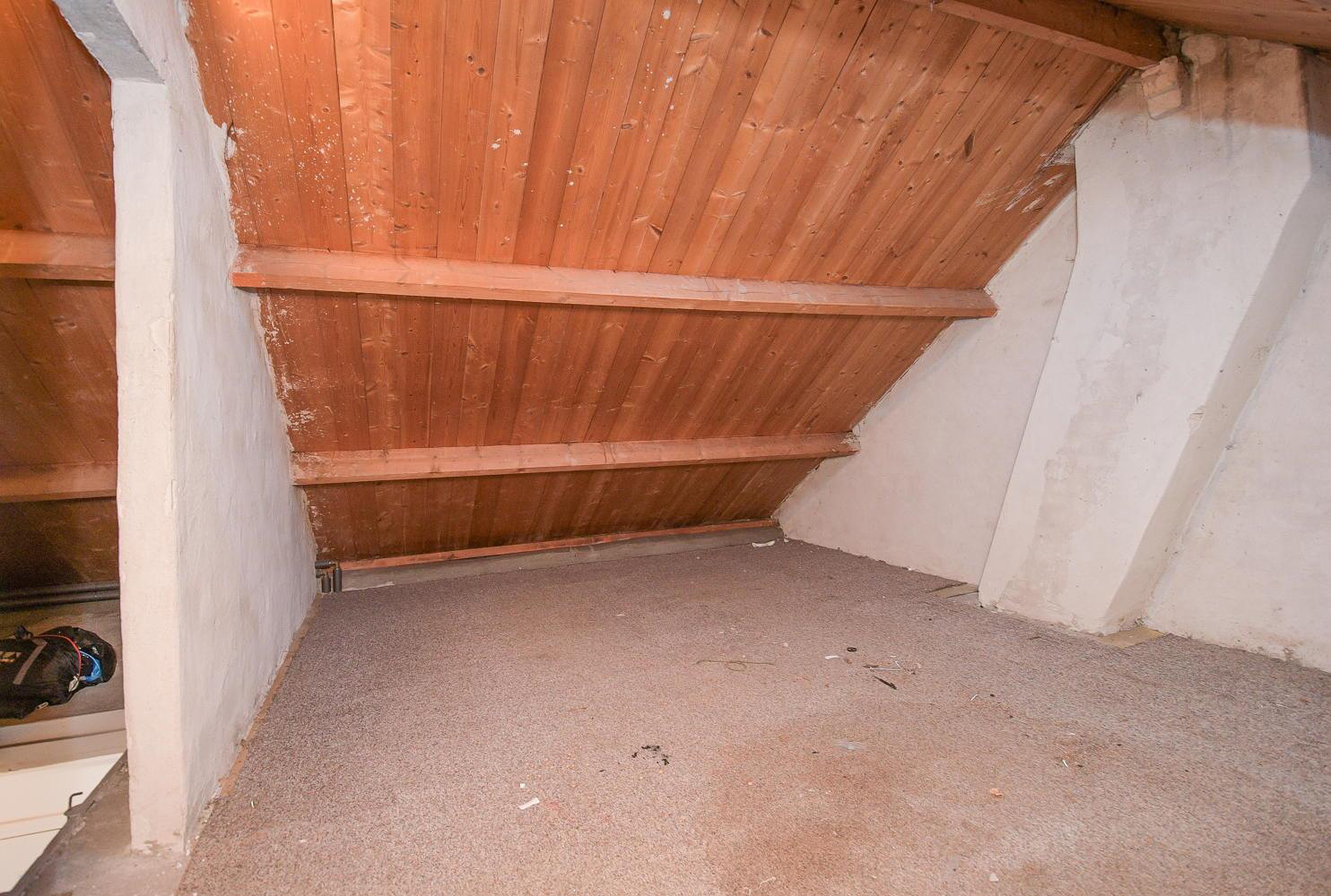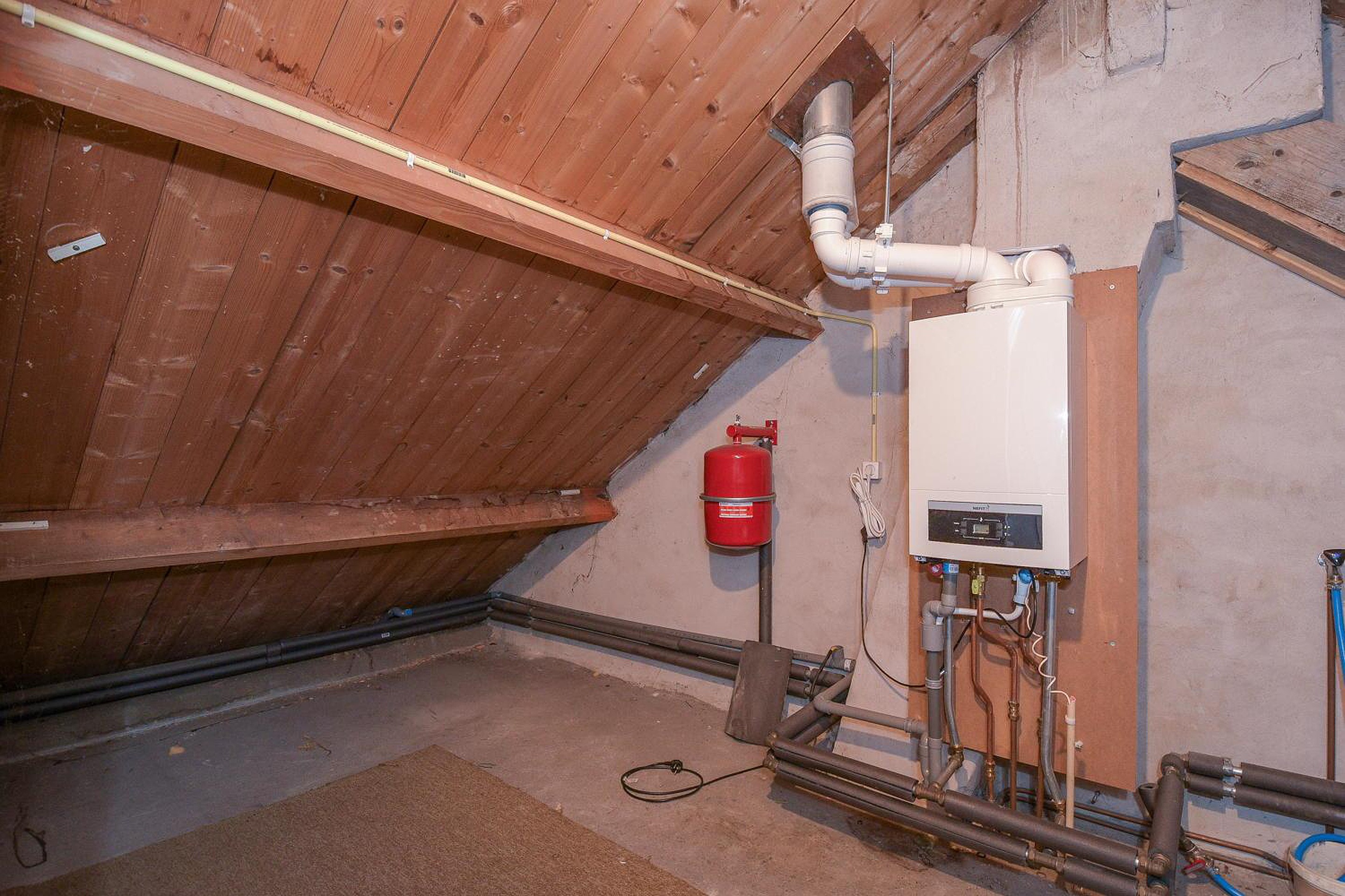 Via een vlizotrap kom je op de zolderruimte, welke geschikt is als bergruimte. Hier bevindt zich de HR CV ketel (2023) van het merk Nefit.