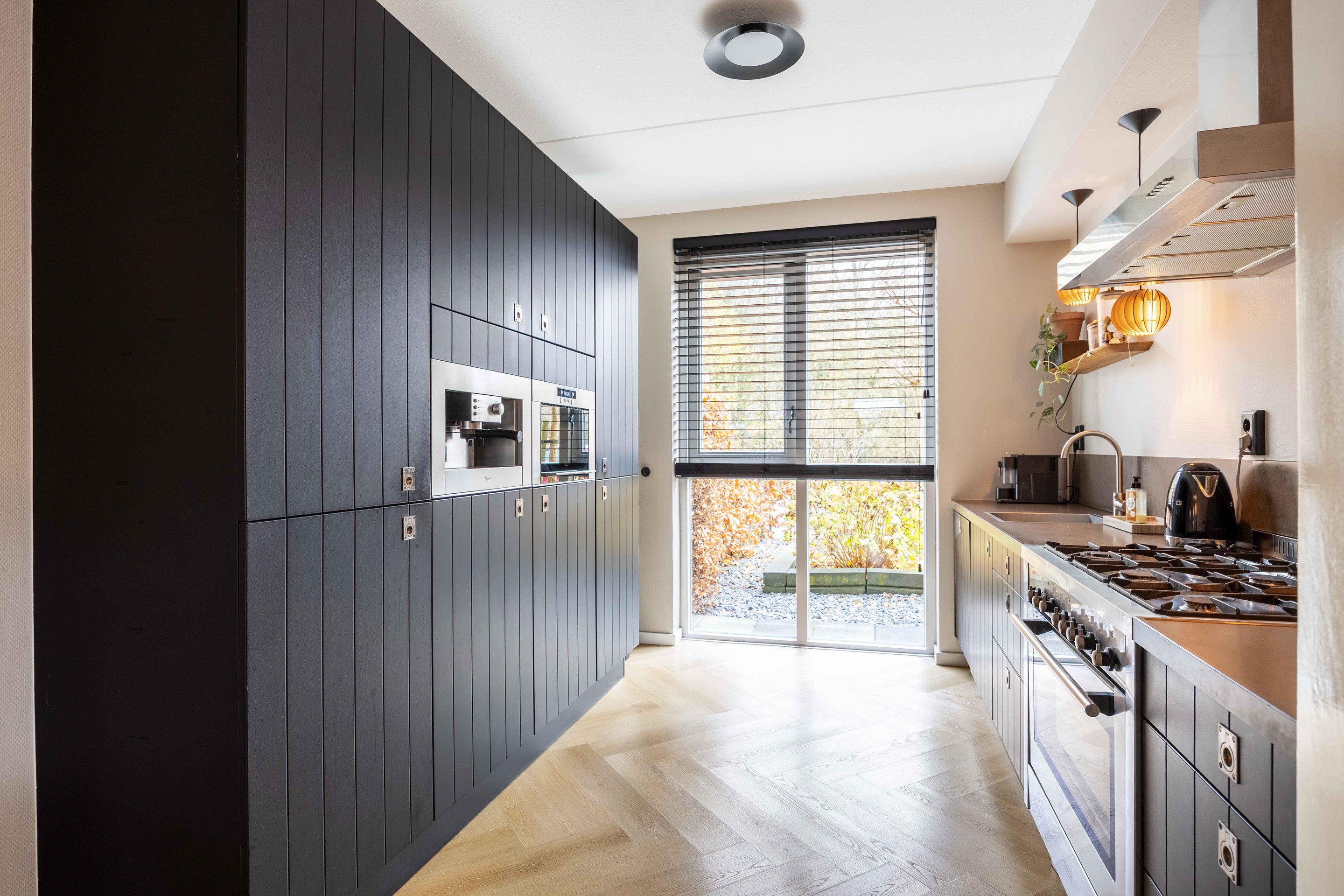Via de entree met ruime hal, meterkast, bergkast, toilet en trapopgang, stapt u door naar de woonkamer welke tuingericht is. De woonkamer vormt het hart van het huis. Een plek waar u via de achterdeur zo de achtertuin instapt. De wanden zijn strak afgewerkt en er ligt een visgraat pvc-vloer. De open keuken ligt aan de voorzijde van de woning en is volledig ingericht. Deze goed en netjes onderhouden keuken is voorzien van 6-pits gasfornuis met oven, magnetron, koelkast, vriezer, ingebouwd koffiezetapparaat en vaatwasser.