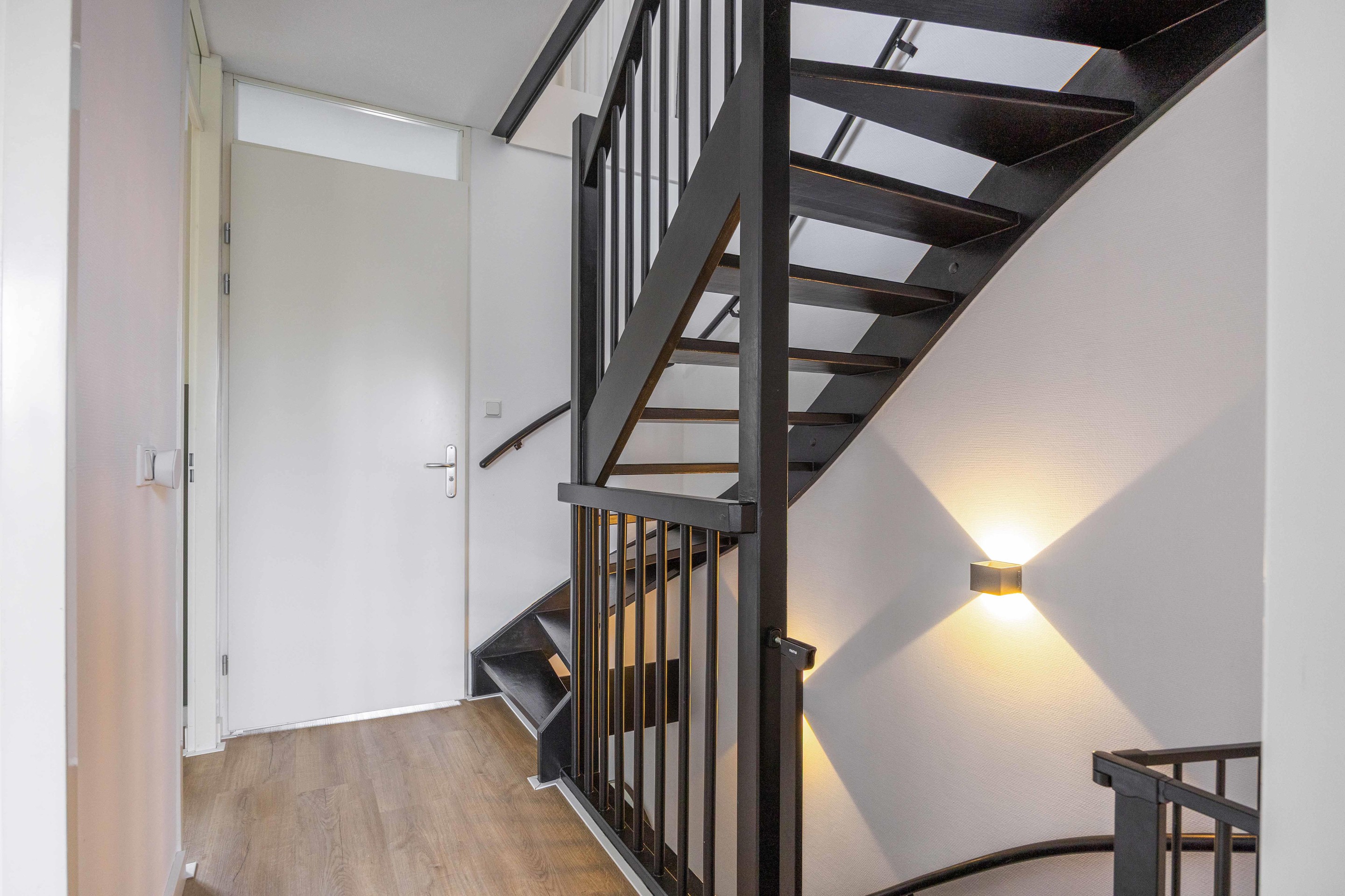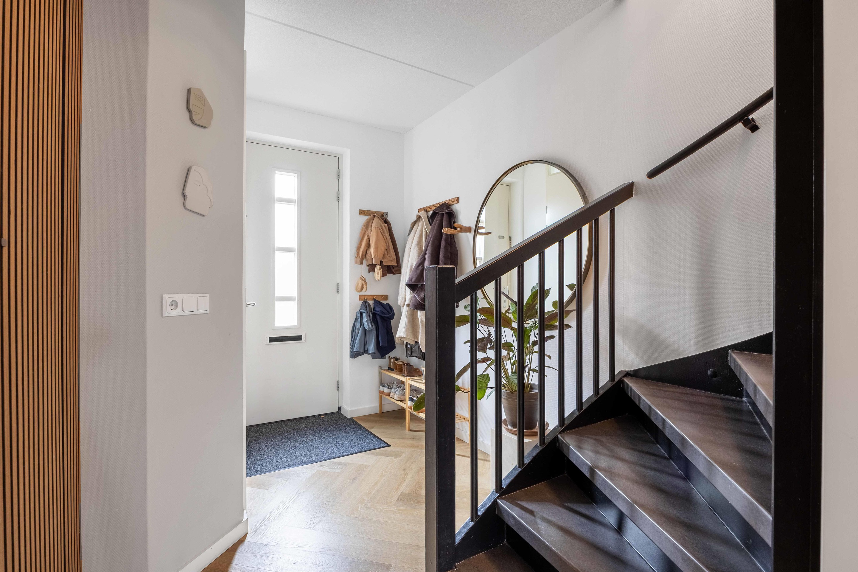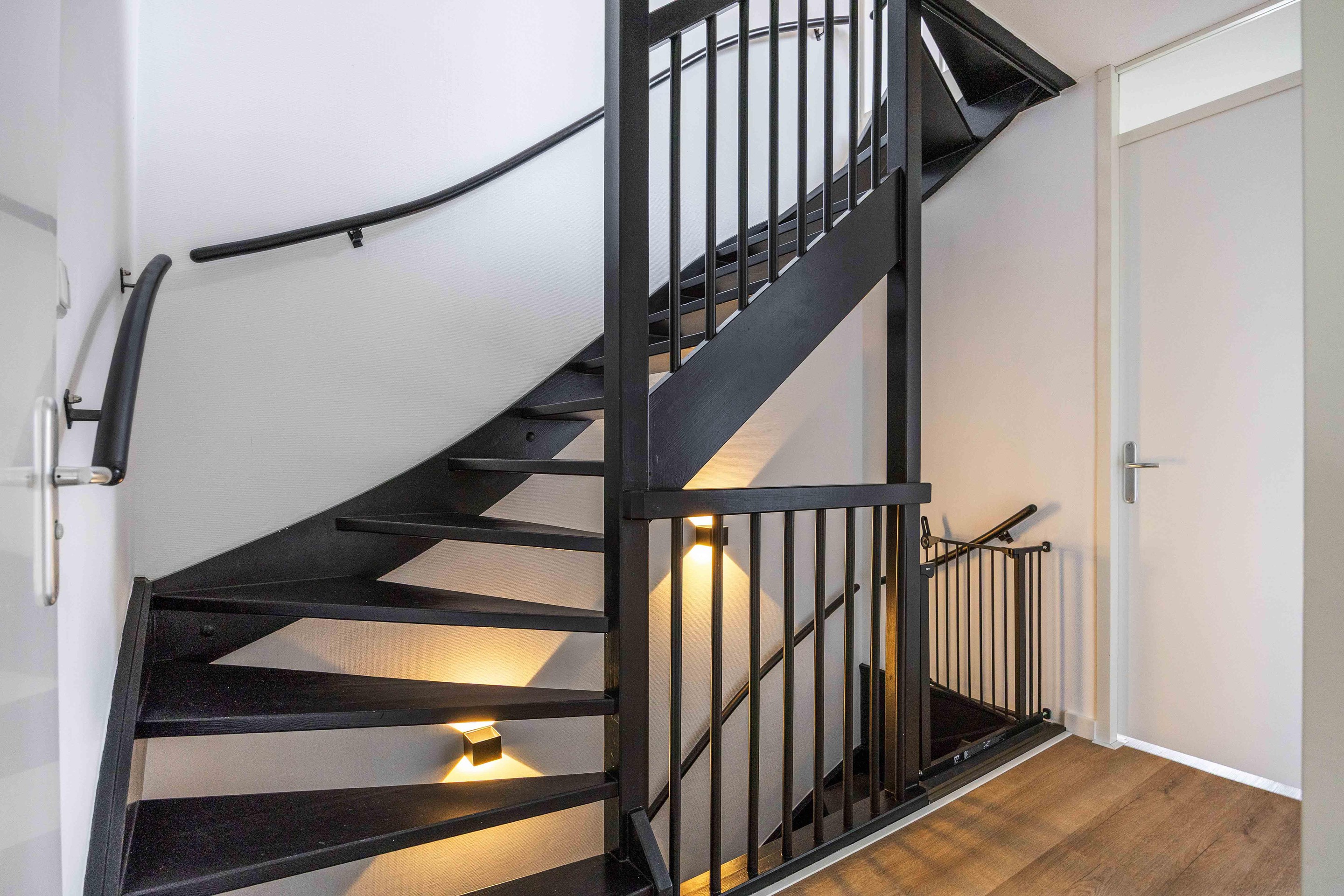 De trapkast in de woonkamer zorgt voor extra opbergruimte.