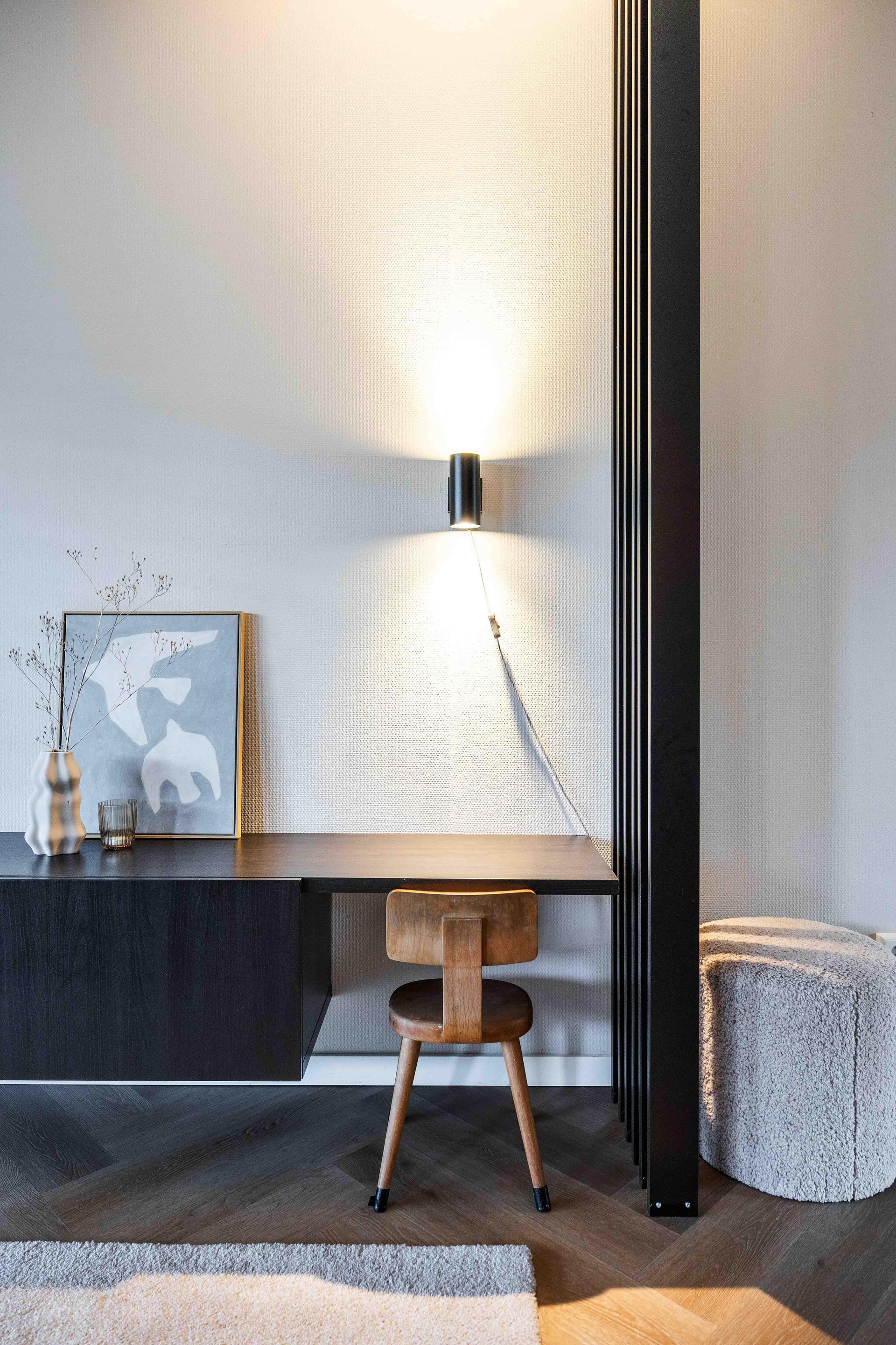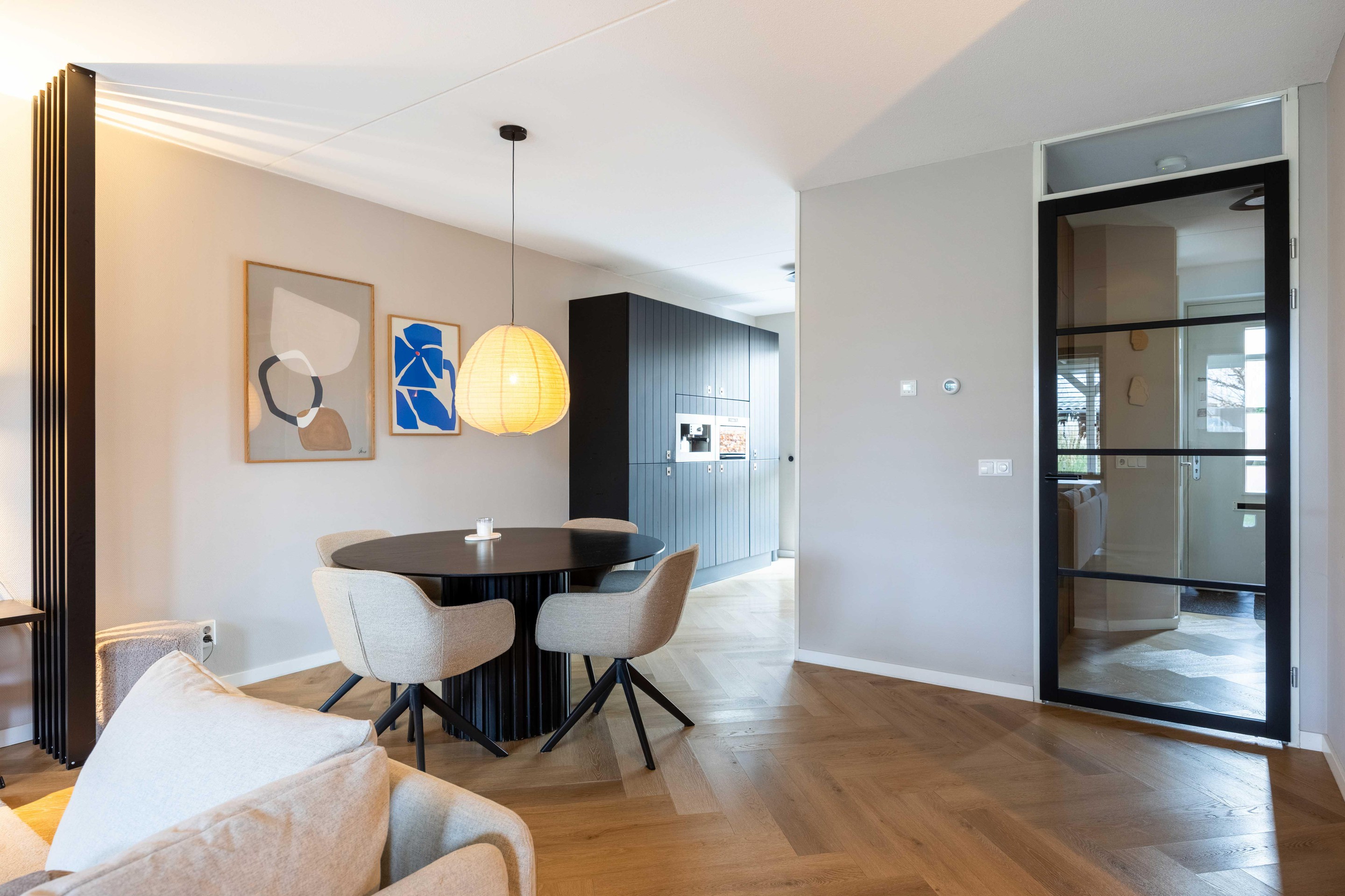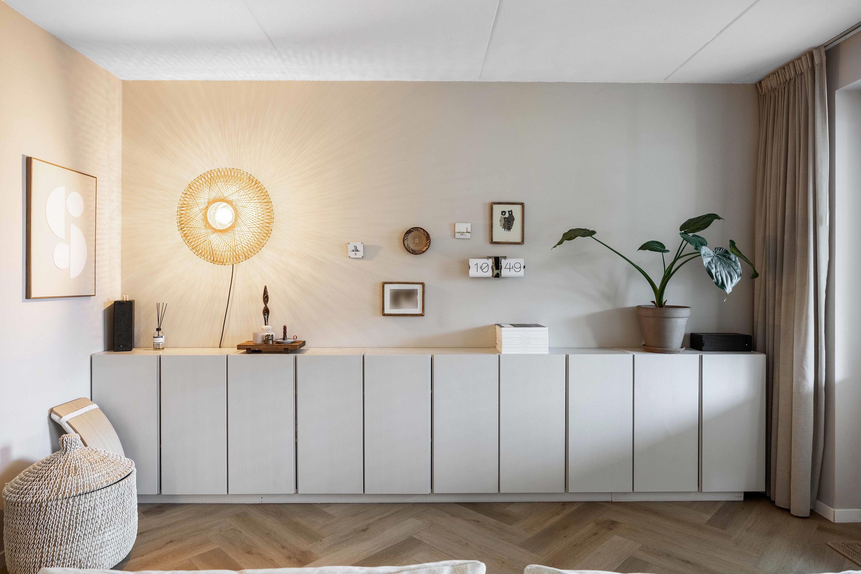 De trapkast in de woonkamer zorgt voor extra opbergruimte.